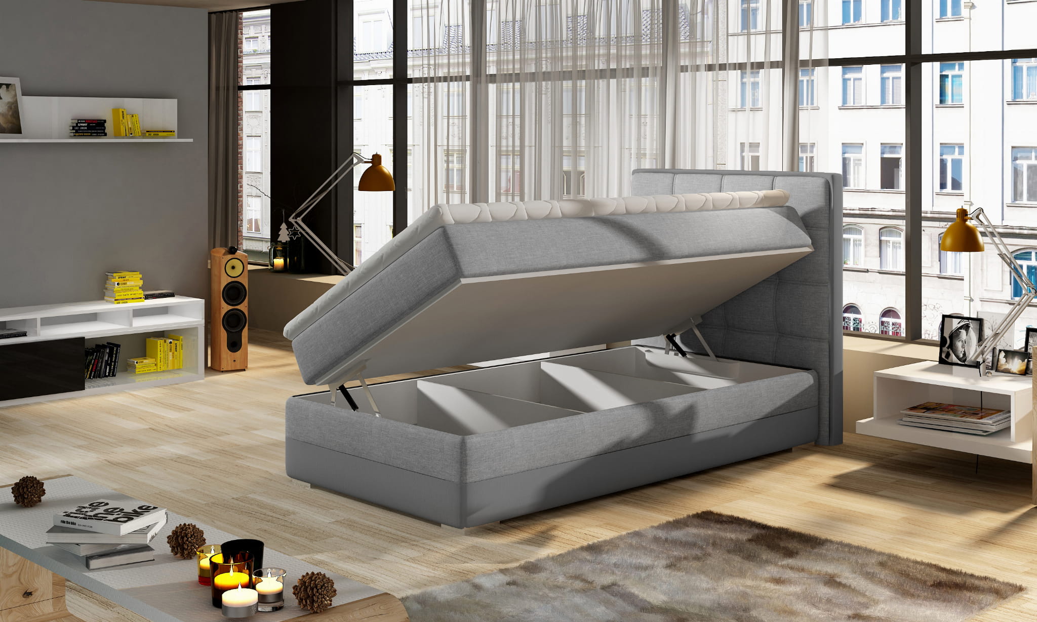 Model ASTER to jednoosobowy boxspring obszyty dwukolorową tapicerką z miękkiego, odpornego na przetarcia materiału. Obramowanie zagłowia oraz dolna część skrzyni utrzymana jest w jednolitym kolorze, natomiast pozostała część łóżka posiada kontrastujący odcień. W ofercie dostępne są zarówno klasyczne, stonowane zestawienia kolorystyczne, jak i nieco bardziej wyraziste, dedykowane miłośnikom oryginalnych wnętrz. Możliwość dopasowania zestawu kolorystycznego tapicerki pozwala dopasować ostateczny wygląd mebla do ogólnej aranżacji. Na efekt nowoczesności i elegancji wpływają również dodatkowe zdobienia zagłowia w postaci ozdobnych kwadratowych przeszyć i delikatnych pikowań. Boxspring ASTER to również synonim funkcjonalności – łóżko wyposażone jest w obszerny pojemnik na pościel, który jest dostępny po uniesieniu górnej części mebla, co dzięki możliwości wyboru strony otwierania, sprężynowemu mechanizmowi i dodatkowym uchwytom nie stanowi najmniejszego problemu.