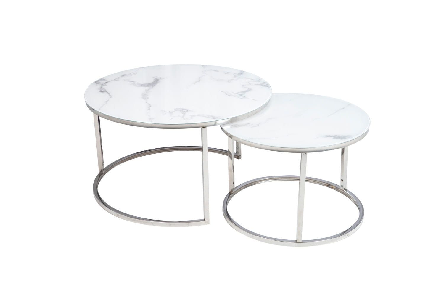 Zestaw ław, blat: szkło, stelaż: metal, kolor: biały, efekt marmuru / chrom. Wymiary mniejszego stolika fi: 60, h-42cm.