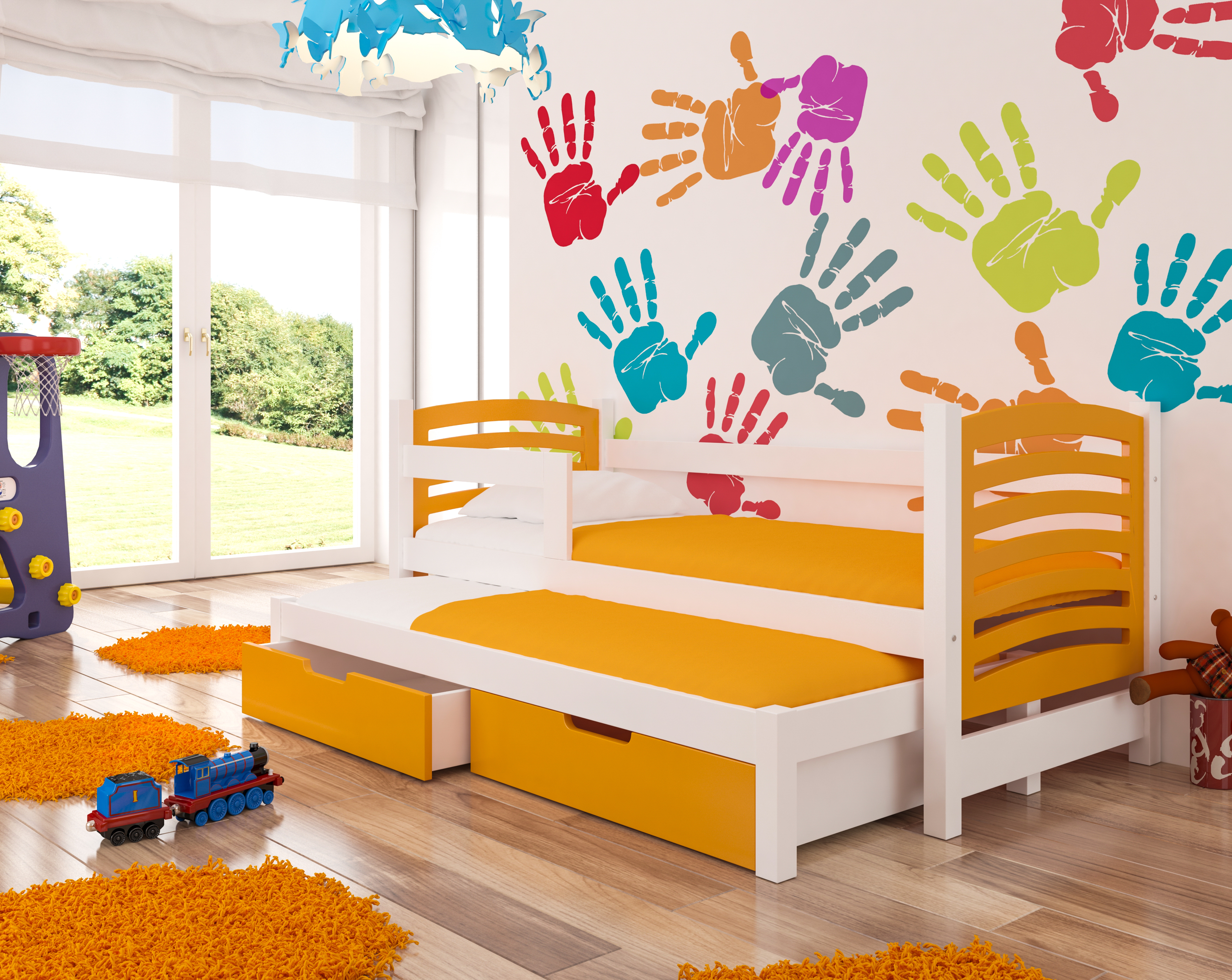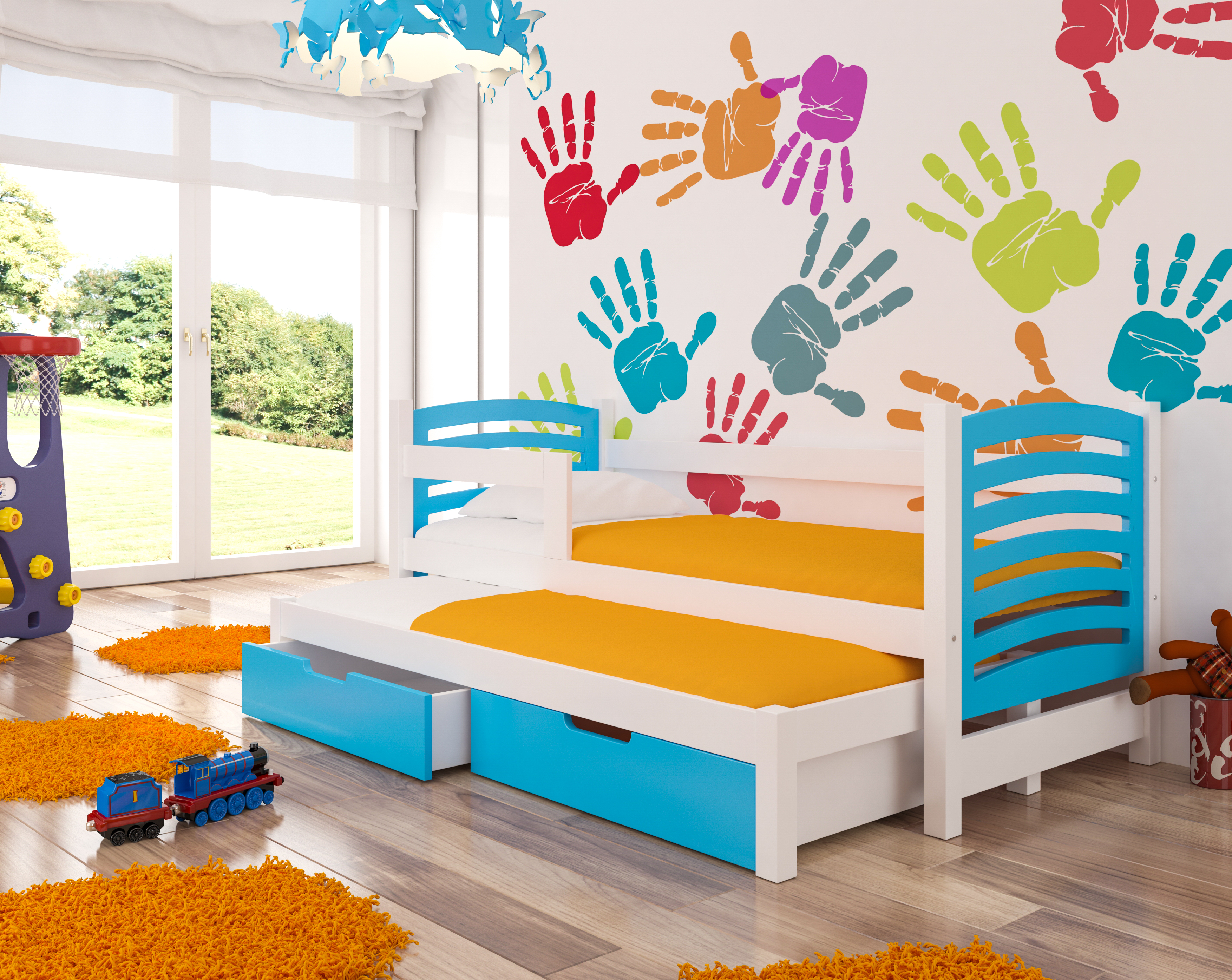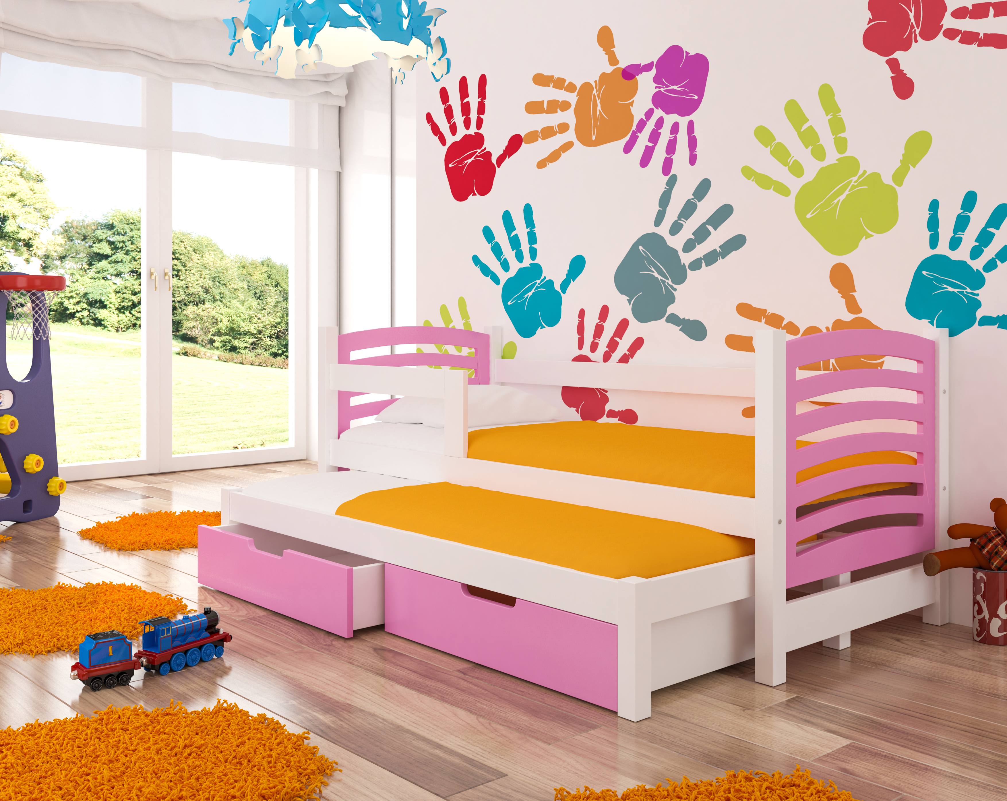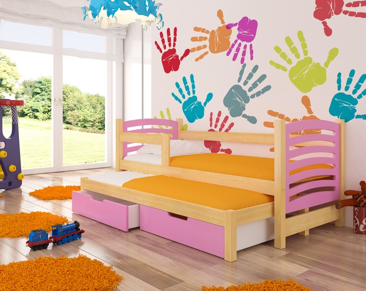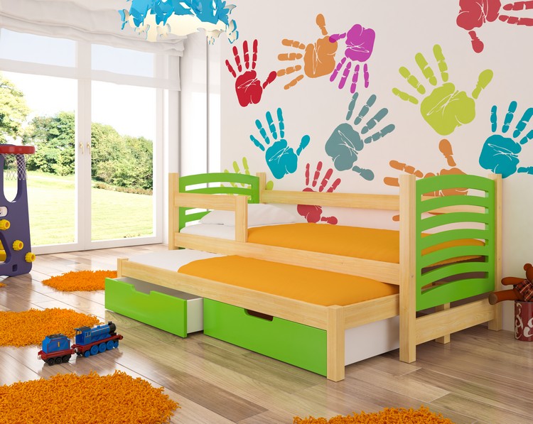 Kompletne dwu poziomowe łóżko wraz z materacami oraz szufladami.