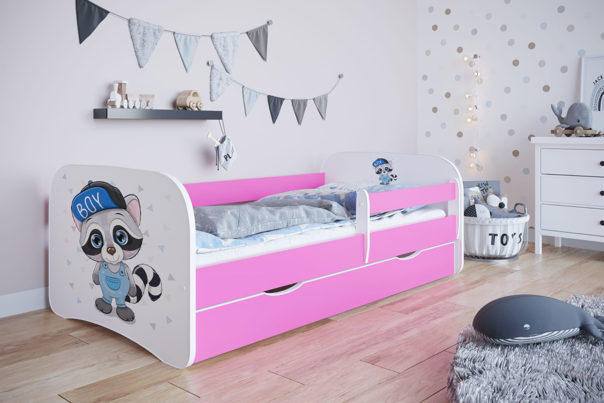 Łóżko wykonane jest z wysokiej jakości płyty meblowej, dostępne w kilku wariantach kolorystycznych.