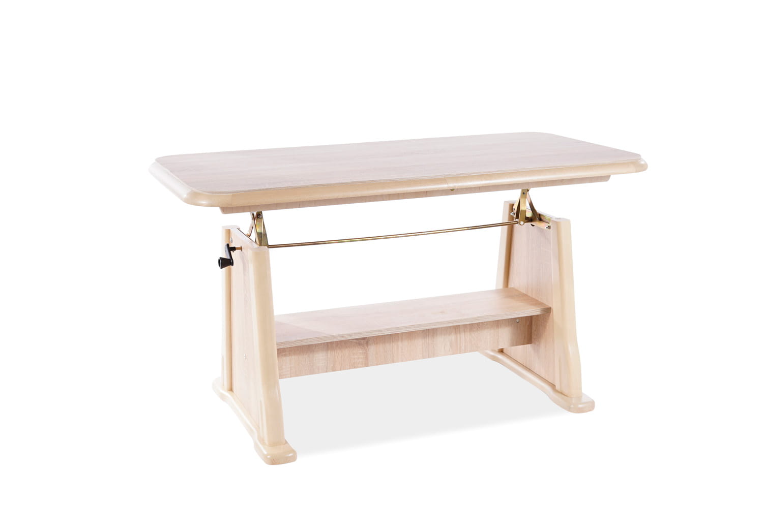 Ławostół, blat: płyta laminowana, stelaż: drewno, kolor: dąb sonoma. Długość po rozłożeniu 170cm, płynna regulacja podnoszenia blatu, maksymalna wysokość 77 cm.