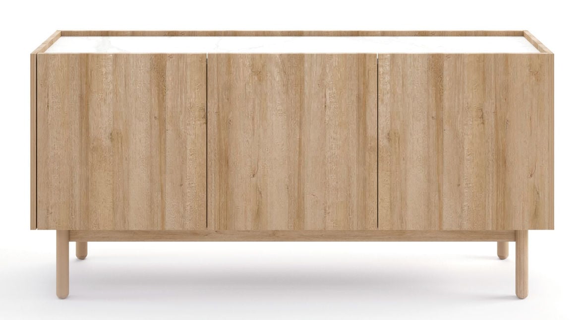 Piękne usłojenie drewnianych nóżek i jasnego dekoru Dąb Riviera. Korpus i fronty w tym wybarwieniu otaczają górny blat w dekorze marmuru Bianco, przypominając kształty tacy na zwieńczeniach wszystkich pięciu komód i szafek.
