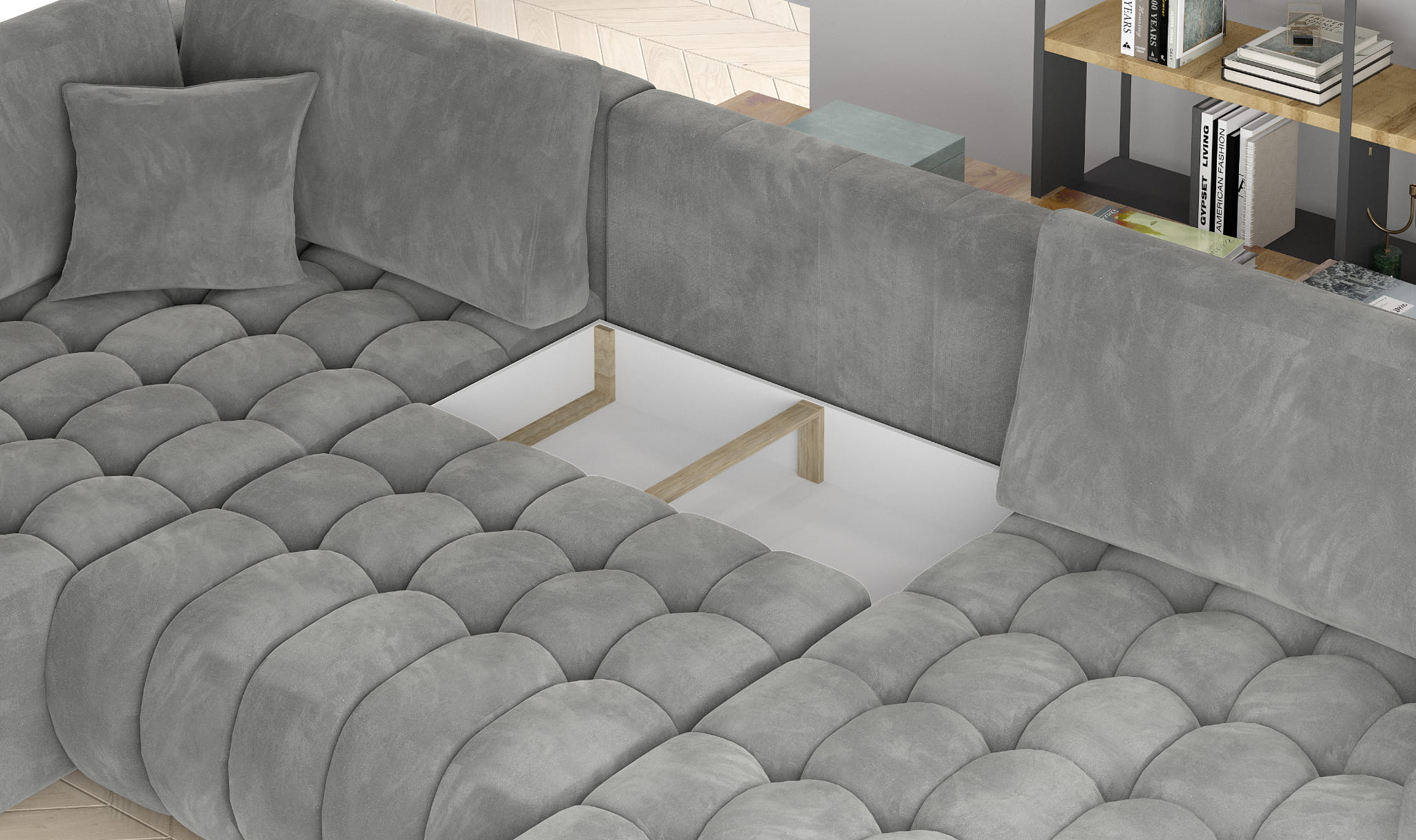 Bonito to wyjątkowy narożnik pokaźnych gabarytów, który z jednej strony spełnia funkcję głównego elementu wyposażenia twojego wnętrza i zarazem serca salonu, a z drugiej jest on wysoce funkcjonalnym meblem wyposażonym w funkcję spania. Przemienienie wygodnego narożnika w bardzo duże i wygodne łóżko z obszernym pojemnikiem na pościel, przebiega prosto i intuicyjnie, gdyż odbywa się za pomocą mechanizmu DL.