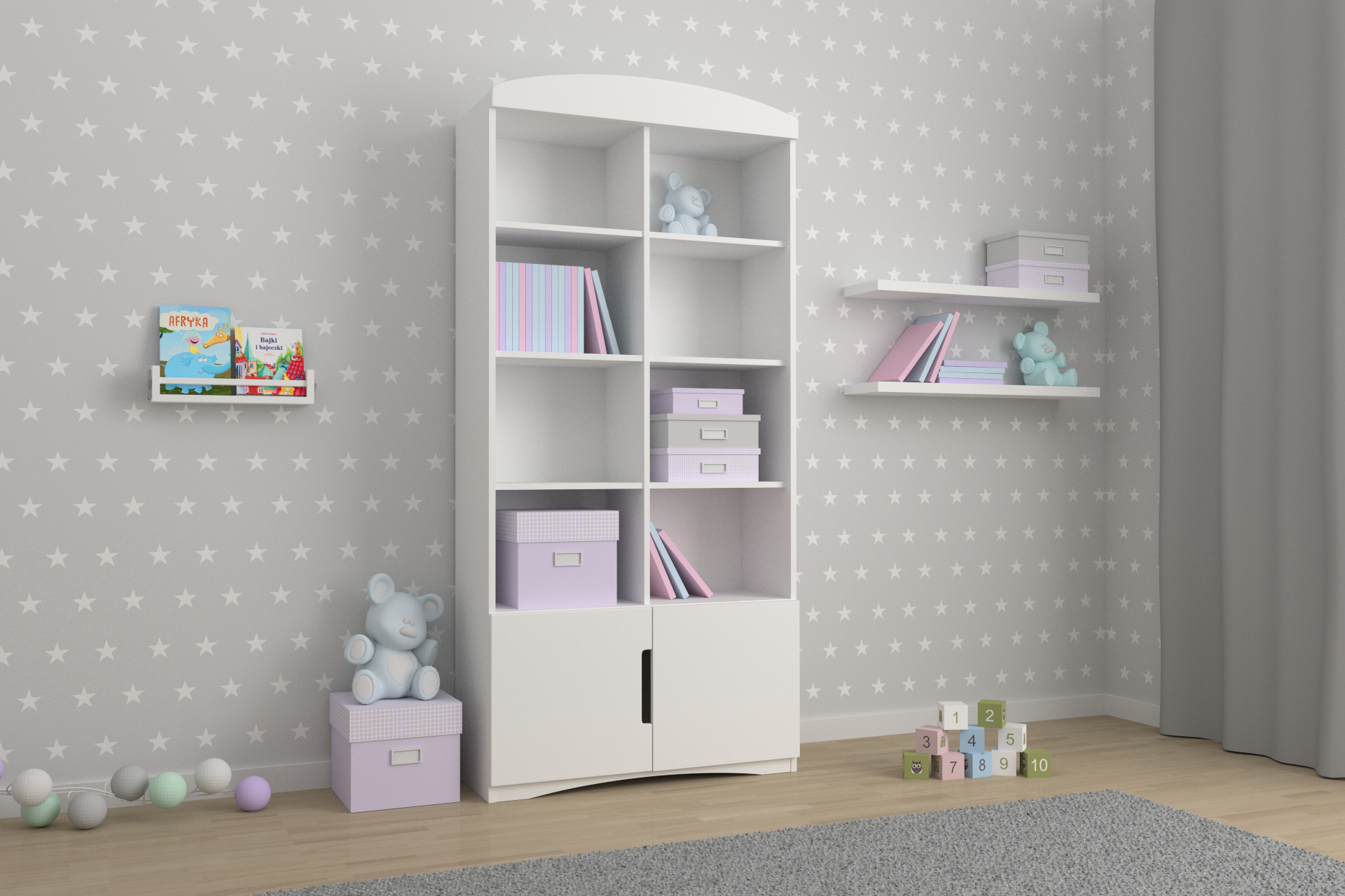 Regał wykonany jest z laminowanej płyty meblowej o grubości 18 mm. Posiada 8 otwartych półek o wymiarach 30x42x34 i 2 zamknięte półki o wymiarach 42x42x34cm. Wymiary:
