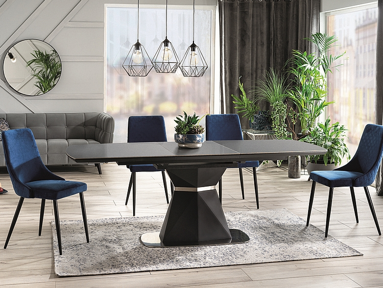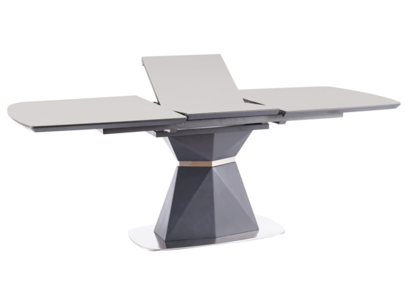 Stół rozkładany, blat: MDF+szkło hartowane, stelaż: MDF+stal szczotkowana, kolor: szary / antracyt mat.