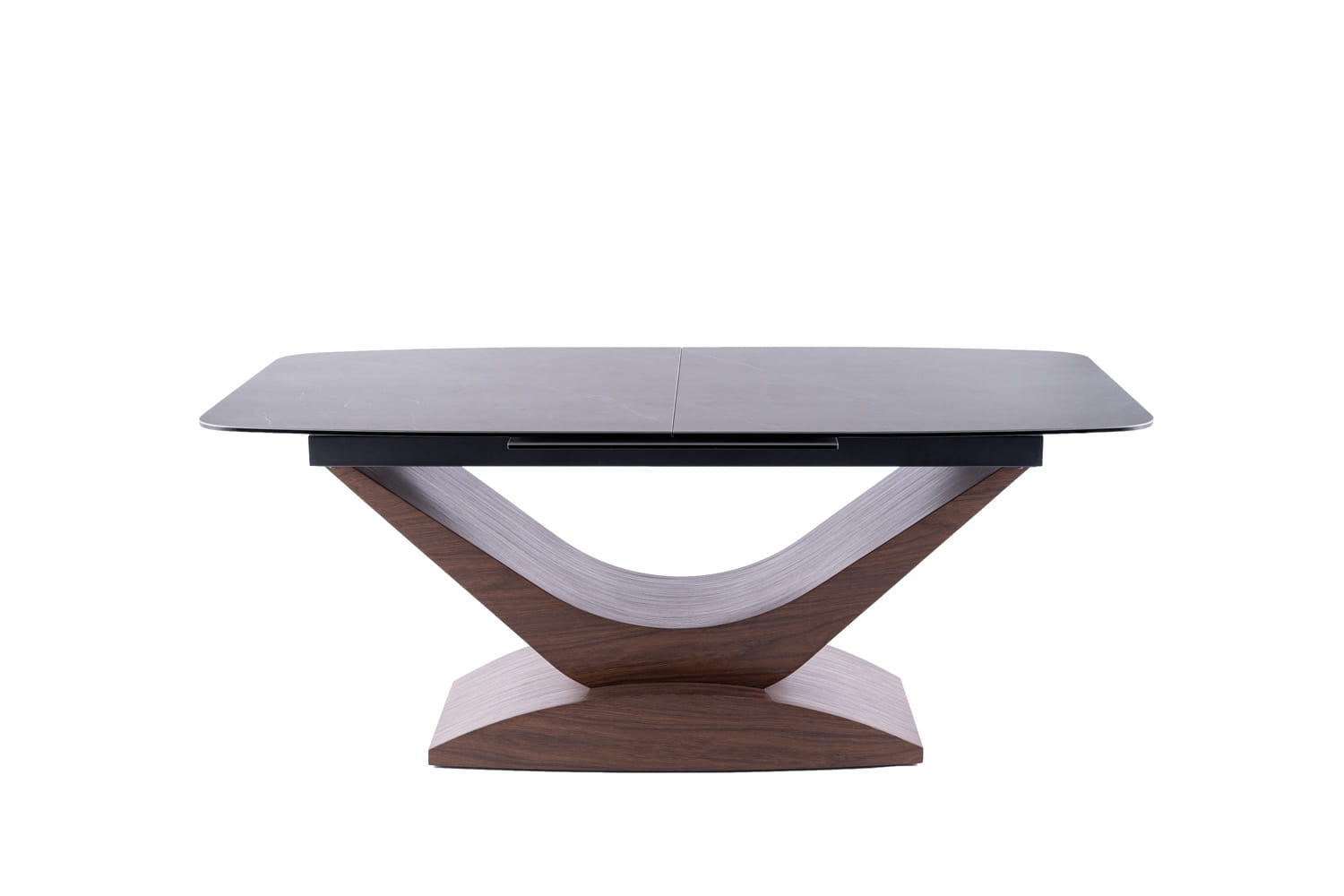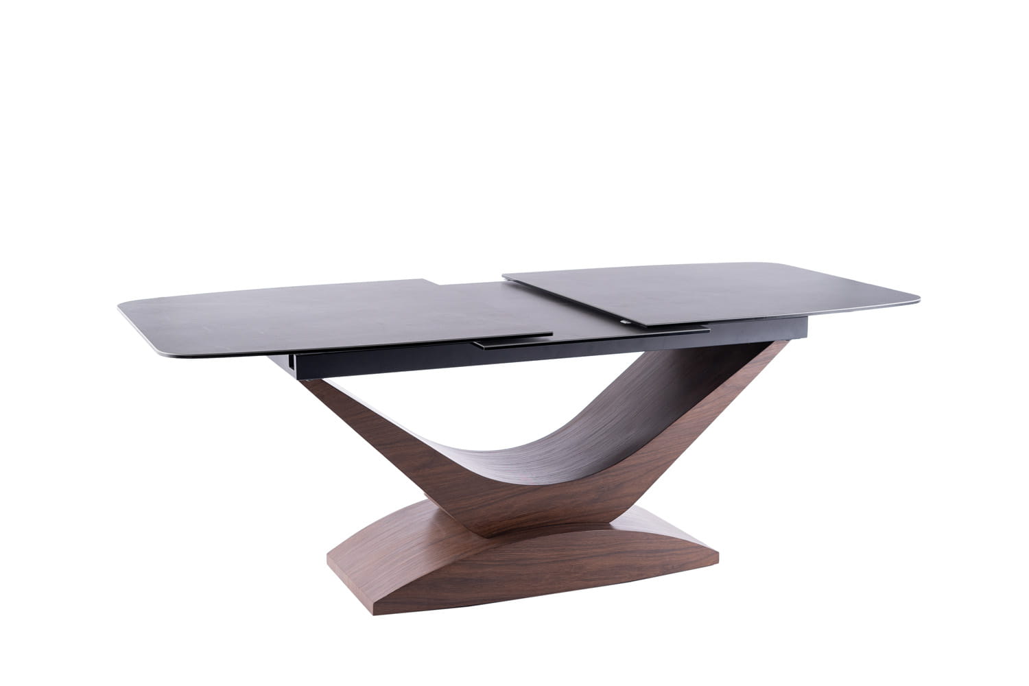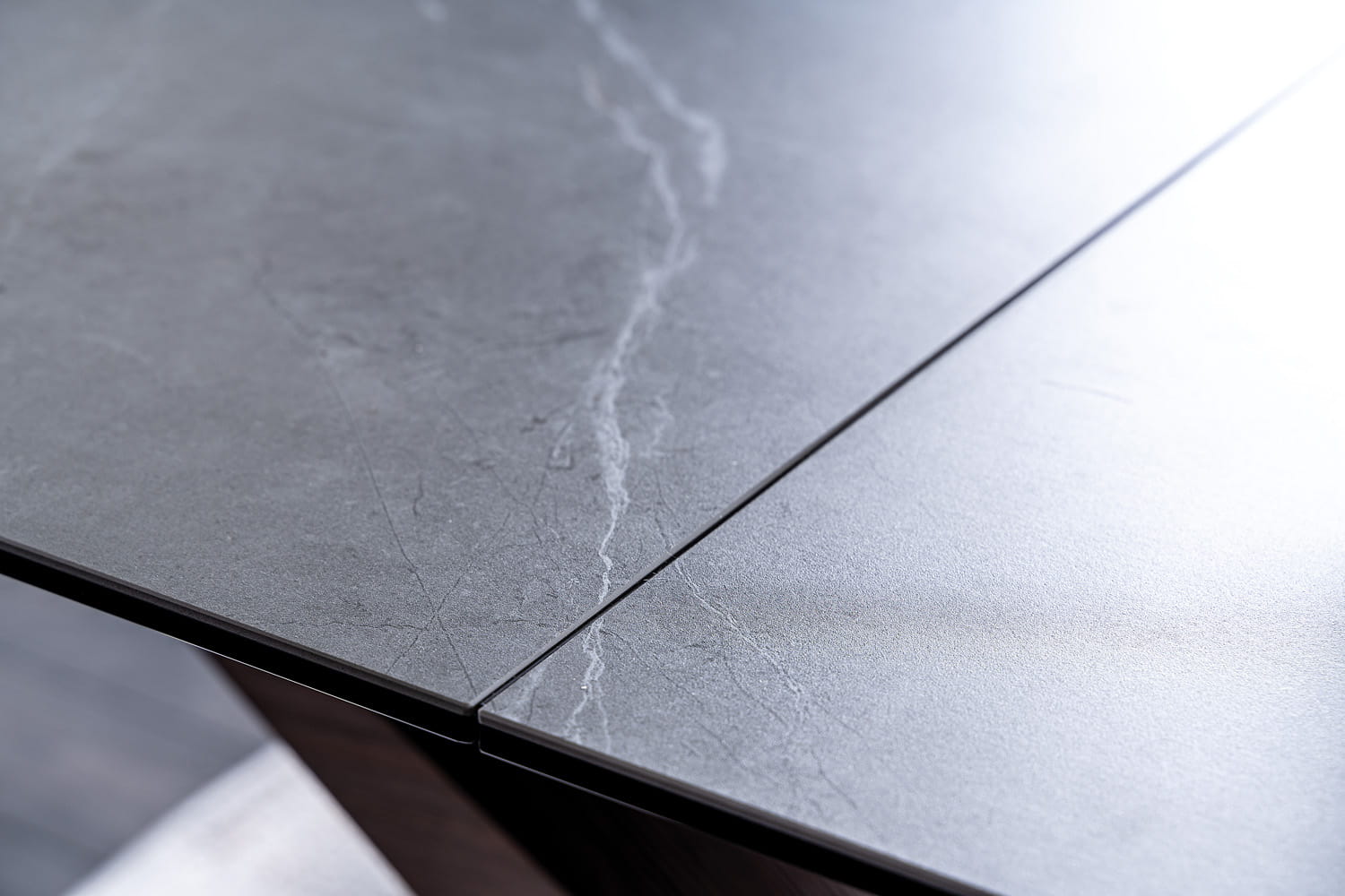 Stół rozkładany, blat: szkło hartowane + włoska ceramika, efekt marmuru, stelaż: MDF, kolor: szary / orzech.