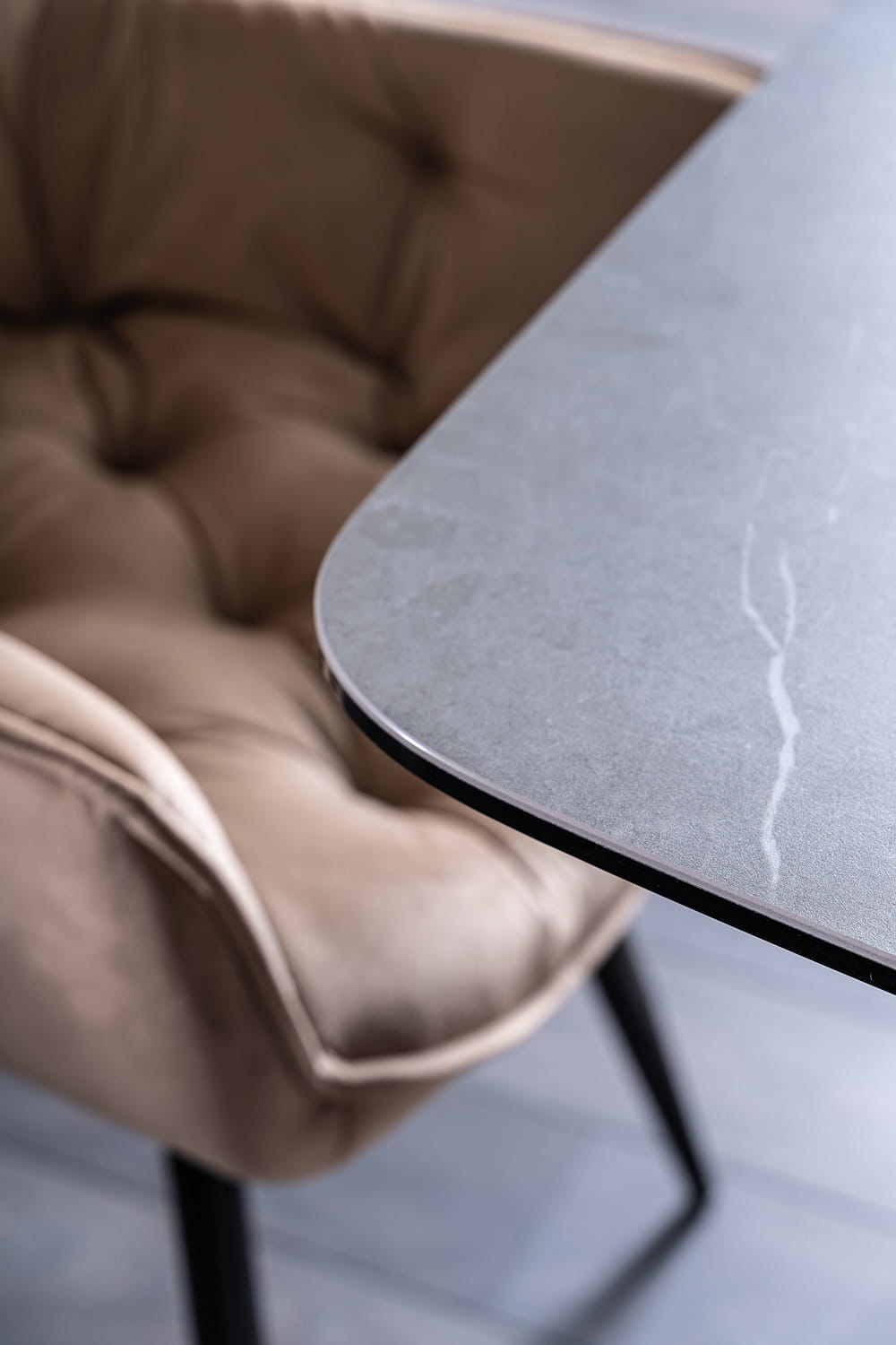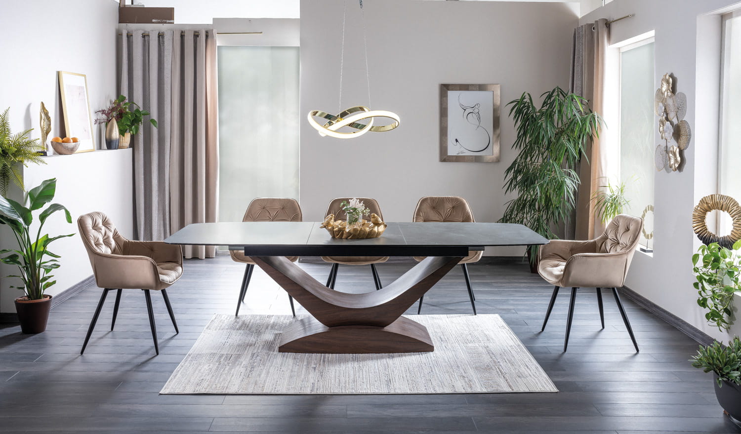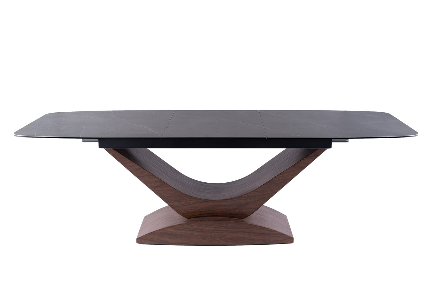 Stół rozkładany, blat: szkło hartowane + włoska ceramika, efekt marmuru, stelaż: MDF, kolor: szary / orzech.