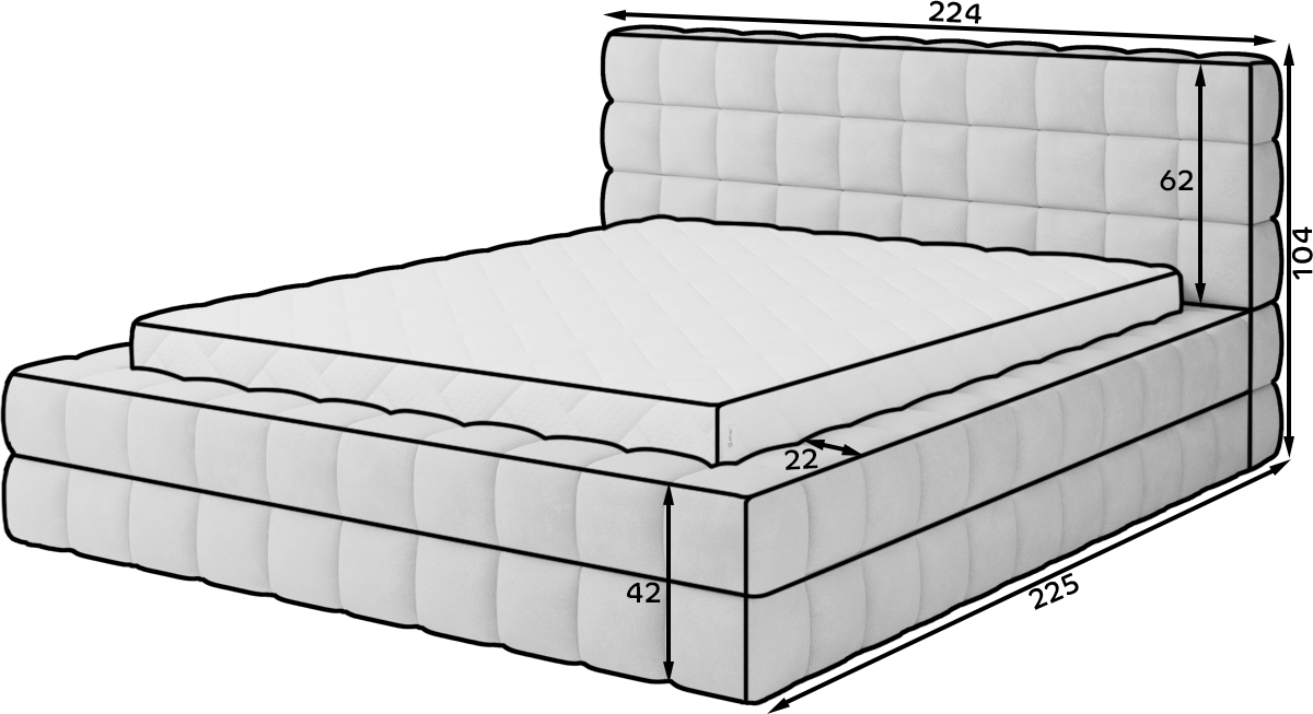 Długość łóżka wynosi 225 cm, a wysokość 104 cm, co sprawia, że stanowi imponujący element wystroju wnętrza. Warto zauważyć, że wysokość siedziska wynosi 42 cm, jednak pamiętaj, aby dodać do tej liczby wysokość materaca, co zapewni komfortowy wypoczynek. Metalowy stelaż gwarantuje trwałość konstrukcji, a liczba pojemników na pościel sprawia, że łóżko Dizzle jest również praktycznym rozwiązaniem do przechowywania dodatkowych elementów.