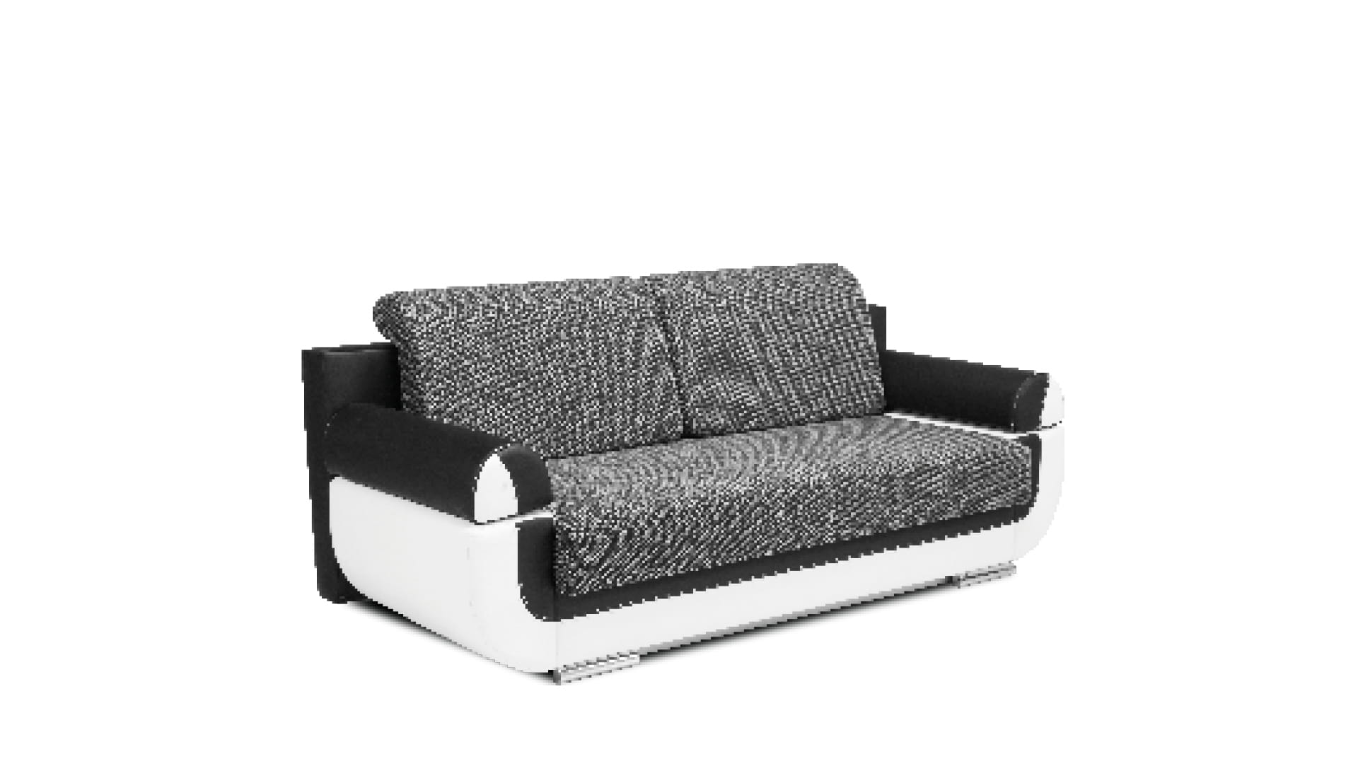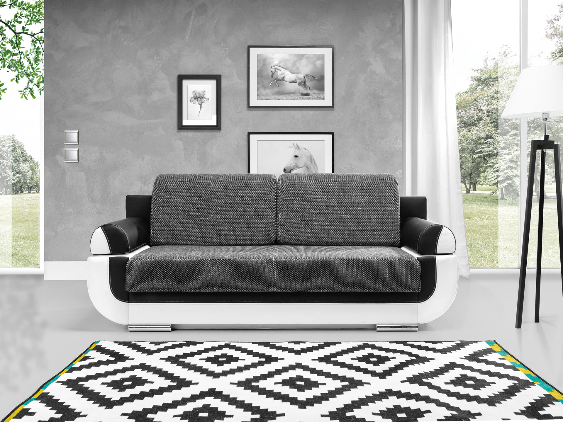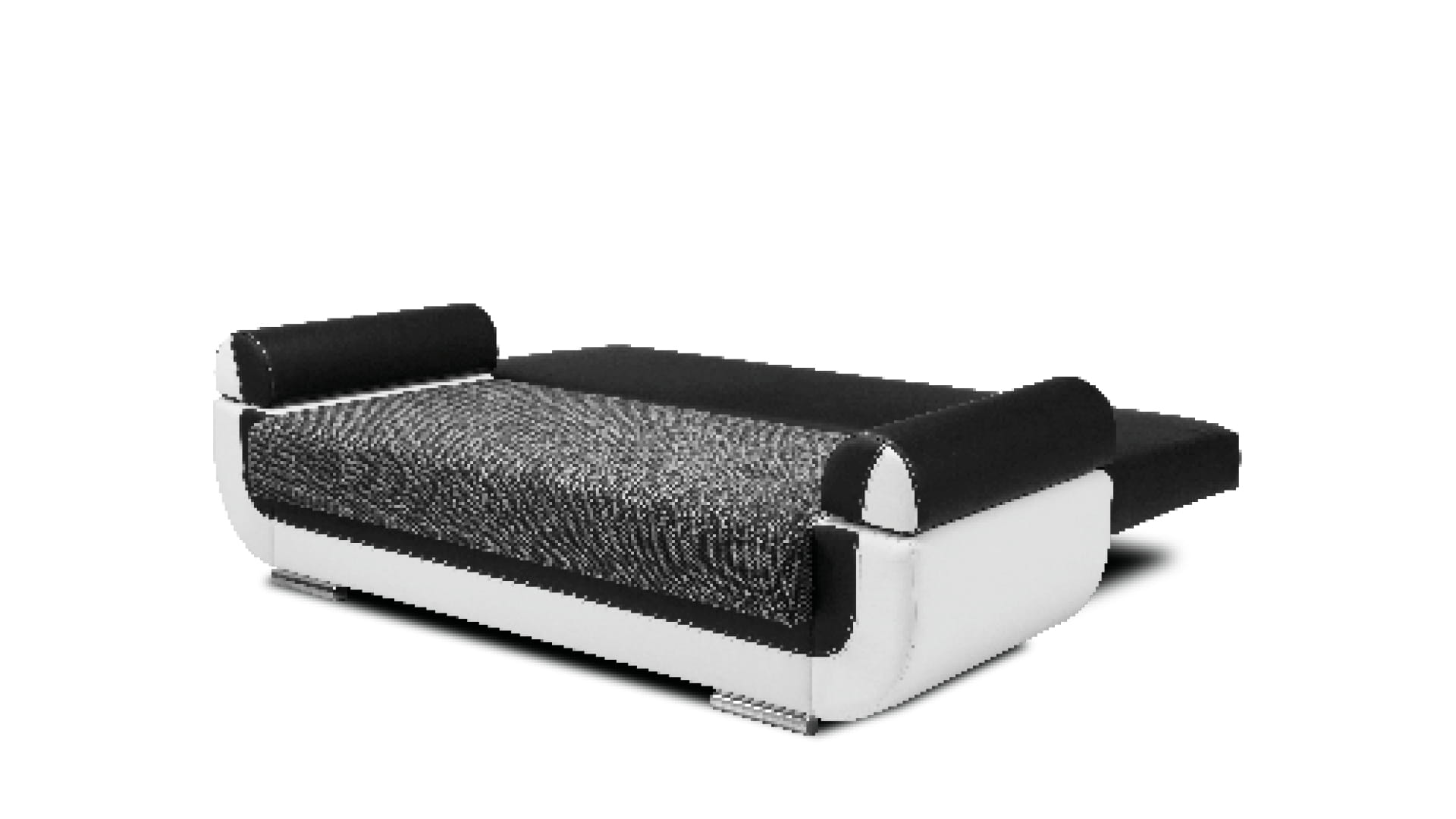 W bryle sofy DORIS zostały wyraźnie zaznaczone dwie strefy, które razem dają interesujący efekt. Stelażwraz z bokami ma miękkie, zaokrąglone kształty i dwubarwną czarno-białą kolorystykę. Tworzą one swoistą ramę dla siedziska i oparcia , które zaprojektowane zostały jako proste geometryczne bryły. Ich melanżowo szara tapicerka świetnie dopełnia i zamyka całość.