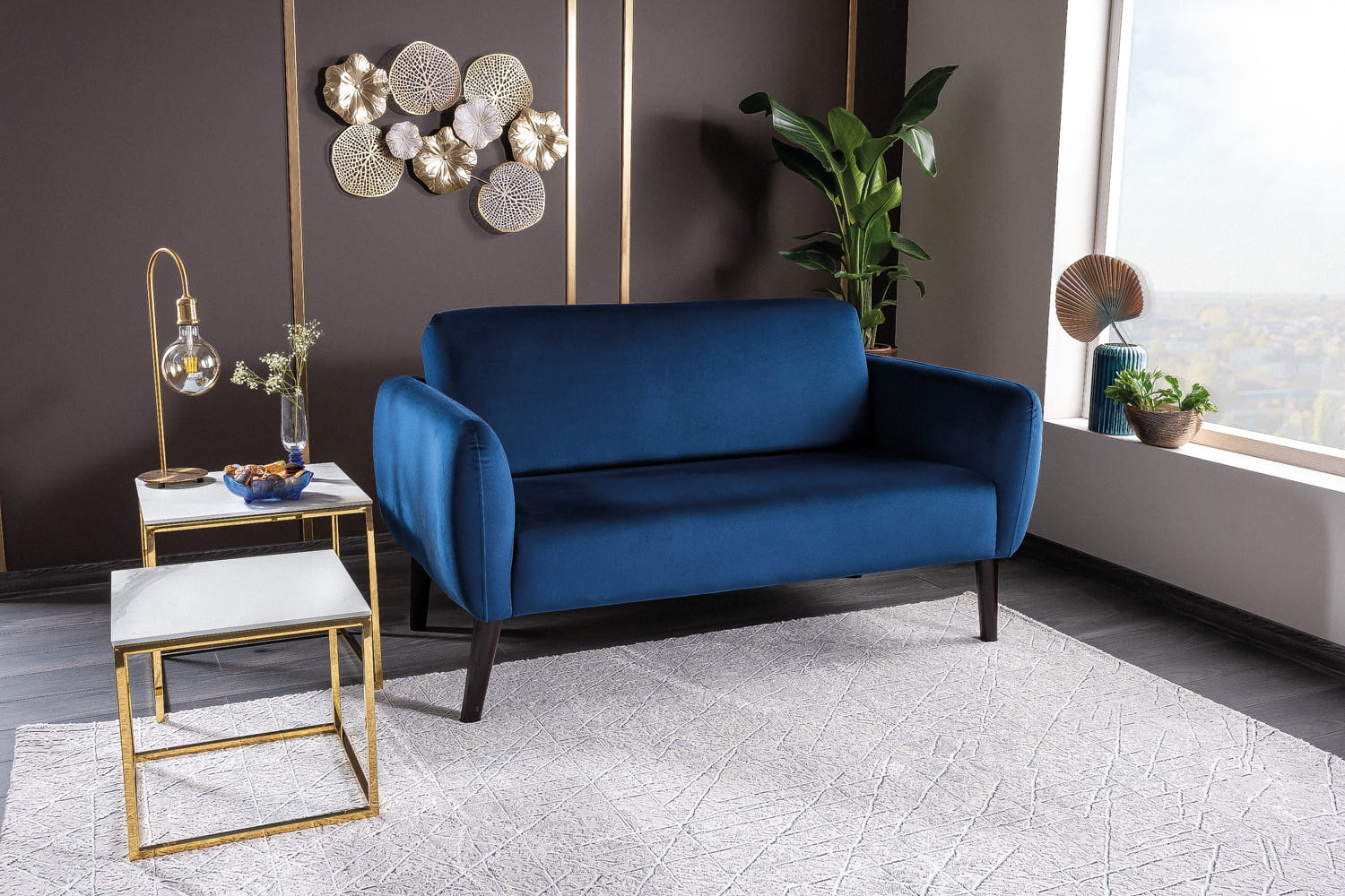 Sofa, tkanina aksamit, kolor: wg próbnika Bluvel 86 - granatowy, drewno, kolor: wenge.