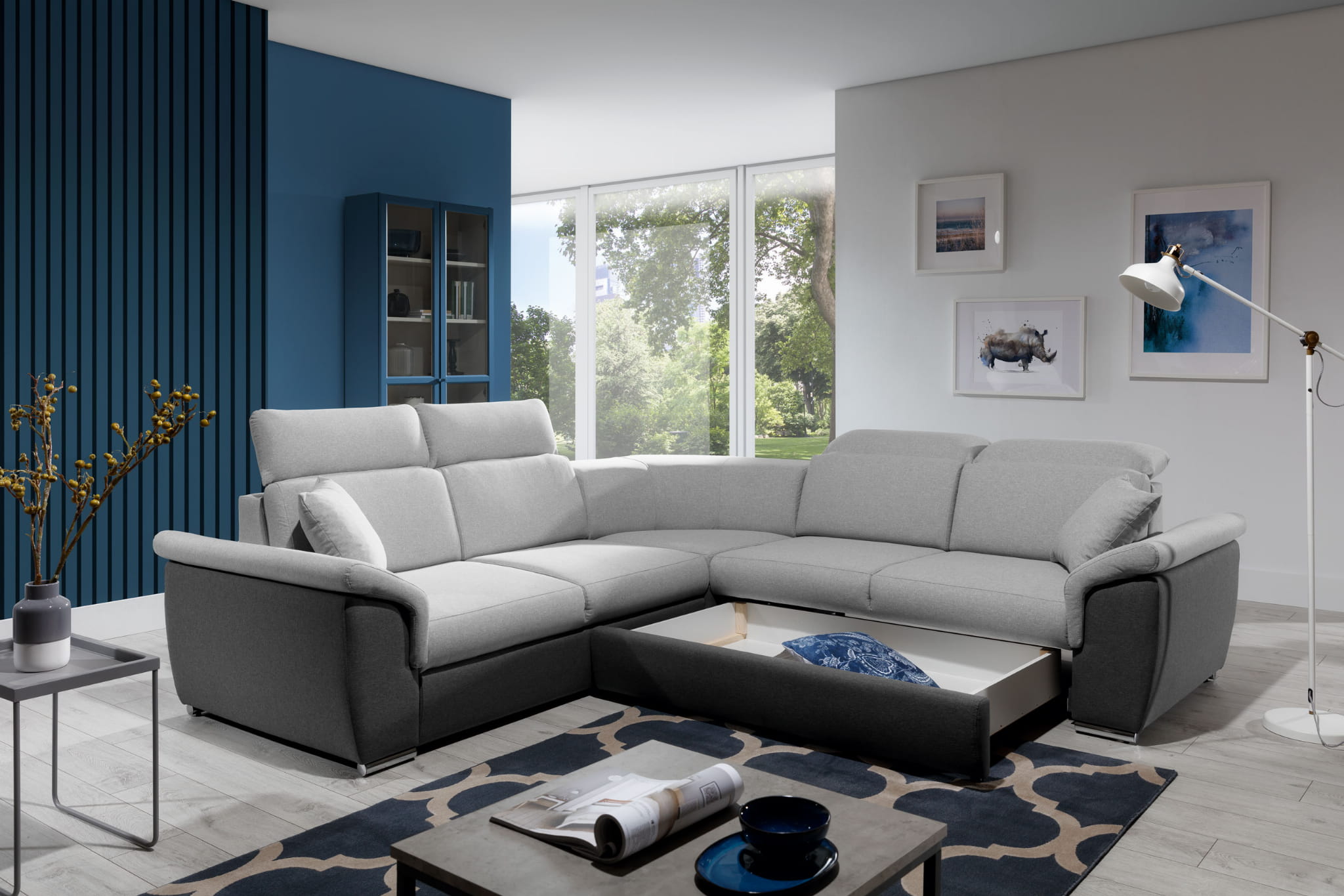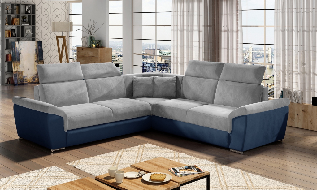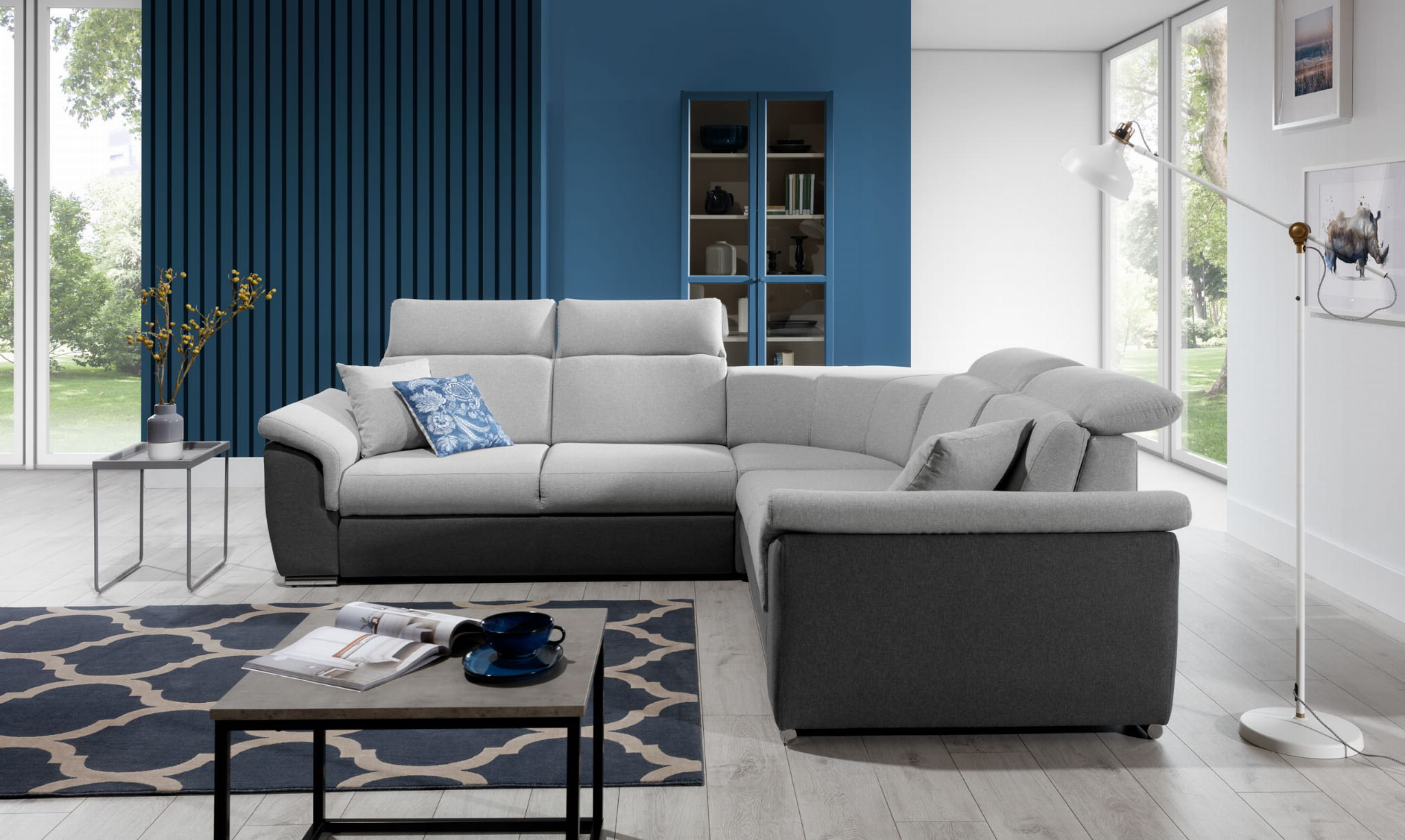 Prosta forma została przełamana oryginalnymi dodatkami w postaci zdobień. To wszystko tworzy wyjątkową całość w postaci przestronnego narożnika FEDERICO, który zapewnia wyjątkowy poziom wygody podczas relaksu w domowym zaciszu. Prosta, klasyczna forma została przełamana nowoczesnymi elementami w postaci szerokich, skośnych podłokietników, wysokich oparć wyposażonych w cztery regulowane zagłówki, dekoracyjne poduszki oraz płaską rogówkę mebla, która może pełnić funkcję podręcznej półki. Mebel łączy ze sobą dwa odcienie - górna część narożnika (siedzisko, oparcie i wierzchnia część podłokietników) utrzymana jest w jednolitym kolorze, dolna część posiada kontrastową barwę, co daje ciekawy efekt wizualny. Możliwość wyboru opcji kolorystycznej z szerokiej oferty odcieni umożliwia bezproblemowe dostosowanie ogólnej stylistyki mebla do aranżacji wnętrza.