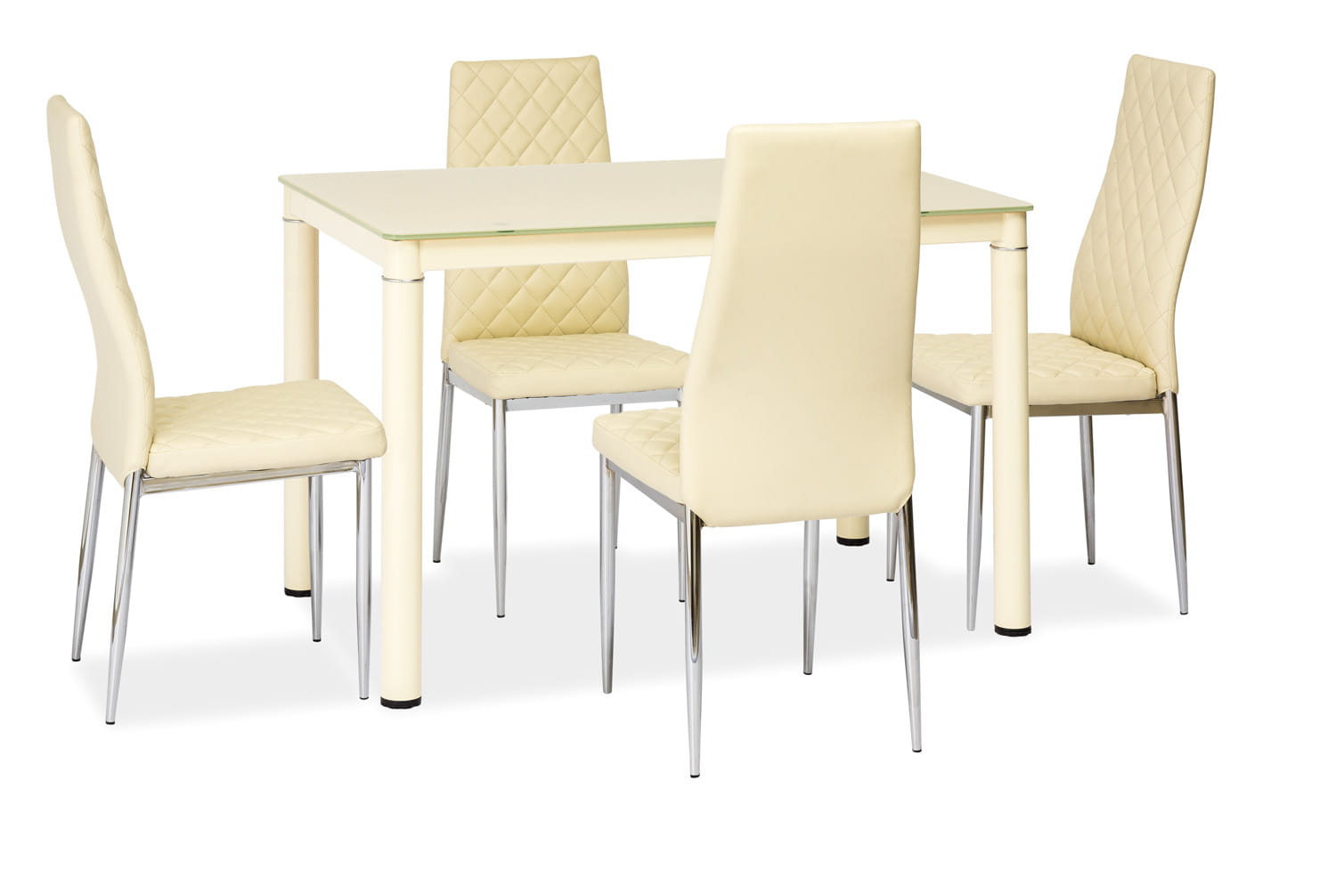 Stół, blat: szkło hartowane, kolor: krem / stelaż: metal malowany, kolor: krem.