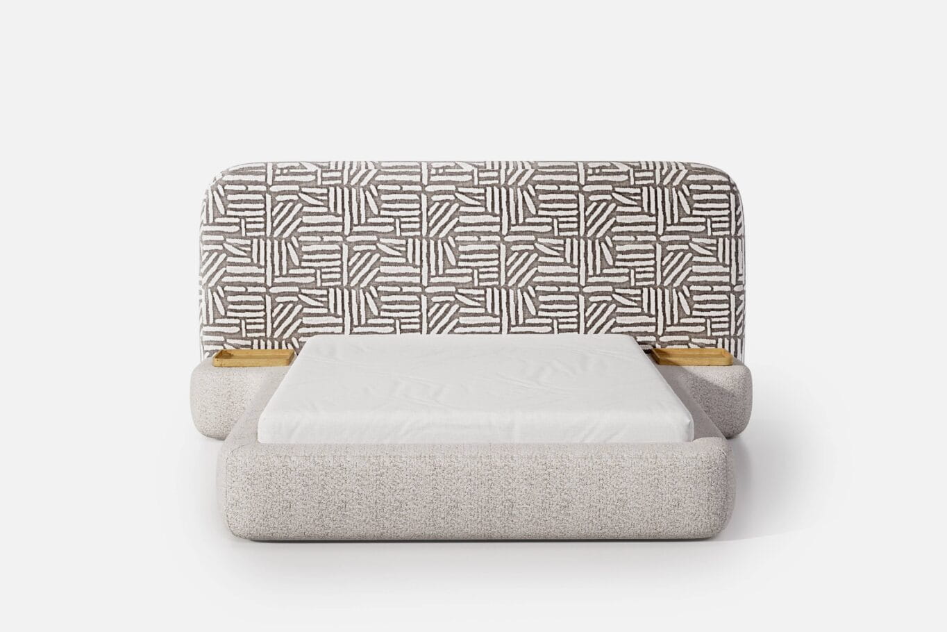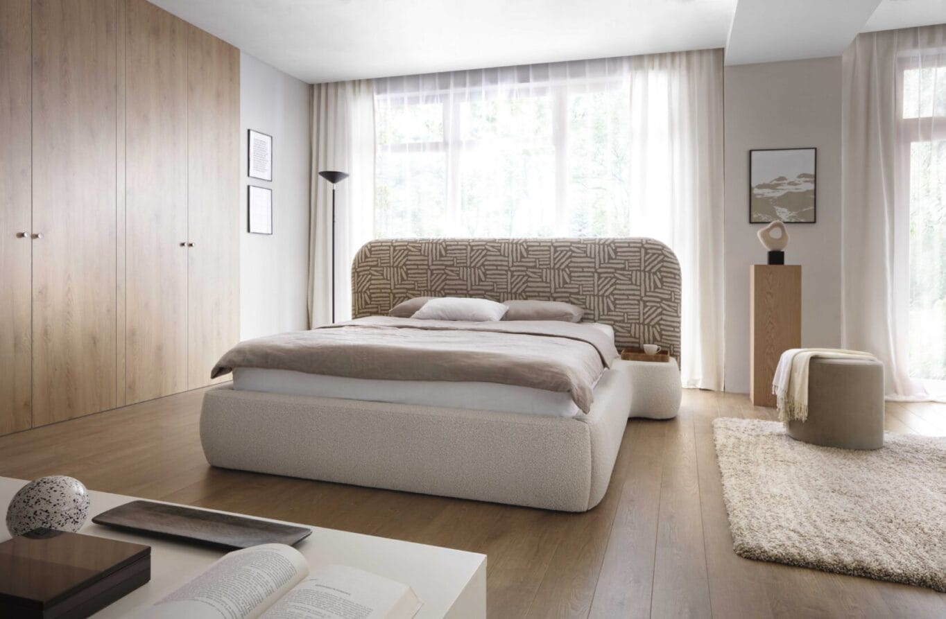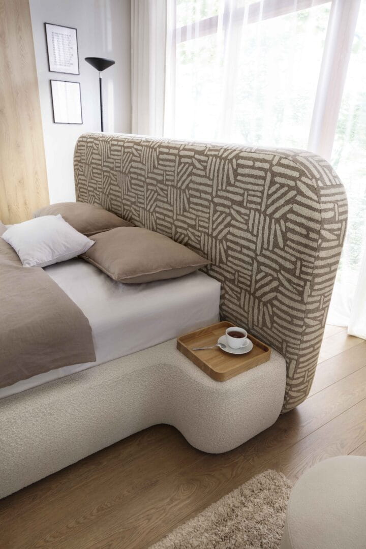 Inspiracją do stworzenia łóżka Genesis była potrzeba bliskości człowieka z naturą. Charakterystyczne dla łóżka obłe kształty nawiązują do łagodnych kształtów roślinnych, jednocześnie wpisując się w obecnie panujące trendy wnętrzarskie. Połączenie dwóch, na pozór różnych od siebie tkanin – wzorzystej, żakardowej z miękką bouclą, współtworzy razem harmonijny duet. Integralną częścią podstawy łóżka są dwa stoliki nocne z blatami wykonanymi z drewna orzechowego. Łóżko Genesis zostało wyróżnione Diamentem Meblarstwa 2023.