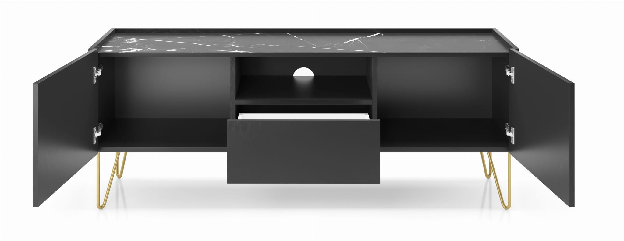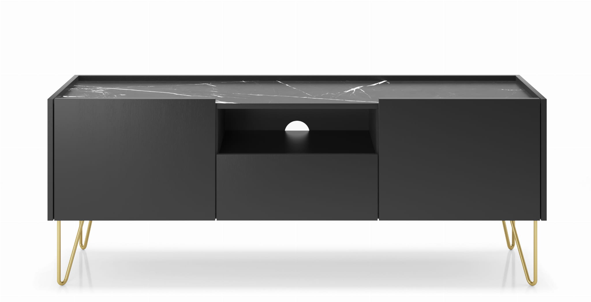 Połysk i mat mienią się w czerniach frontów,korpusów i marmurowego dekoru blatu. Złota noga czerpiąca ze stylu lat sześćdziesiątych podkreśla elegancję. Fronty i korpus, wystające ponad górny blat, tworzą wokół niego rant, charakterystyczny dla tacy.