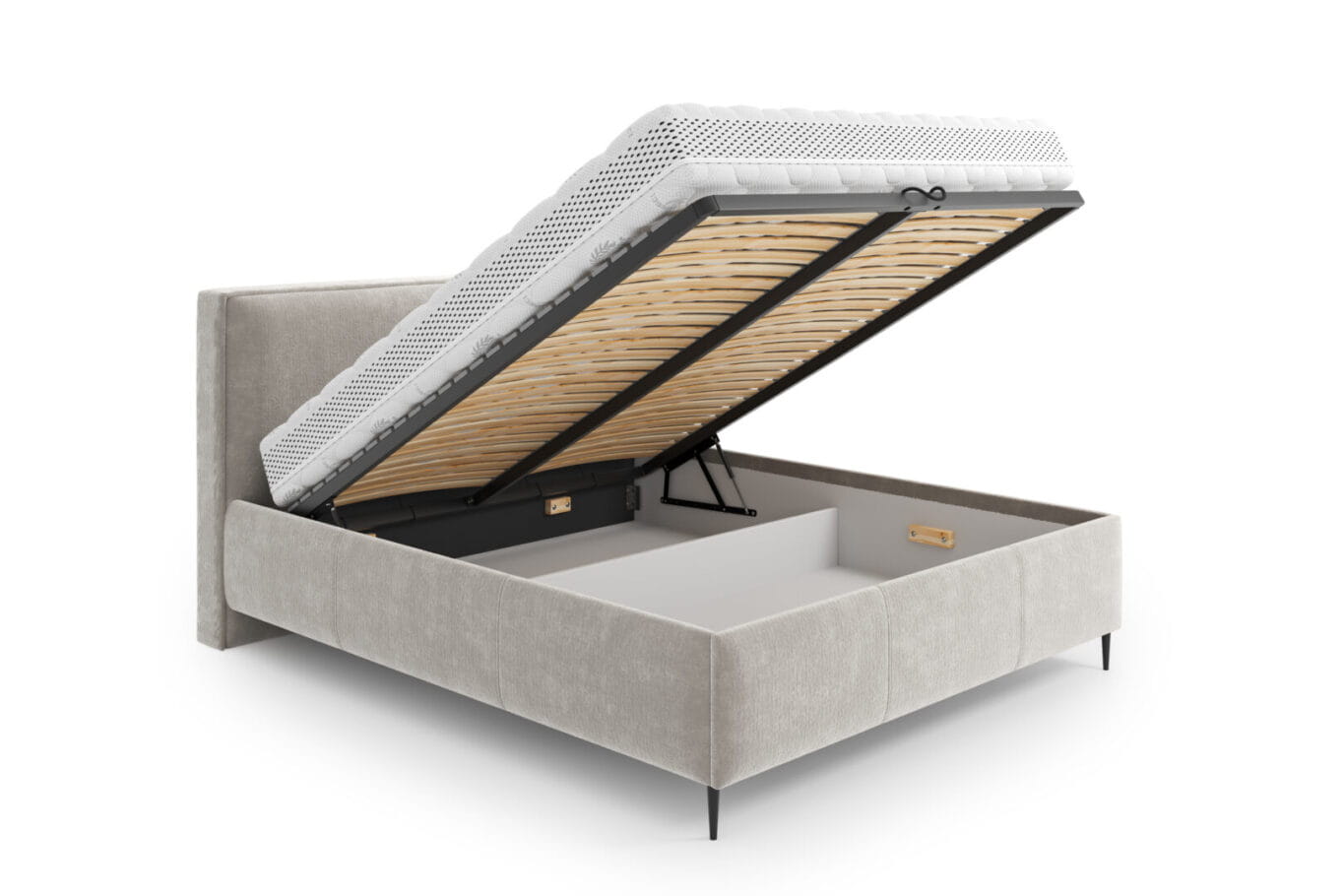 Łóżko tapicerowane Hatton cechuje minimalistyczna forma, z miękkim i puszystym zagłówkiem, który posiada charakterystyczny wciąg. Wysokie, 12-centymetrowe nóżki dodają lekkości i ułatwiają utrzymanie czystości pod łóżkiem. Model dostępny jest w rozmiarach 140x200, 160x200 oraz 180x200 cm. Istnieje możliwość wyboru między samym stelażem a wersją z dodatkowym pojemnikiem na pościel, co sprawia, że łóżko Hatton jest nie tylko estetyczne, ale również funkcjonalne.