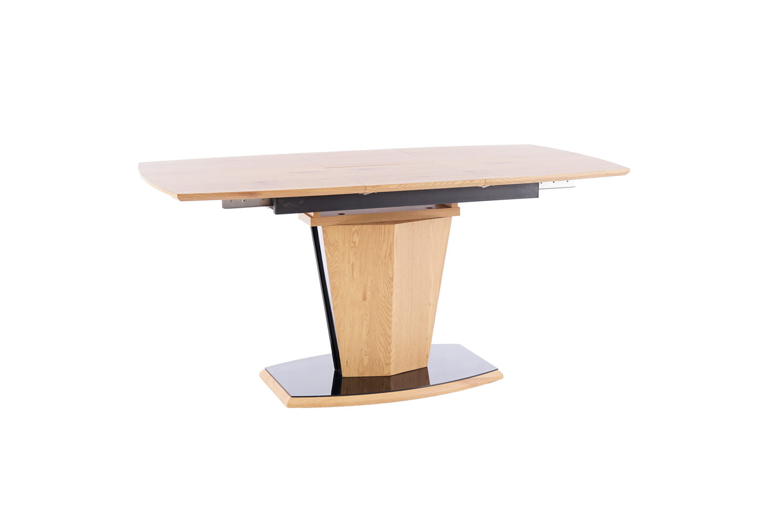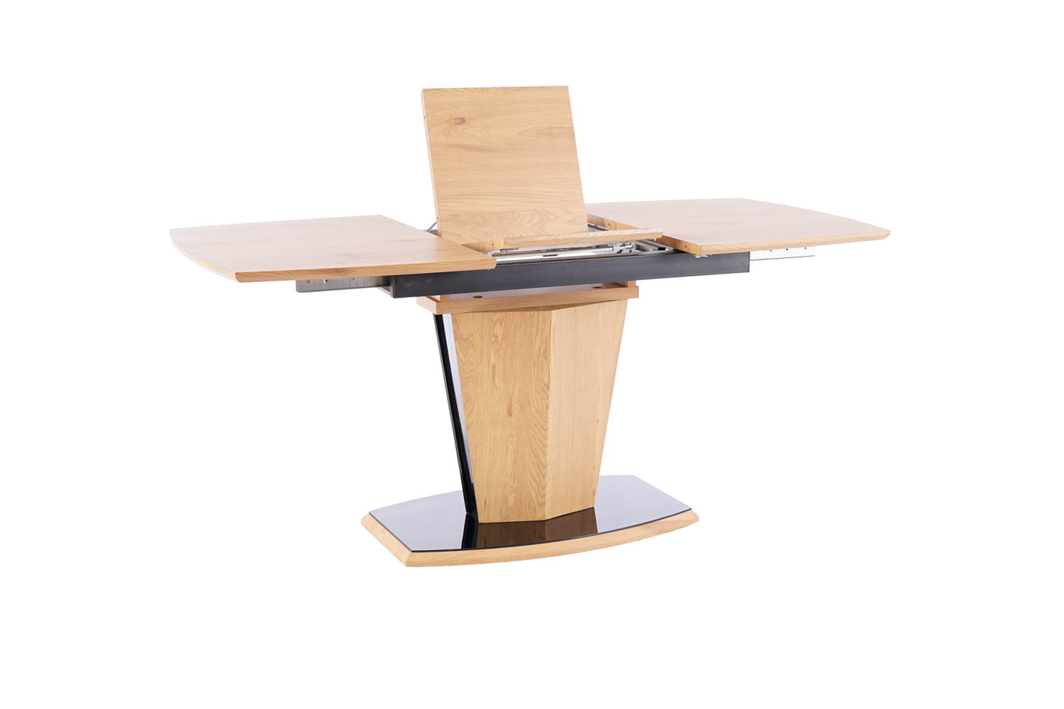 Stół rozkładany, blat: MDF+okleina, stelaż: MDF+okleina+szkło hartowane, kolor: dąb / dąb+czarny lakier.