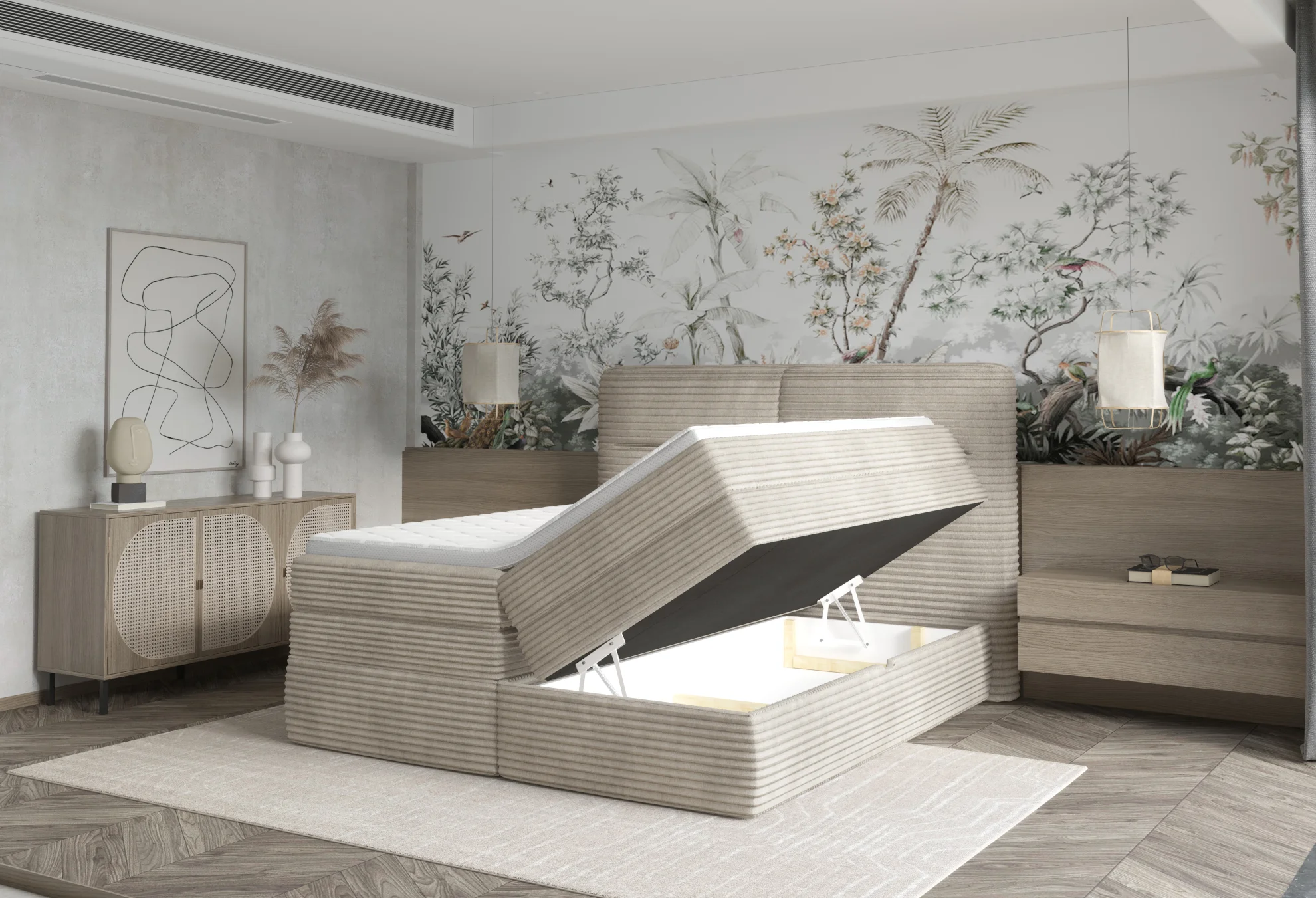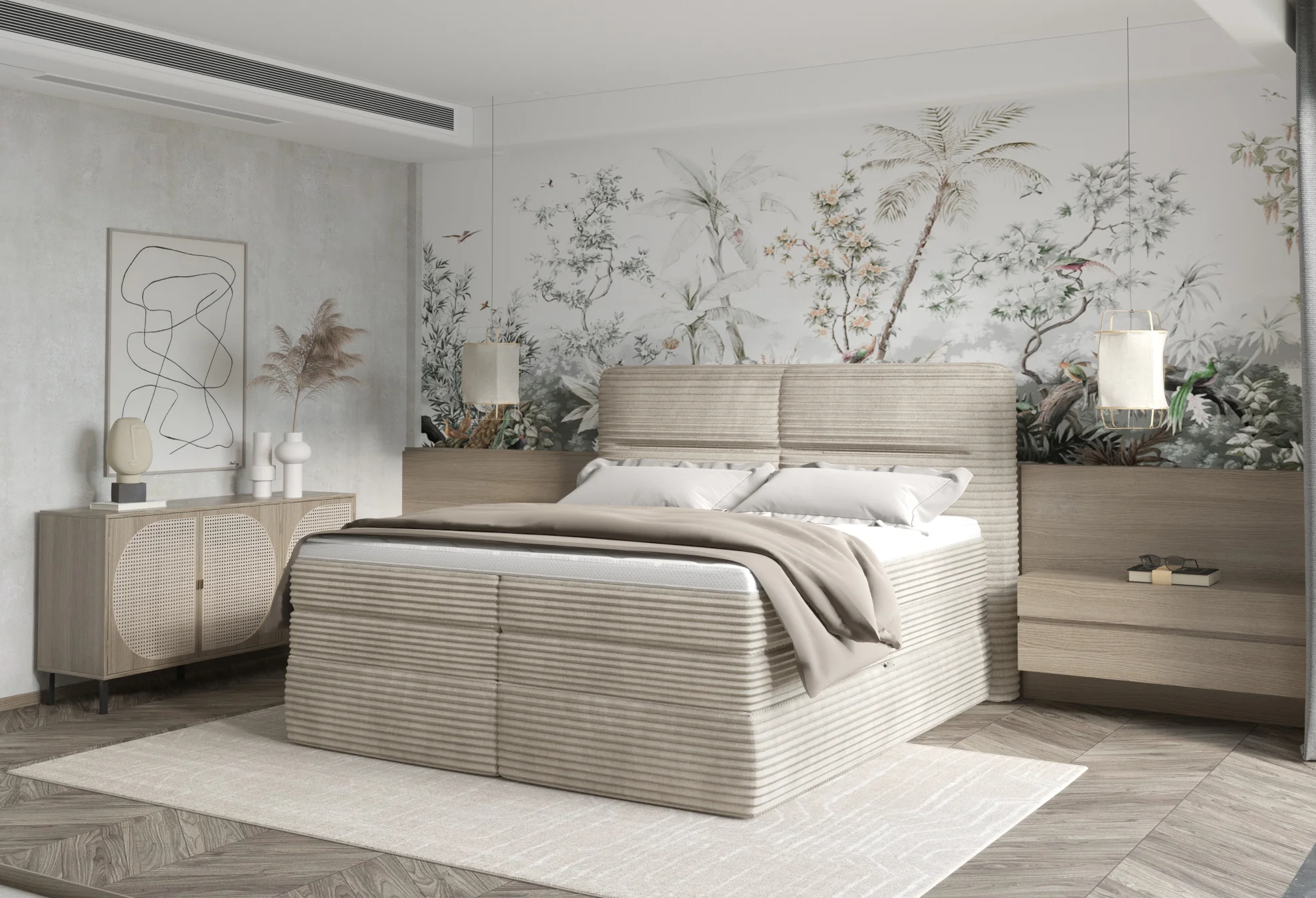 To klasyczne łoże wyróżniające się pięknymi pikowaniami. Zostało wyposażone w materac bonellowy na dole oraz kieszeniowy 7-strefowy u góry. Do wyboru są 3 rodzaje szerokości, które pozwalają dobrać idealny rozmiar powierzchni spania. HUDSON posiada 2 pojemniki na pościel, ułatwiające przechowywanie dodatkowego kompletu pościeli. Dodatkowo obecność toppera podwyższa jakość wypoczynku i sprawia, że łóżko użytkuje się z niezwykłą przyjemnością.