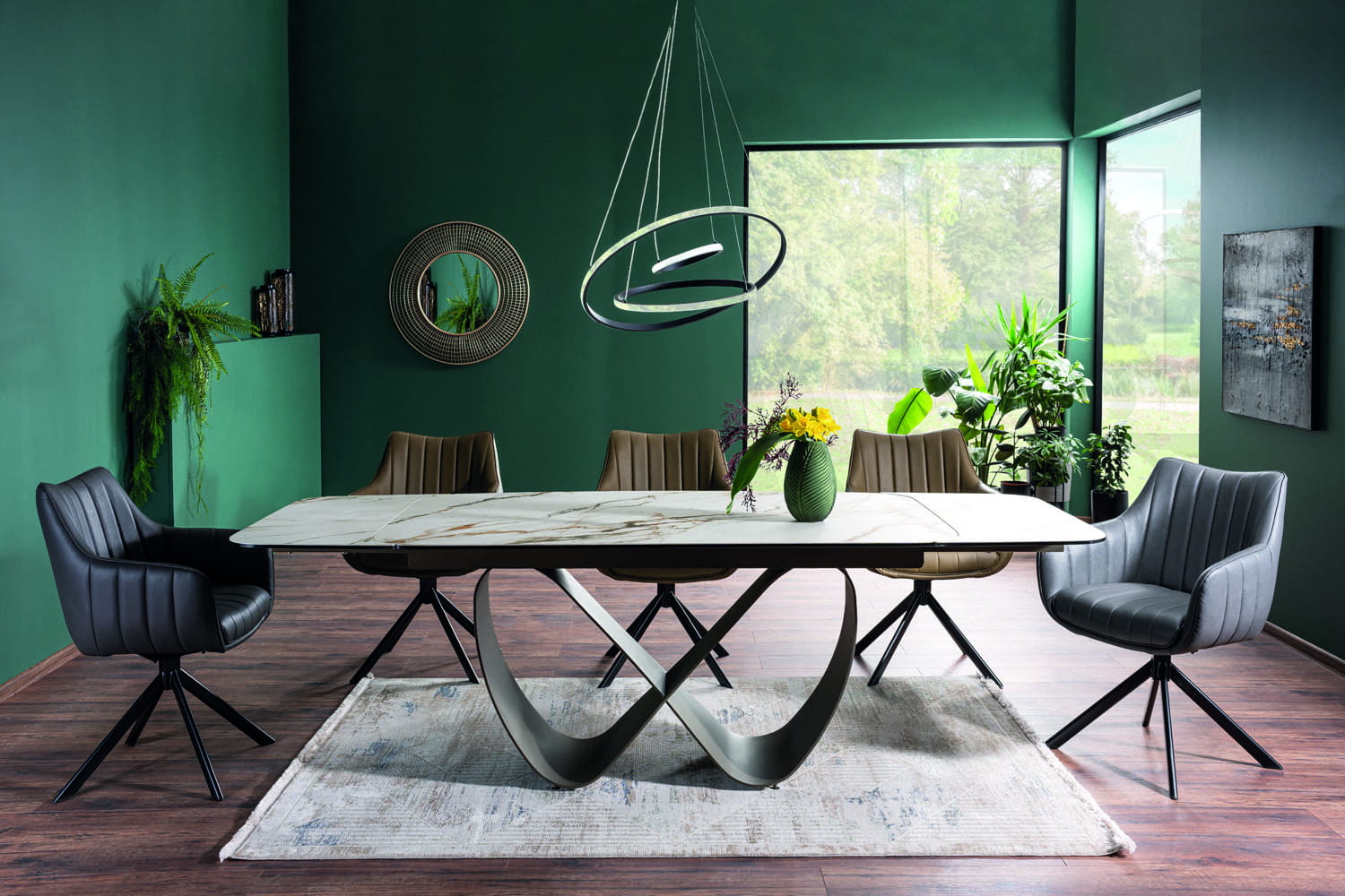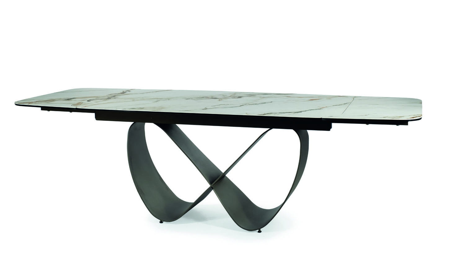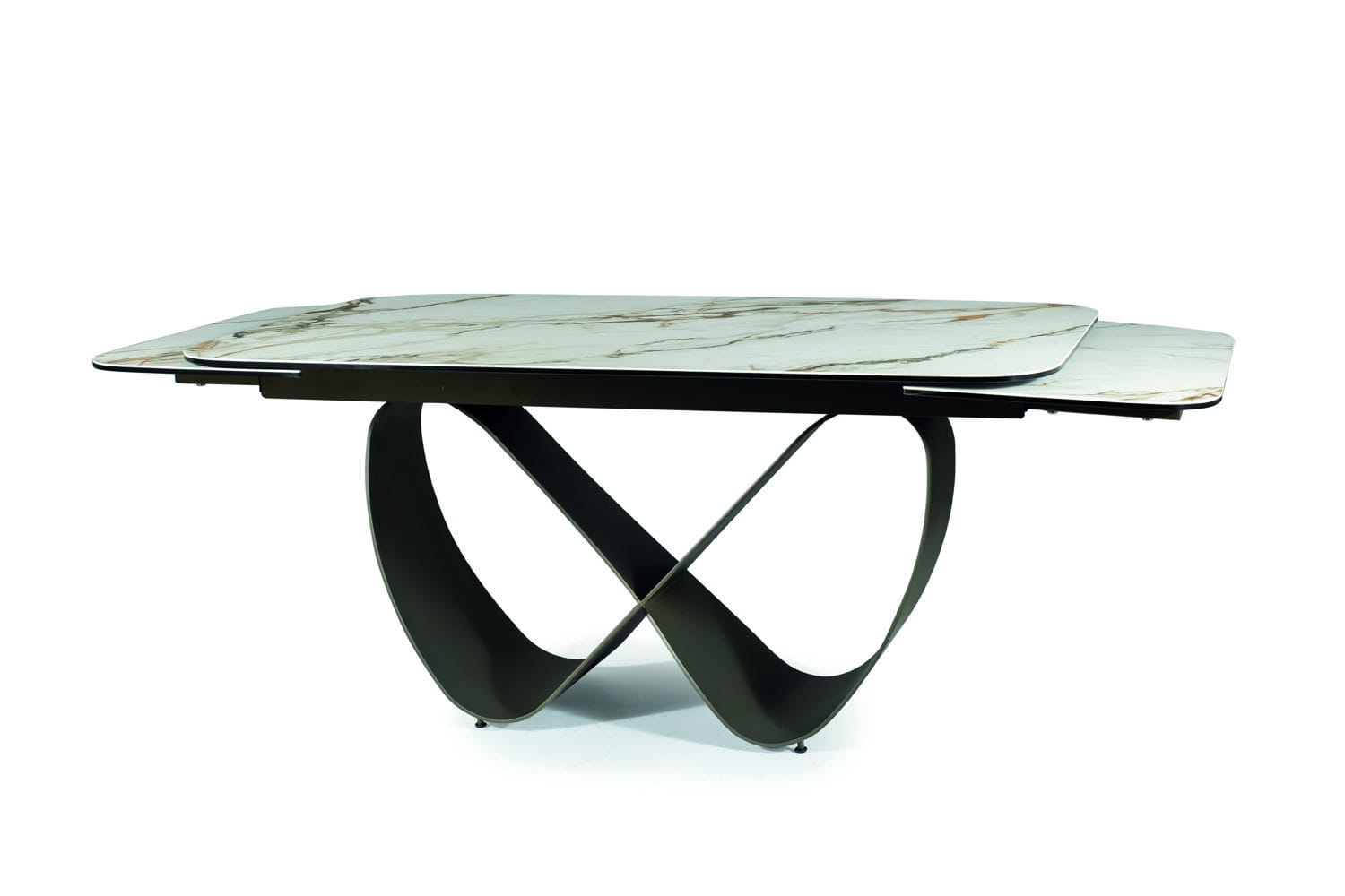 Stół rozkładany, blat: szkło hartowane + hiszpańska ceramika, AMBER BIANCO, stelaż: metal, kolor: biały / brązowy.