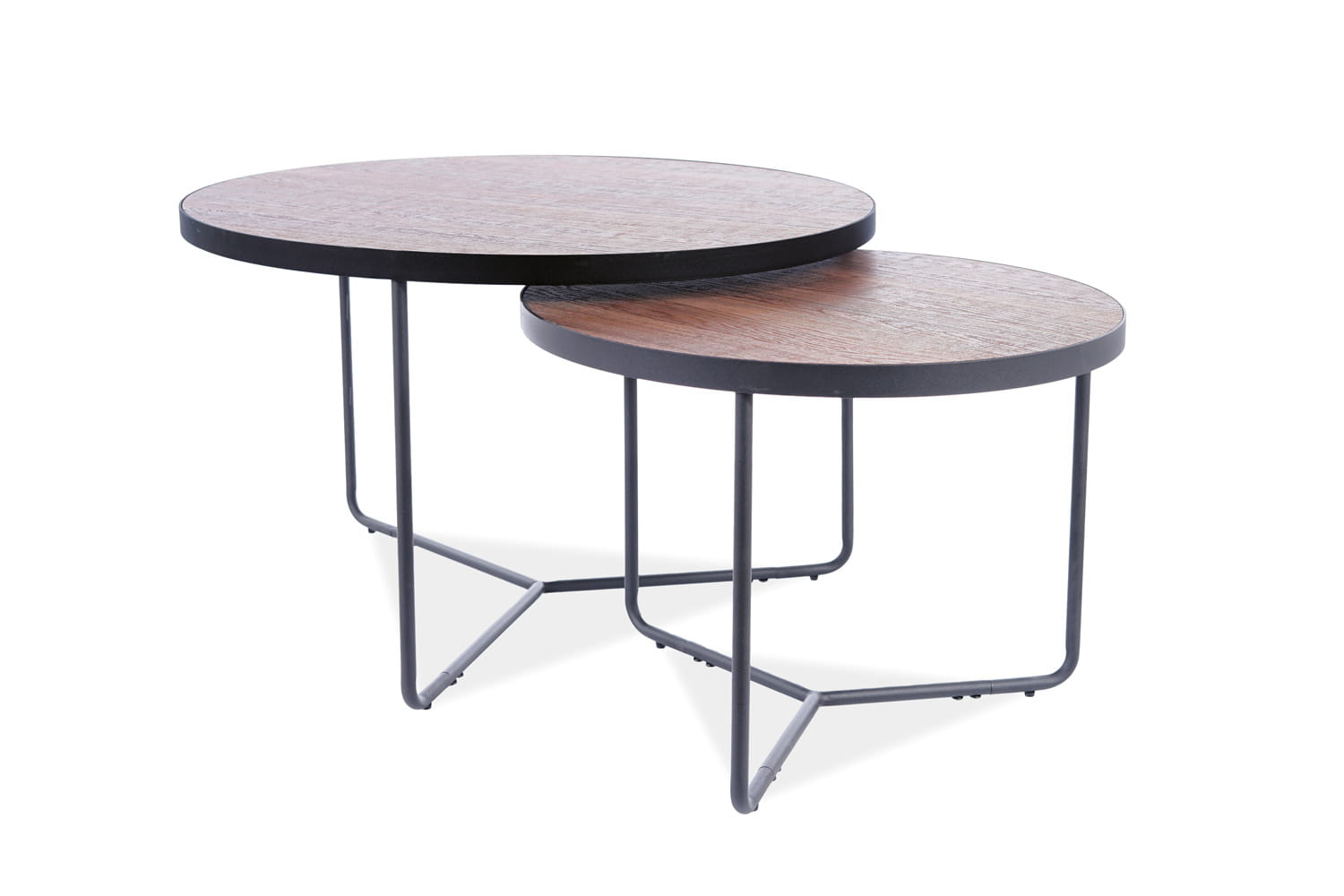 Zestaw ław, blat: MDF+okleina, stelaż: metal, kolor: orzech / czarny mat. Wymiary mniejszego stolika: