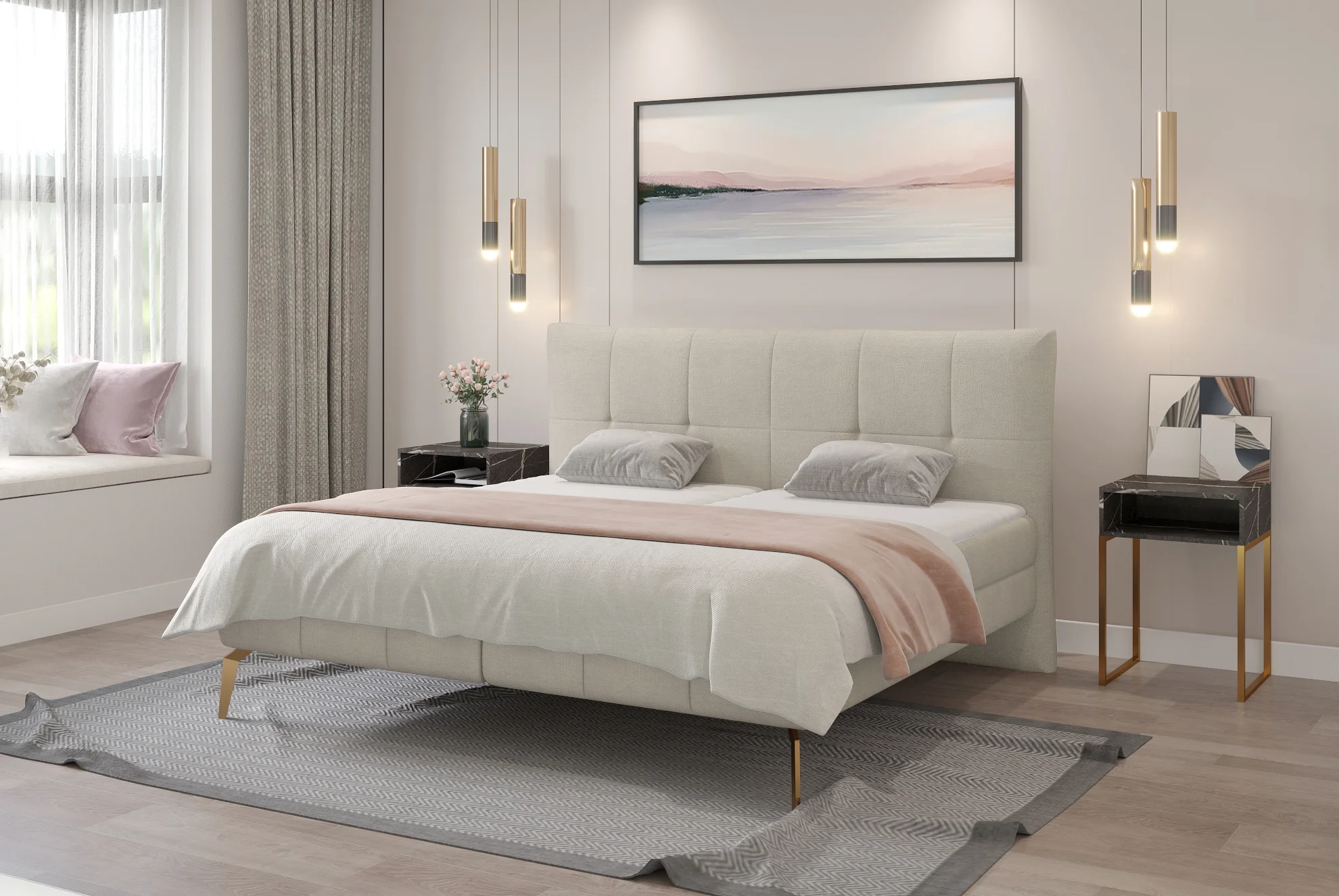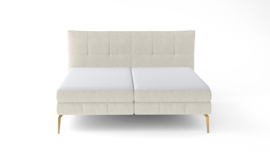 JOLIN to łóżko z serii Dream, które odnajdzie się w klasycznych i eleganckich wnętrzach. Delikatne przeszycia obecne na zagłowiu, a także z boku oraz od frontu konstrukcji pojemnika to efektowny element wyróżniający ten model. Możliwość przechowywania koca i poduszek to jego dodatkowy atut. Złote, metalowe nogi powodują, że JOLIN zyskuje wysublimowany charakter.