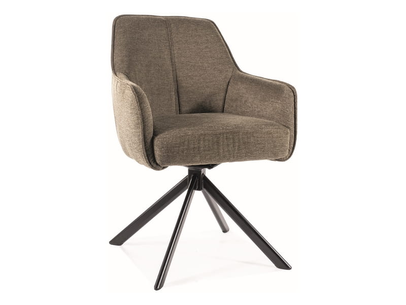 Krzesło, tkanina Brego, kolor: oliwka 77, stelaż: metal, czarny mat. Siedzisko obracane w zakresie 180st, z funkcją powrotu do pierwotnej pozycji. Siedzisko wyposażone w sprężyny kieszeniowe.