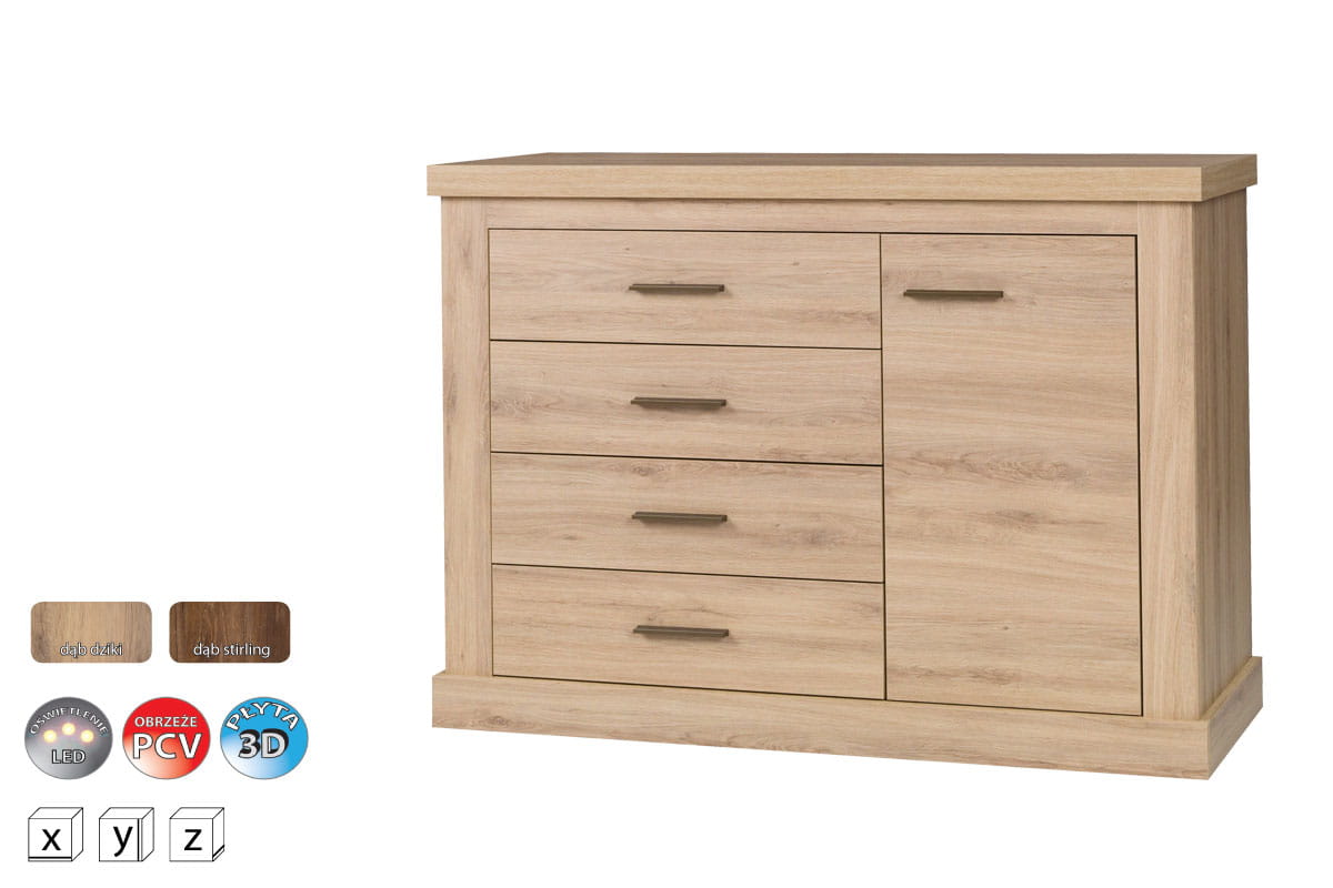 Połączenie klasycznego wzornictwa z prostą formą nadaje meblom Amber nowoczesności, a dodatkowe oświetlenie LED podkreśli ich atrakcyjność oraz wprowadzi do wnętrza przytulny i ciepły klimat. Meble wykonane zostały z wysokiej jakości płyty meblowej laminowanej w kolorze dąb dziki, a obrzeża wykończone zostały okleiną PCV. Szeroki wybór brył, jaki posiada kolekcja Amber, pozwala na urządzenie zarówno małych, jak i dużych pomieszczeń.