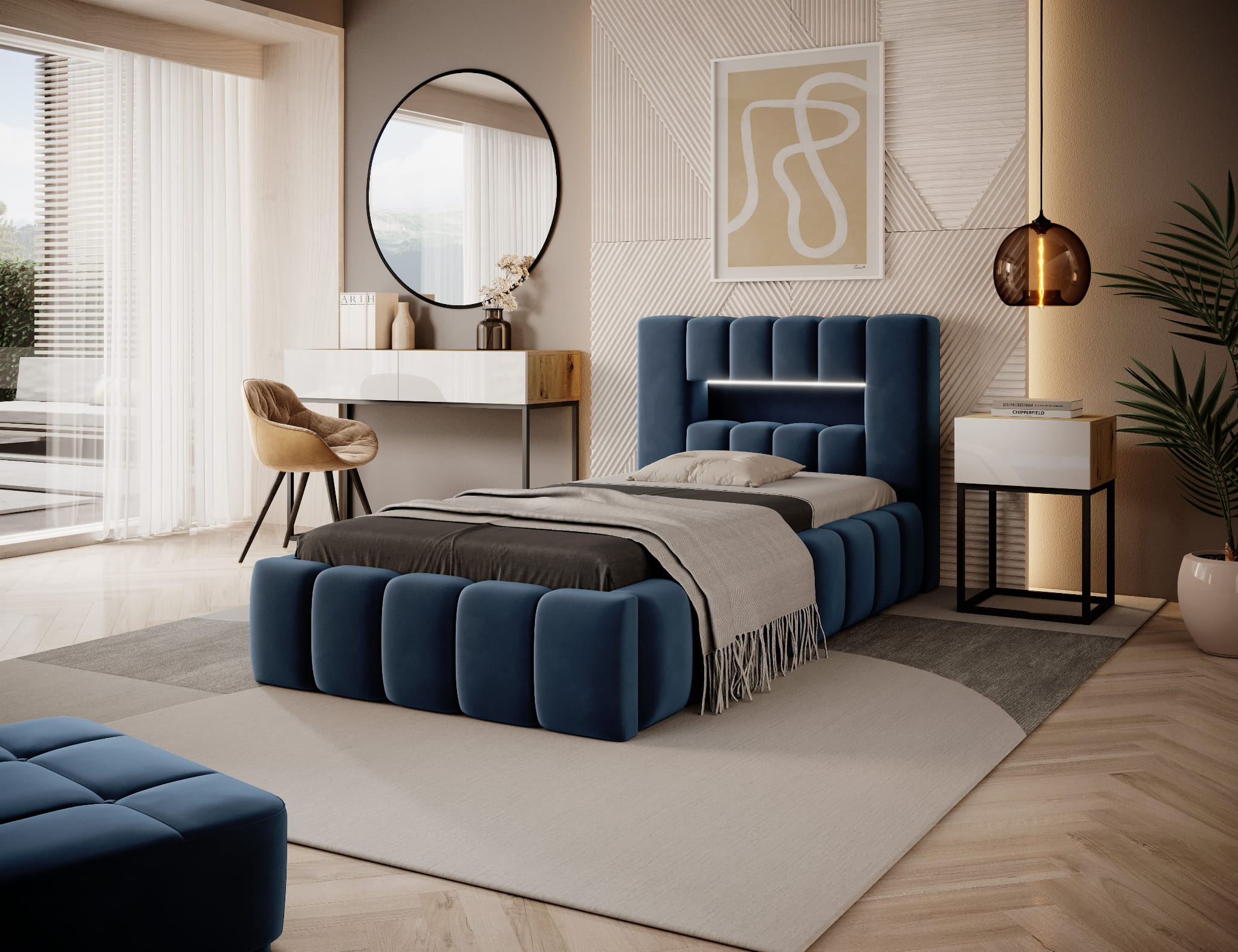 Łóżko do sypialni Lamica zachwyca pięknym tapicerowanym wezgłowiem z elegancko wkomponowanym oświetleniem led.