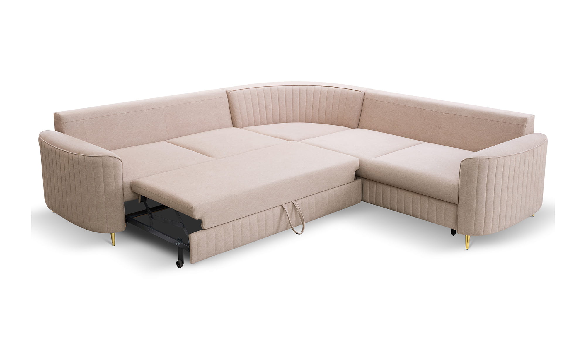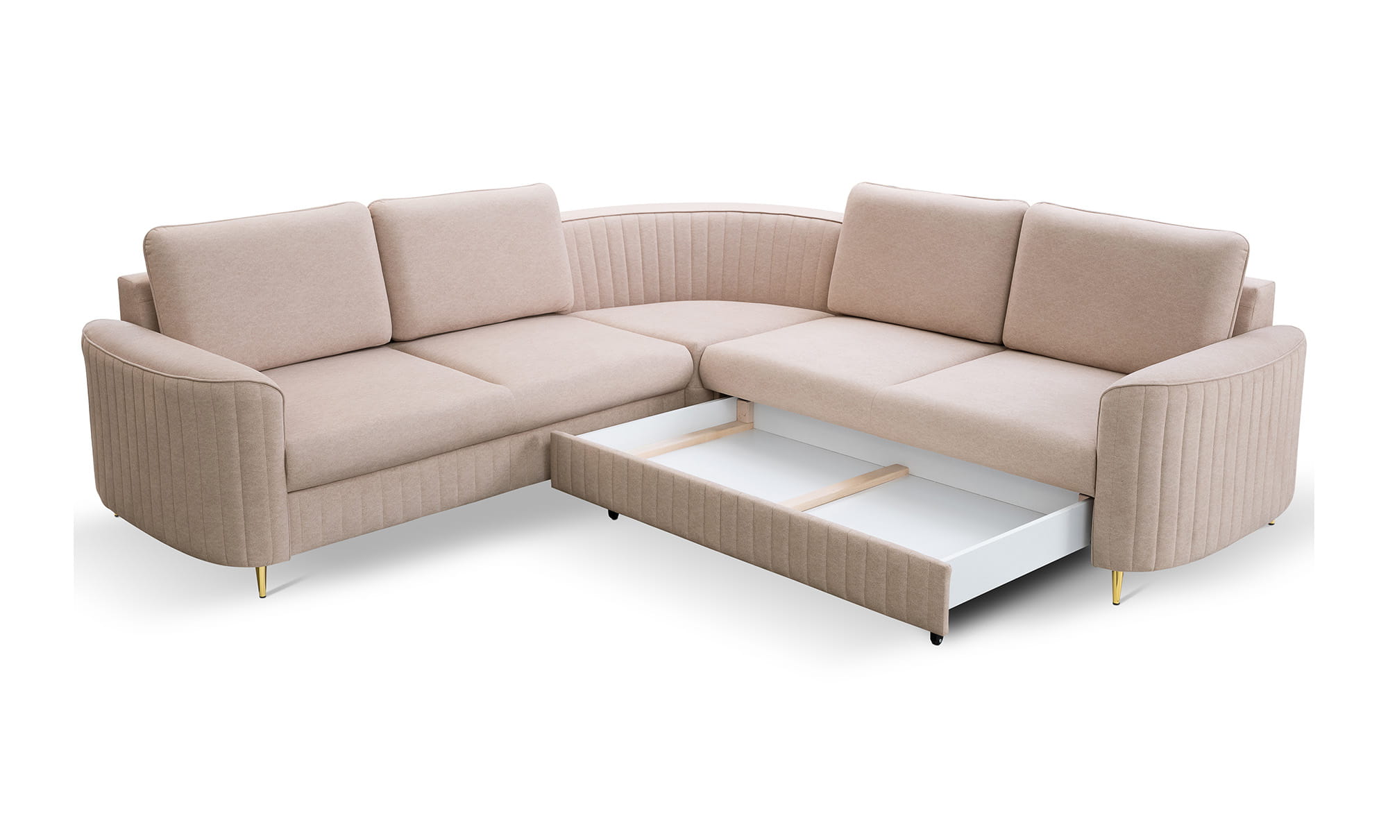 Piękny narożnik LAREN w stylu glamour z modnymi, ozdobnymi przeszyciami. Elegancja i styl podkreślona metalowymi nóżkami w kolorze złotym. Ten model znajdzie zastosowanie w przestronnych aranżacjach, przyciągając spojrzenia.