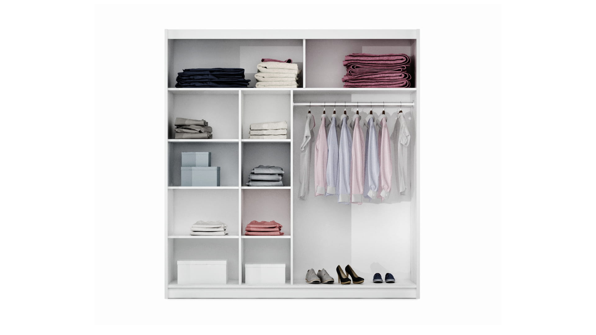 Wyposażenie: aluminiowe prowadnice, dolne wózki na łożyskach, 2 drążki, półki, listwa dekoracyjna