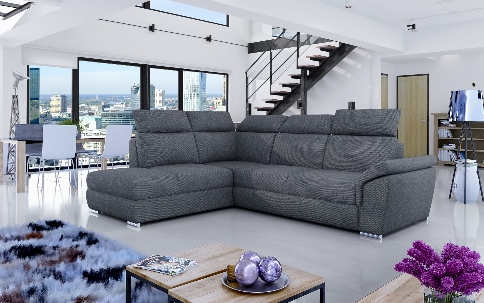 Wymiary 260x210x102 sprawiają, że mebel idealnie sprawdzi się w domu z przestronnym salonem, stanowiąc centralny punkt pokoju. Połączenie sprężyny falistej oraz pianki T30 sprawia, że siedzisko narożnika jest wyjątkowo wygodne, a równocześnie stabilne - za sprawą dodatkowego utwardzenia, pianka odporna jest na odkształcenia, dzięki czemu nie tylko nie jest narażona na pojawienie się nieestetycznych wgłębień, ale przede wszystkim odpowiednio podtrzymuje ciało podczas wypoczynku. Owalne, chromowane nogi stanowią stylowy szczegół, dzięki któremu narożnik prezentuje się wyjątkowo elegancko, idealnie komponując się zarówno w aranżacjach utrzymanych w nowoczesnym, jak i nowojorskim czy industrialnym stylu. Jeśli jesteś zwolennikiem wygodnych, przestronnych mebli, a równocześnie chcesz zadbać o wypoczynek na najwyższym poziomie i ochronę kręgosłupa, narożnik LORETO z pewnością spełni Twoje oczekiwania.