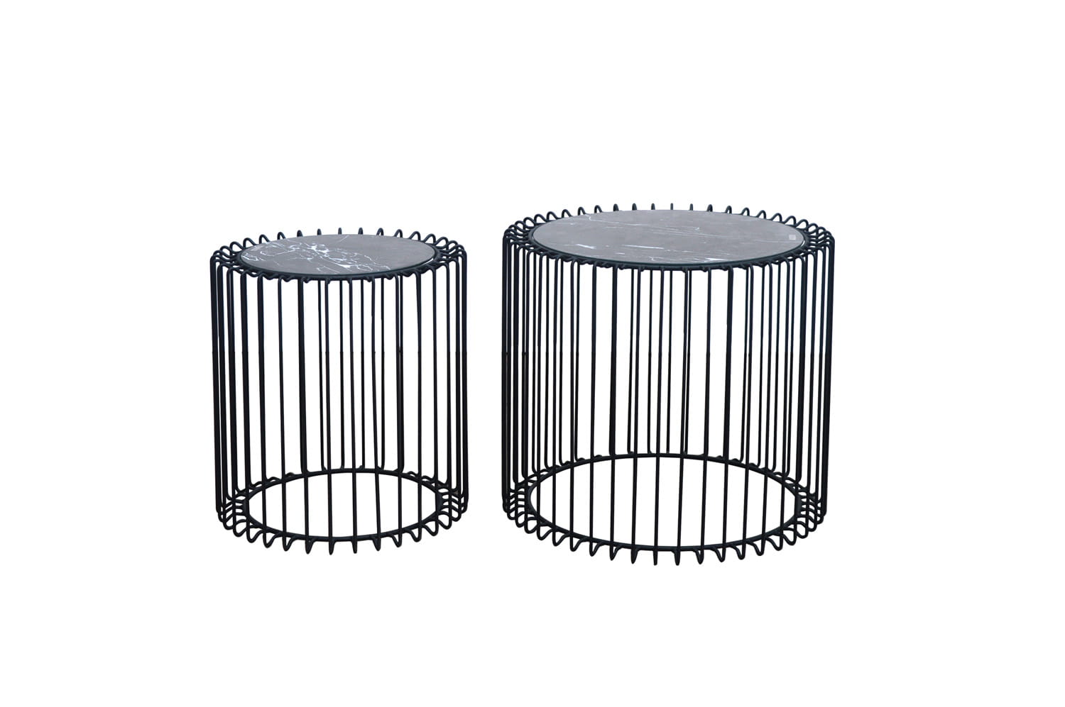 Zestaw ław, blat: szkło hartowane z efektem marmuru, stelaż: metal, kolor: czarny / czarny. Wymiary mniejszego stolika fi: 40, h-42cm.