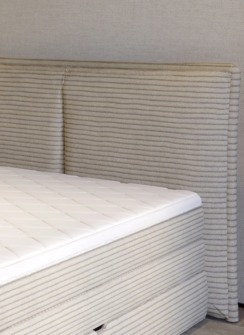 Łóżko o prostym zagłówku z pionowym, pojedynczym przeszyciem po środku. Dwa pojemniki na pościel to dodatkowe miejsce do przechowywania kocy, czy poduszek. Łóżko zostało wyposażone w materac bonellowy na dole oraz kieszeniowy 7-strefowy u góry. Do wyboru są 3 rodzaje szerokości.