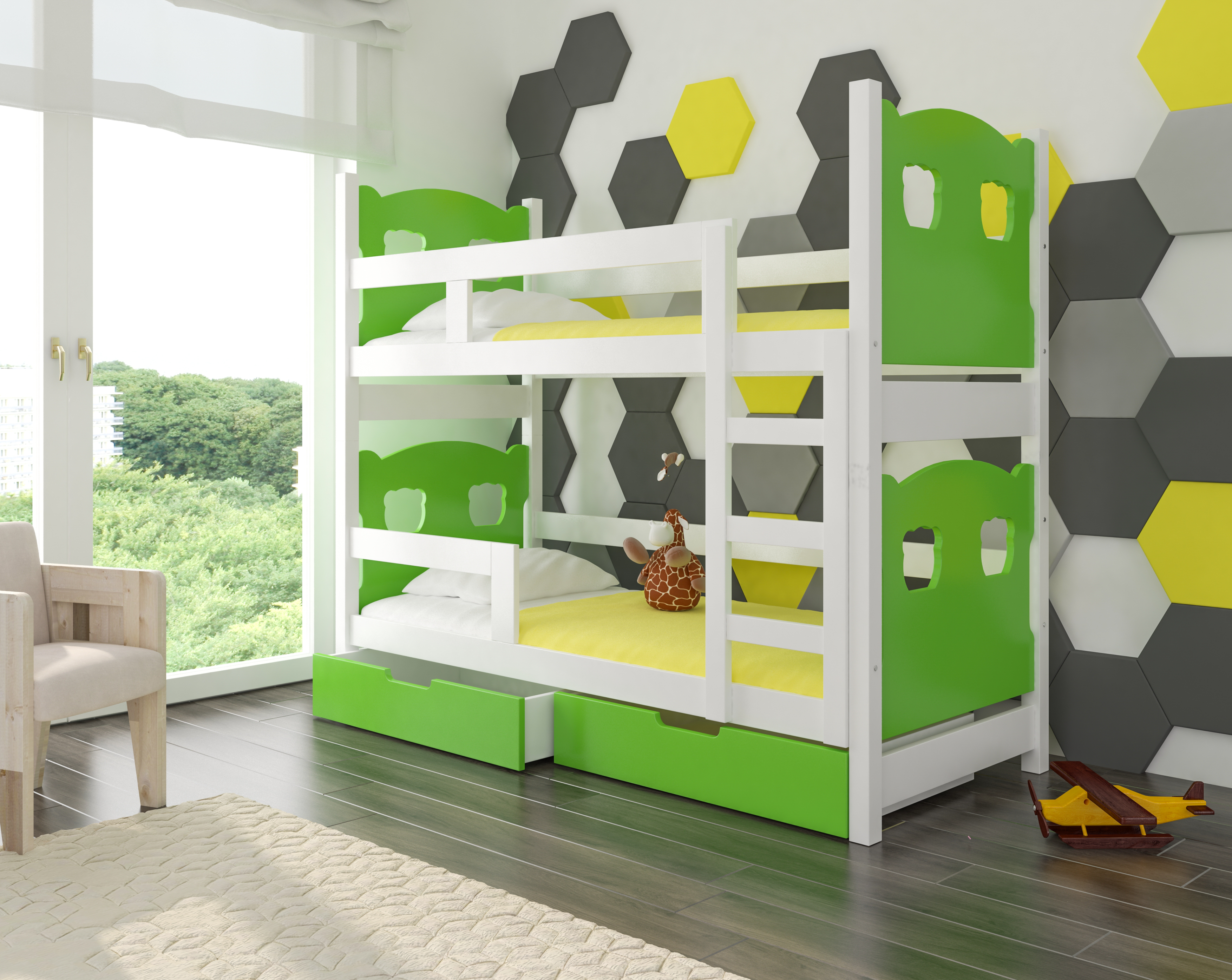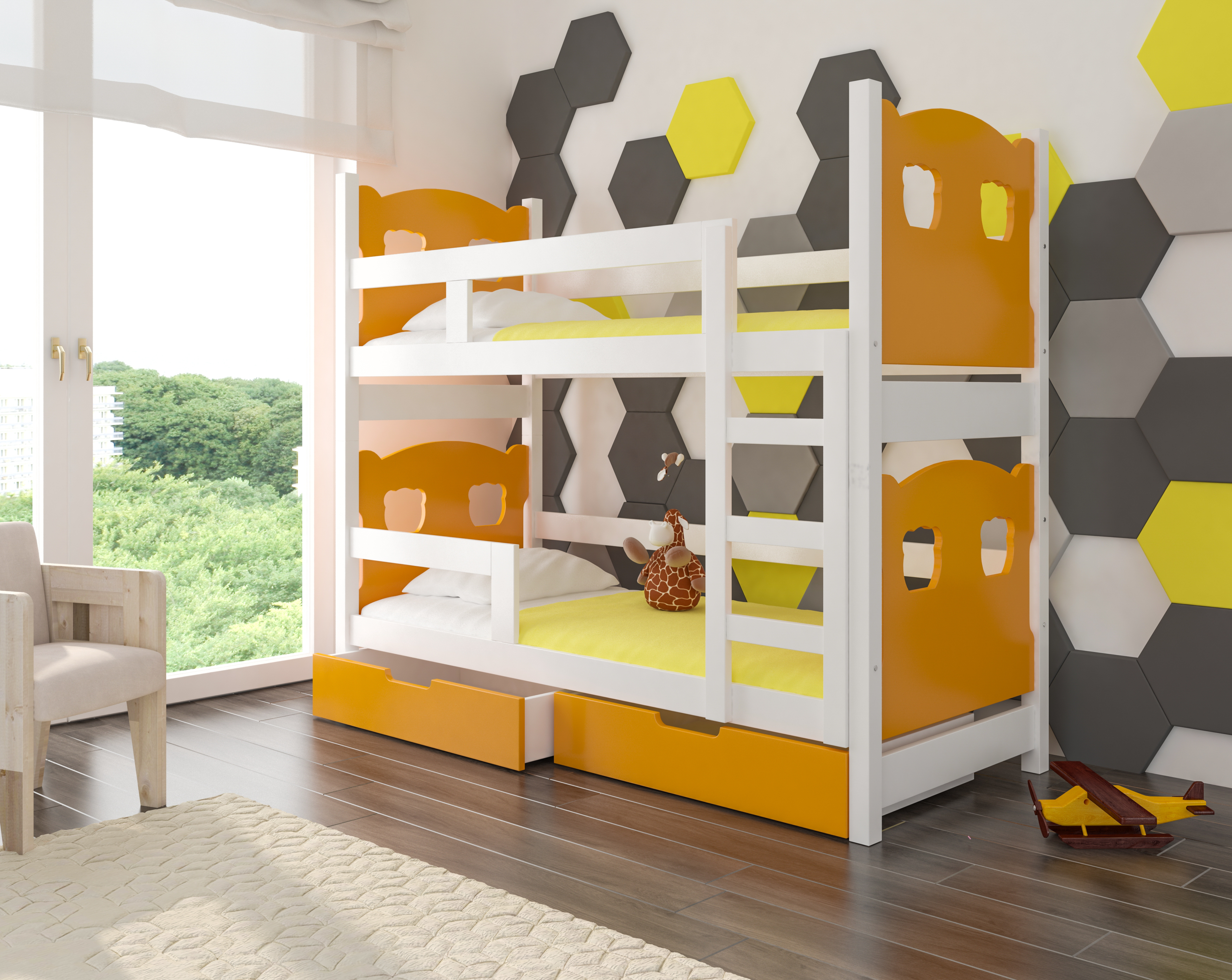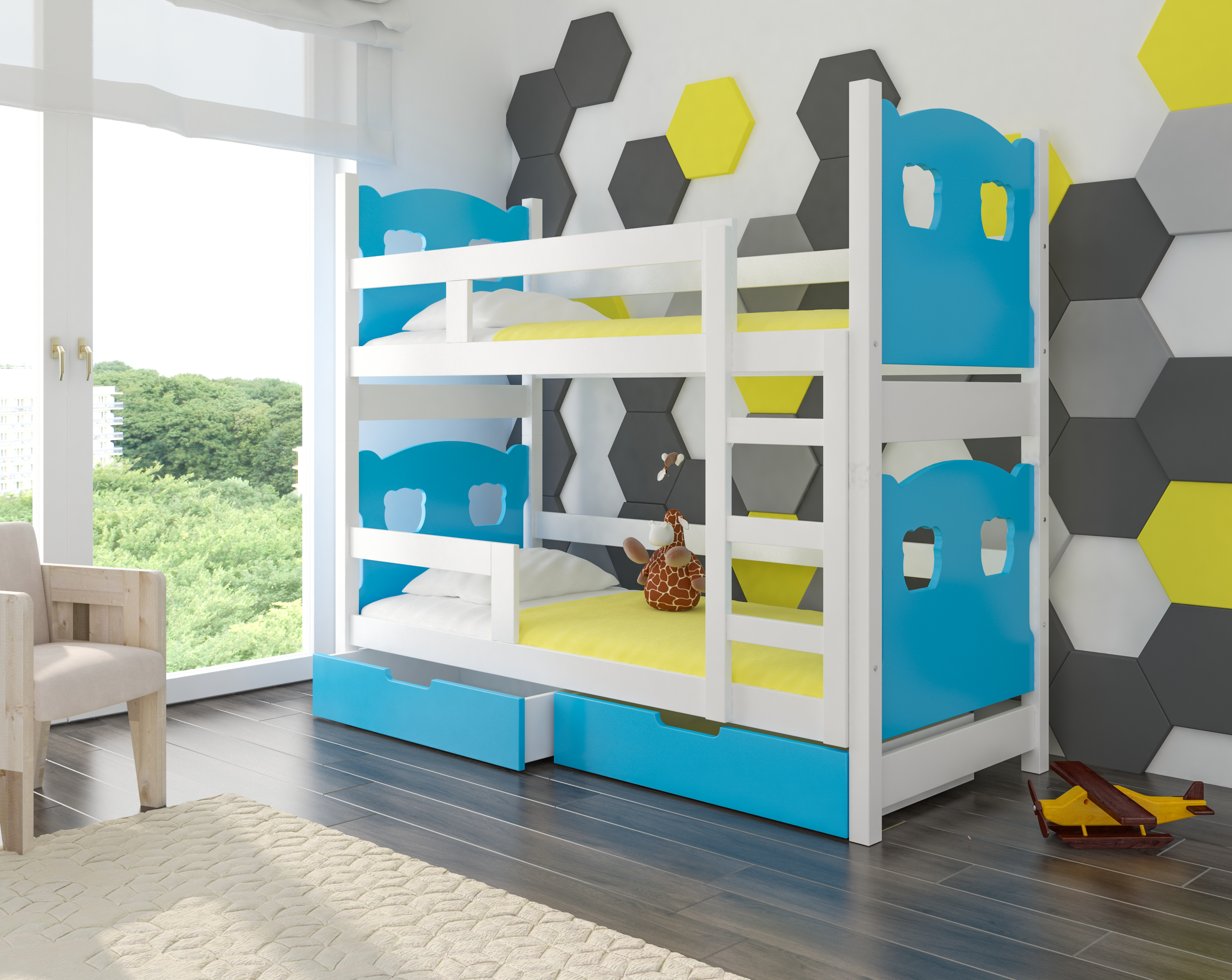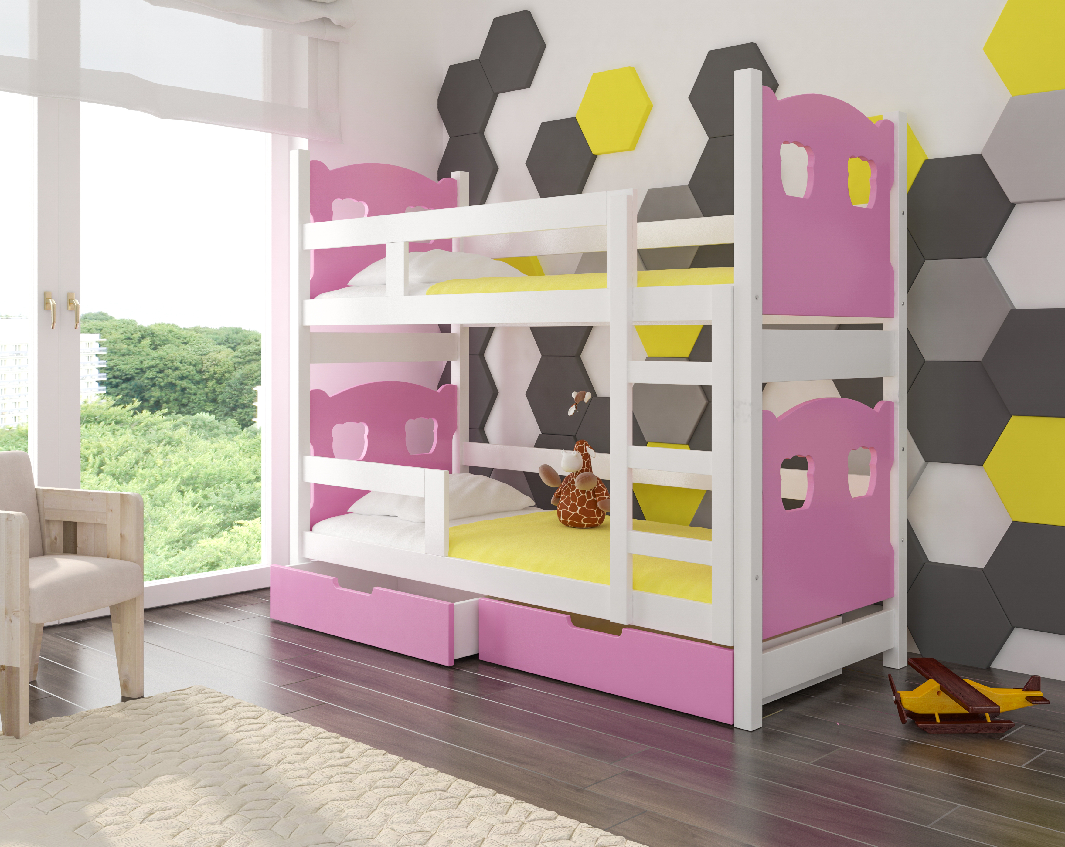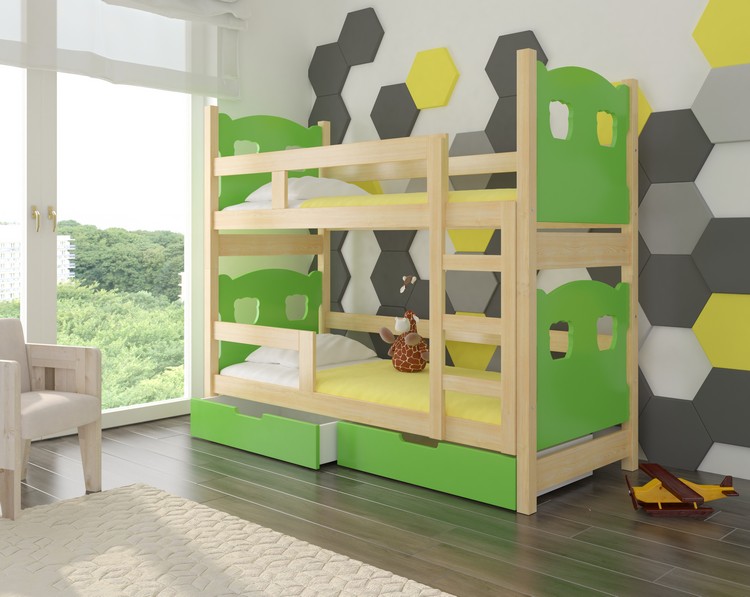 Kompletne 2-poziomowe łóżko wraz z materacami oraz szufladami.