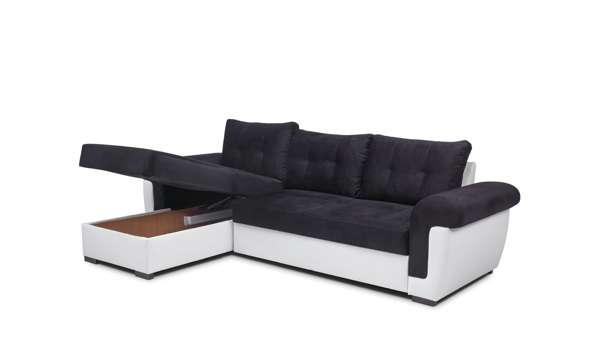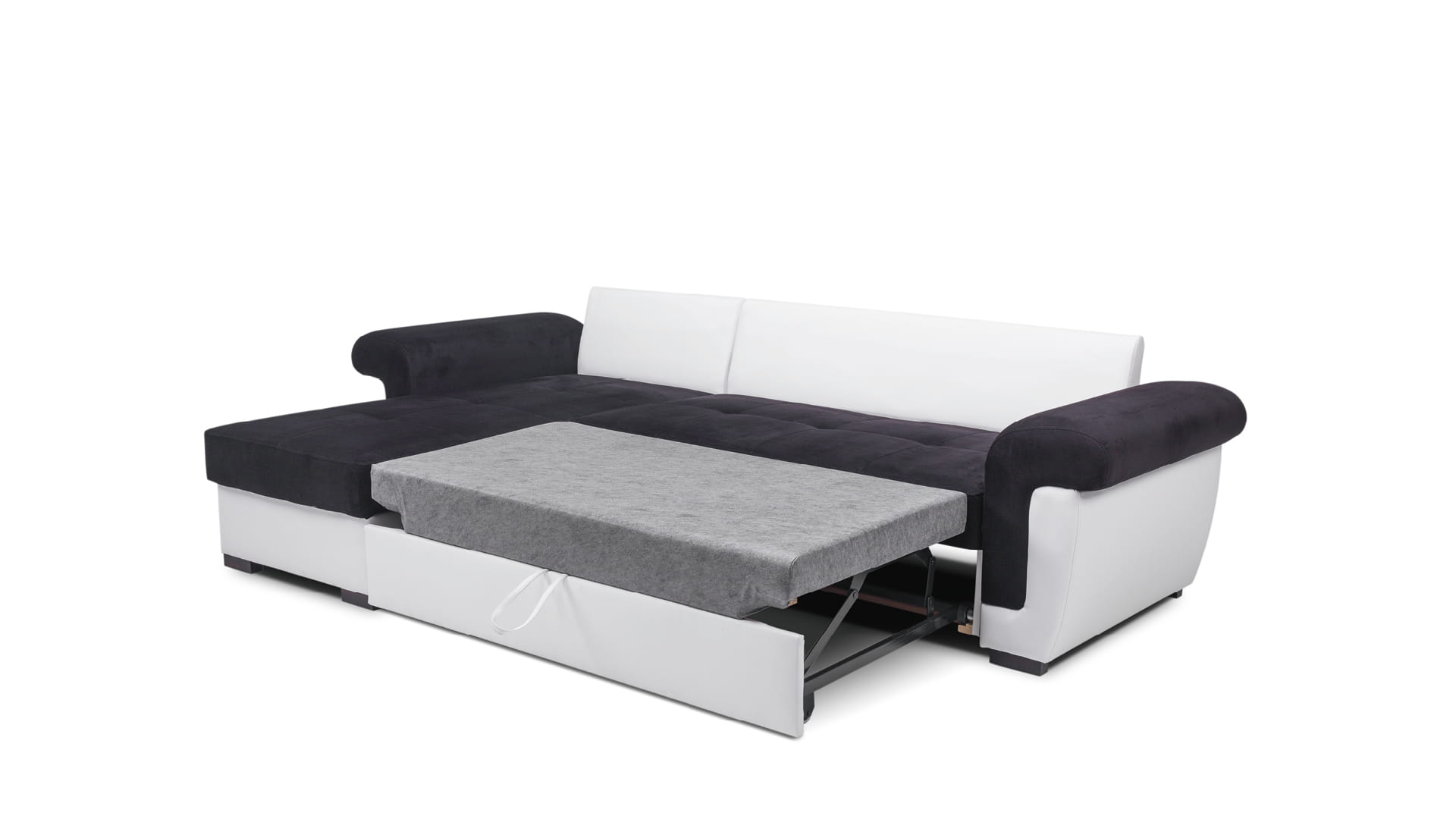 Kolorystyka to mocna strona narożnika MILANO. Zestawienie czerni i bieli sprawia, że mebel od razu zwraca na siebie uwagę. Ale jednakowo ważna jest jego strona użytkowa. To wygodny narożnik przystosowany do wypoczynku zarówno dziennego, jak i nocnego. Lekko rozkładane łóżko oraz pojemnik na pościel pozwalają