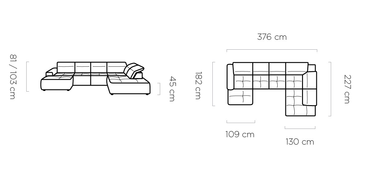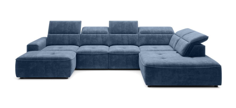 Zaletami tego narożnika są elektrycznie wysuwane siedzisko, przesuwne oparcie, regulowane zagłówki, funkcja spania oraz pojmnik na pościel.