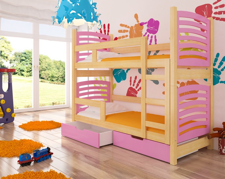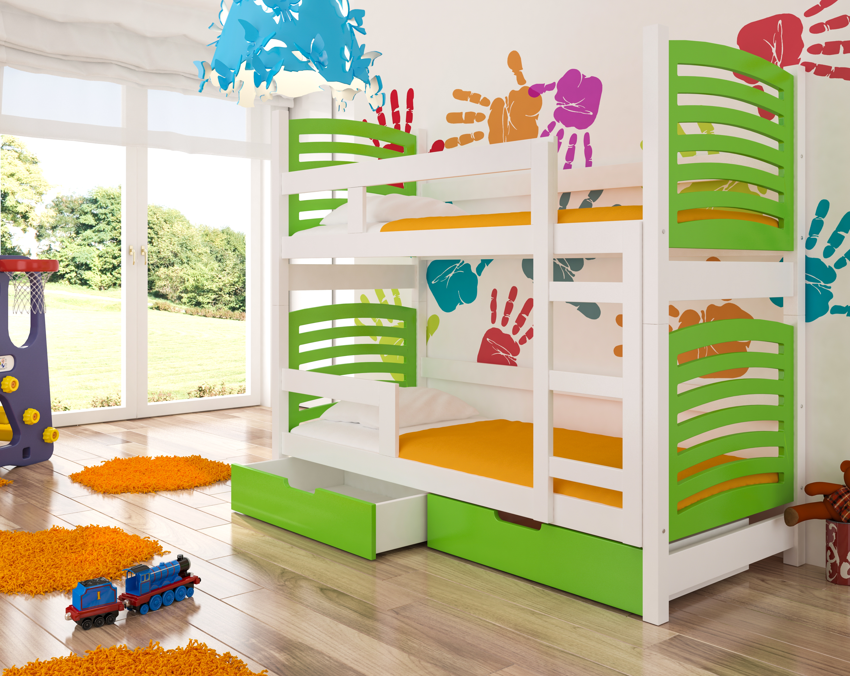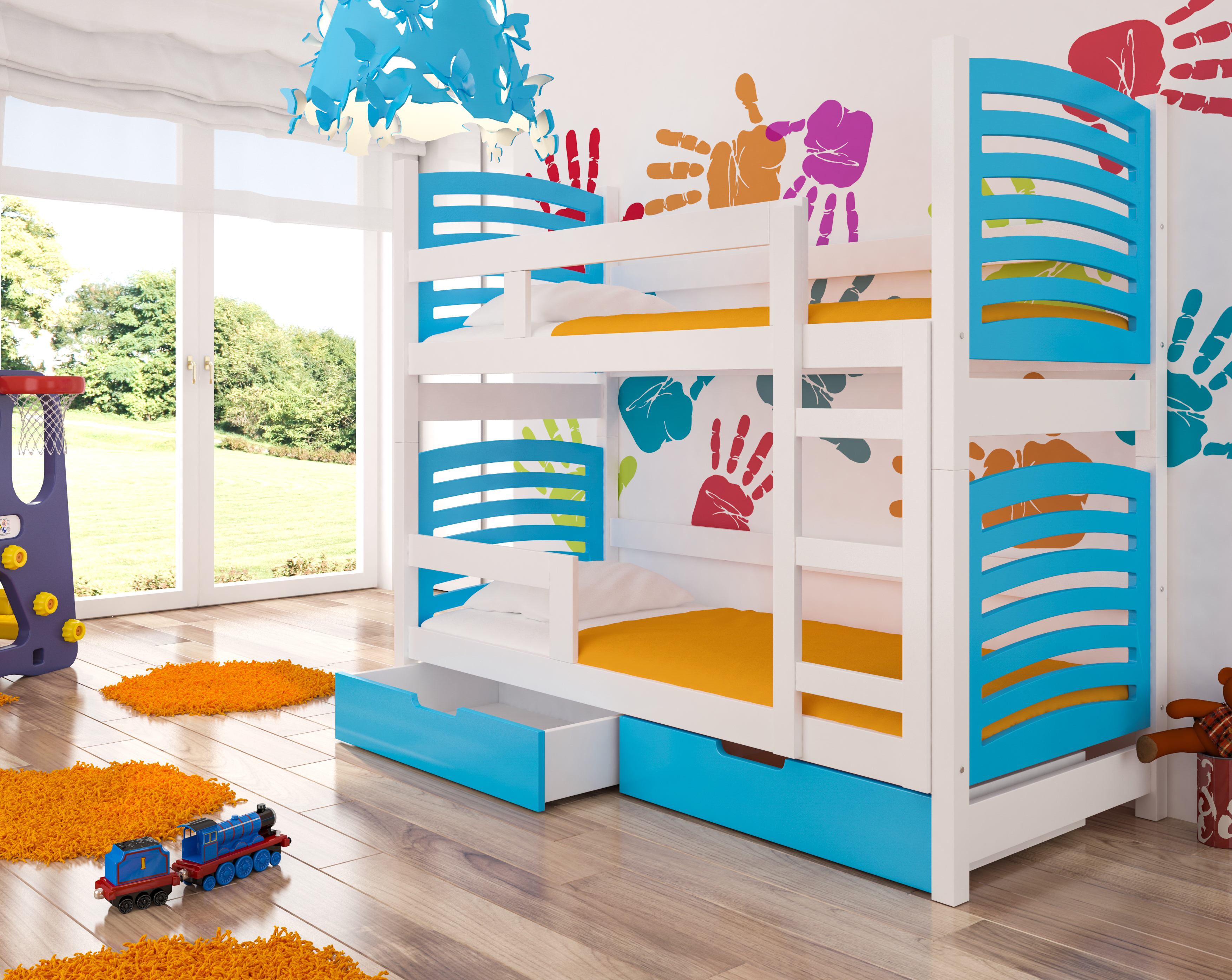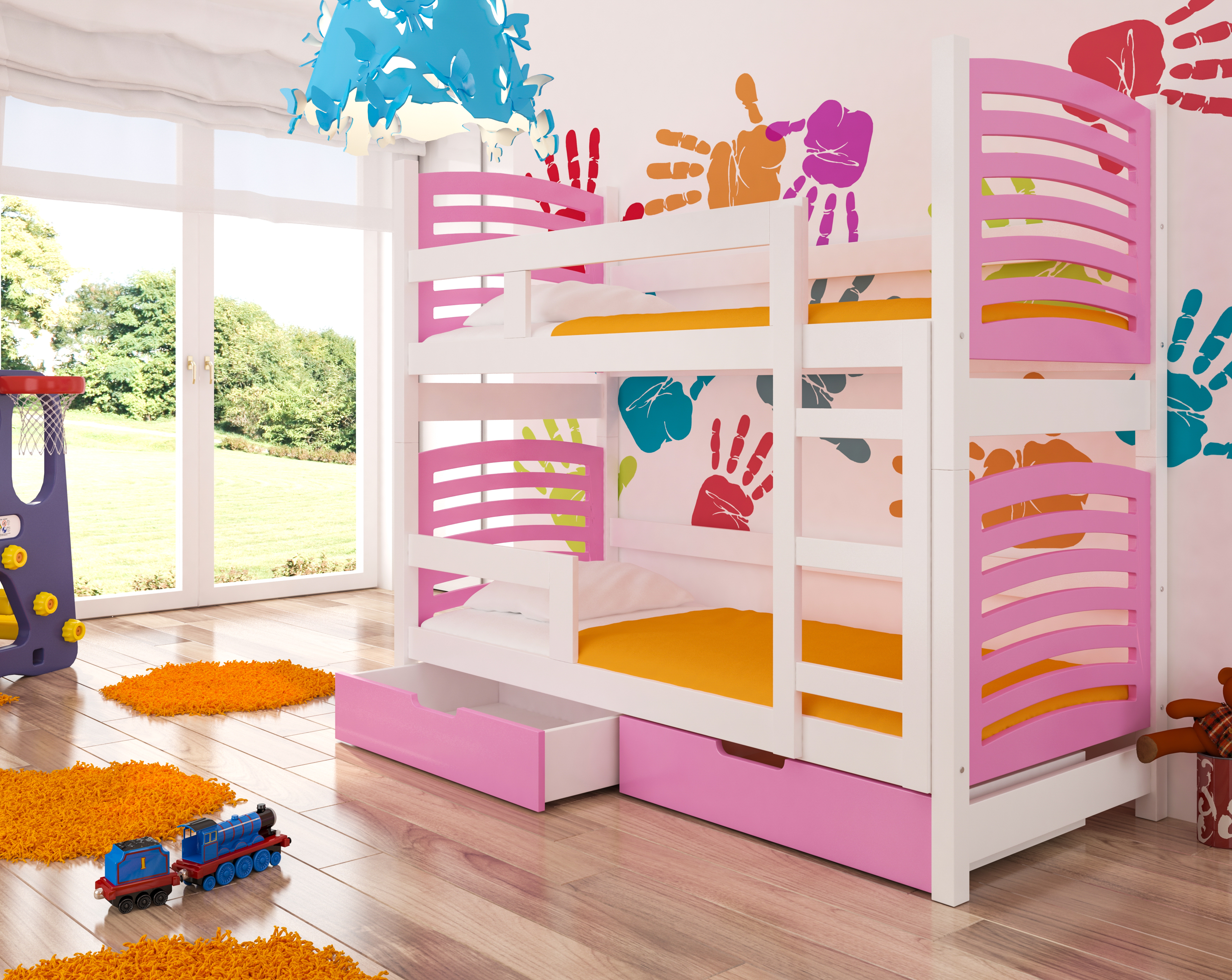 Kompletne 2-poziomowe łóżko wraz z materacami oraz szufladami.