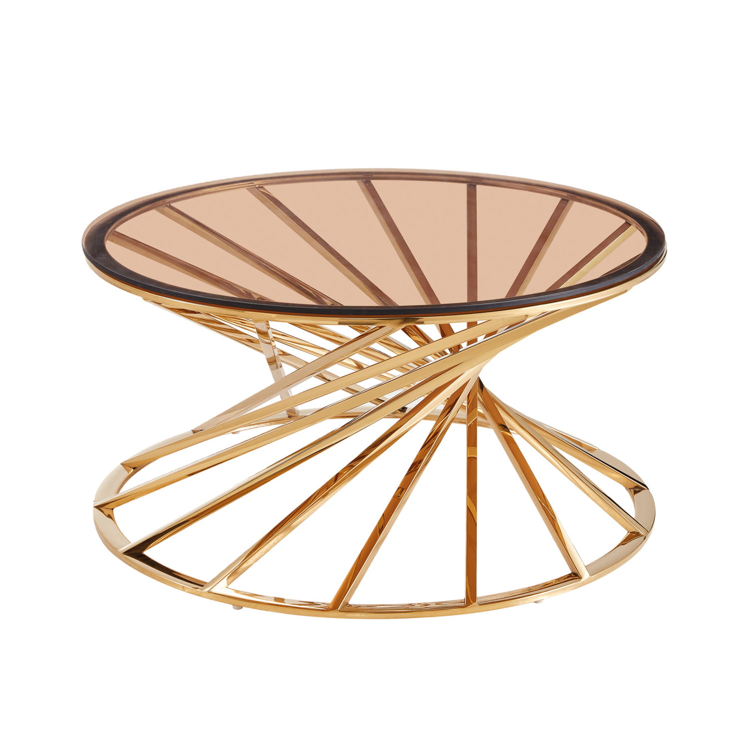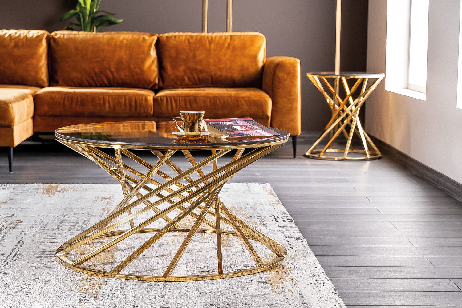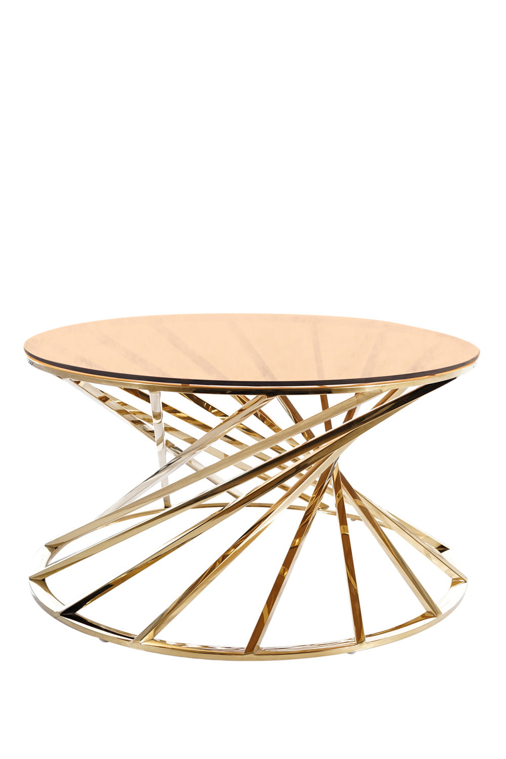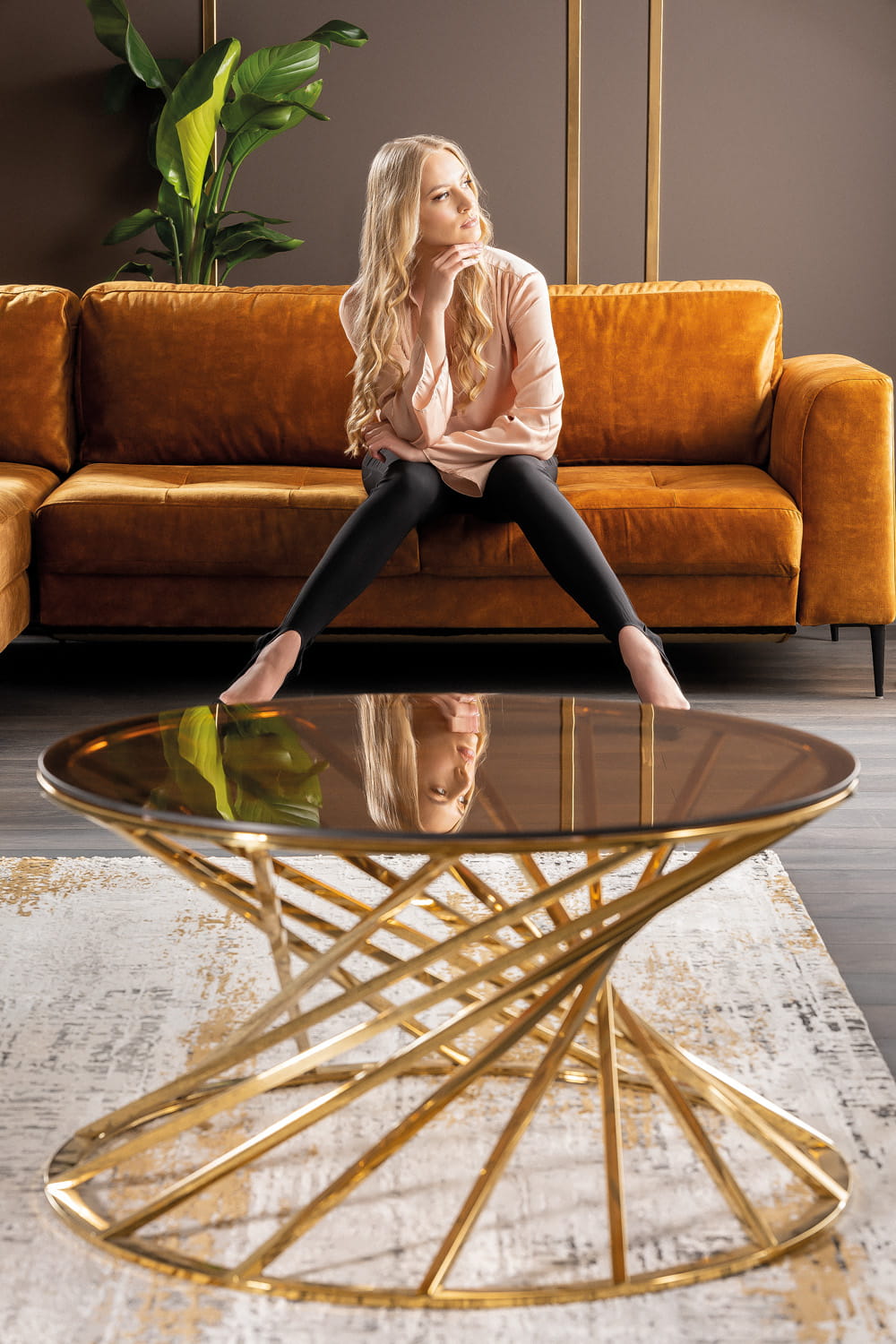 Ława, blat: szkło hartowane bursztynowe, stelaż: stal nierdzewna, kolor: złoty.
