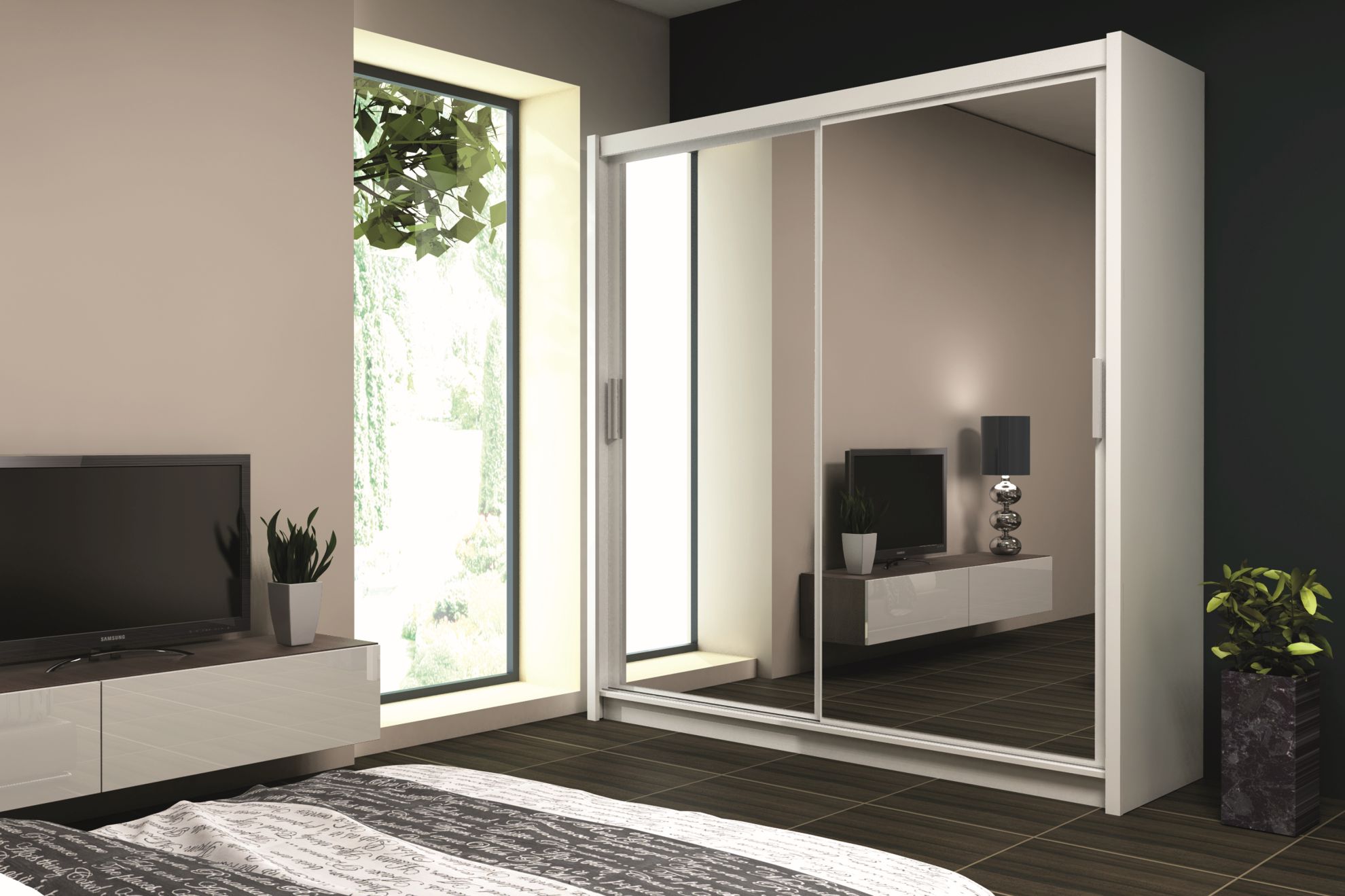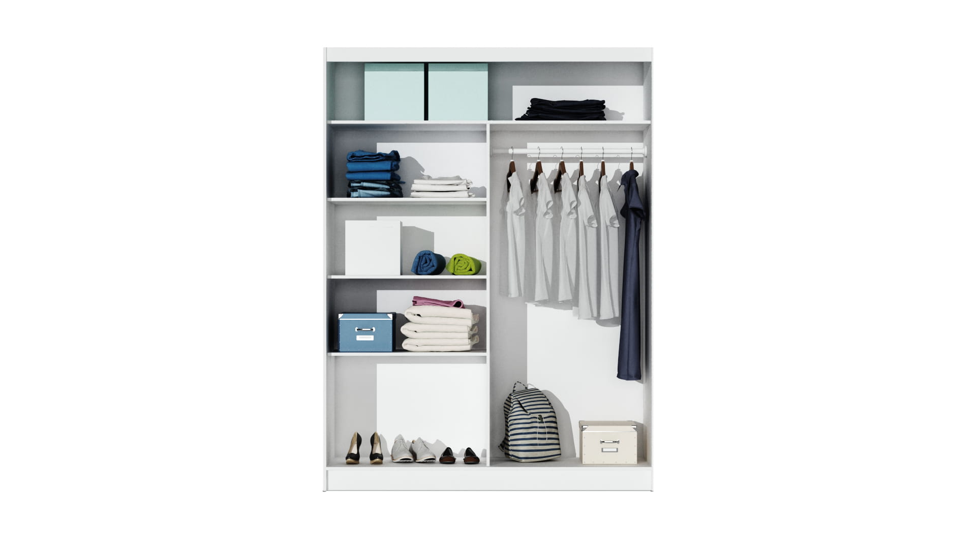 Wyposażenie: aluminiowe prowadnice, dolne wózki na łożyskach, 2 drążki, półki,