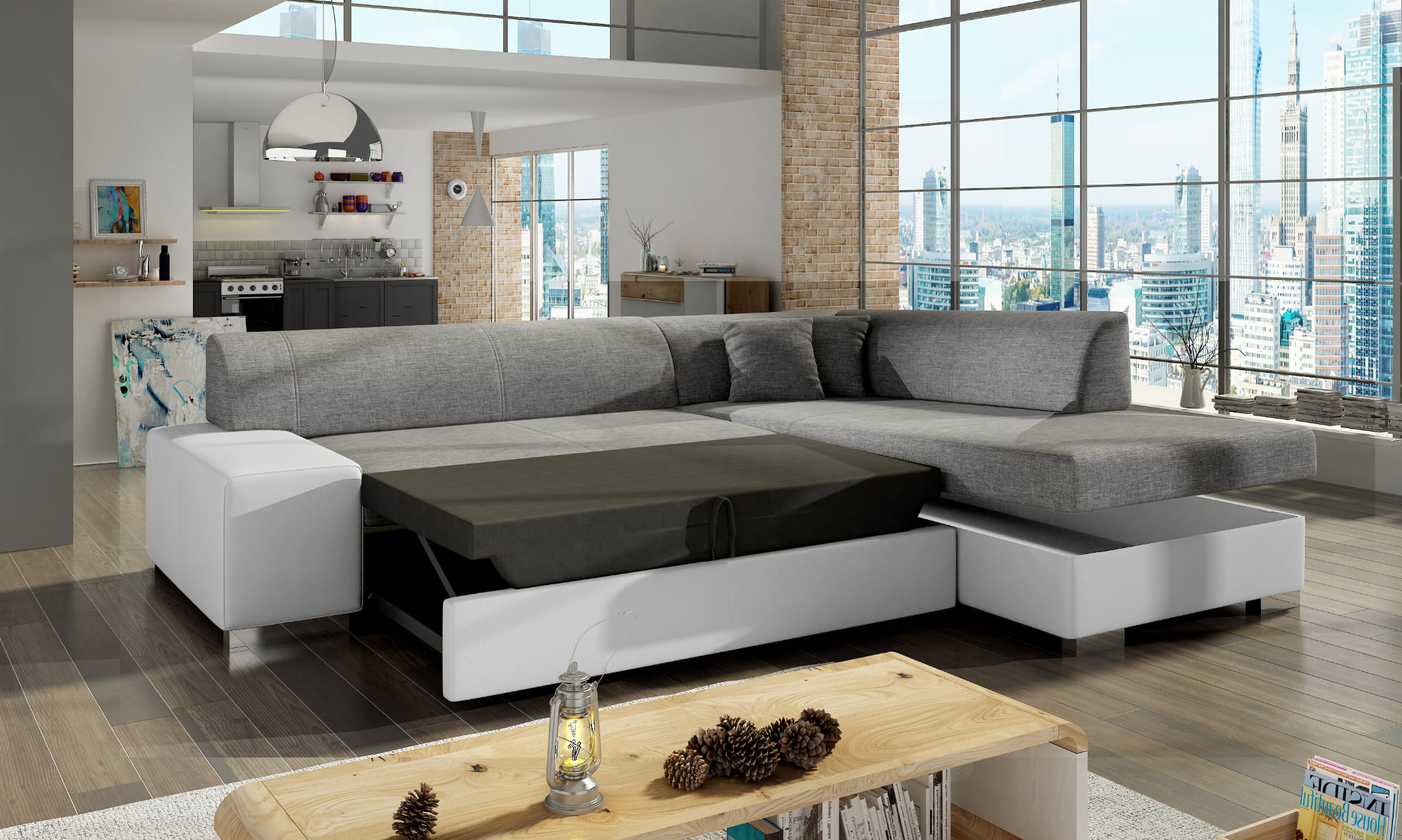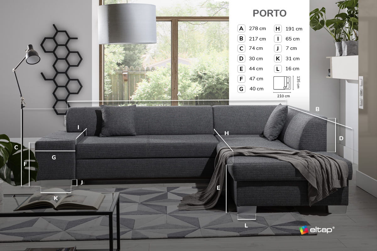 Wymiary narożnika 278x217x74cm umożliwiają swobodny odpoczynek wszystkich domowników z uwzględnieniem sporej przestrzeni dla każdego. Dodatkowo narożnik jest meblem funkcjonalnym, wyposażonym w system rozkładania delfin do pozycji spania. Po zmianie dziennego mebla wypoczynkowego w łóżko użytkownik ma do dyspozycji przestrzeń o wymiarach 210x135cm. Dodatkowym atutem mebla jest schowek na pościel umiejscowiony w otomanie. Dzięki zastosowaniu połączenia sprężyny falistej z pianką T30, siedziska modelu PORTO są wyjątkowo wygodne i odporne na odkształcenia. To spory atut, zwłaszcza jeśli planujemy zakup mebla, który posłuży nam na długo.