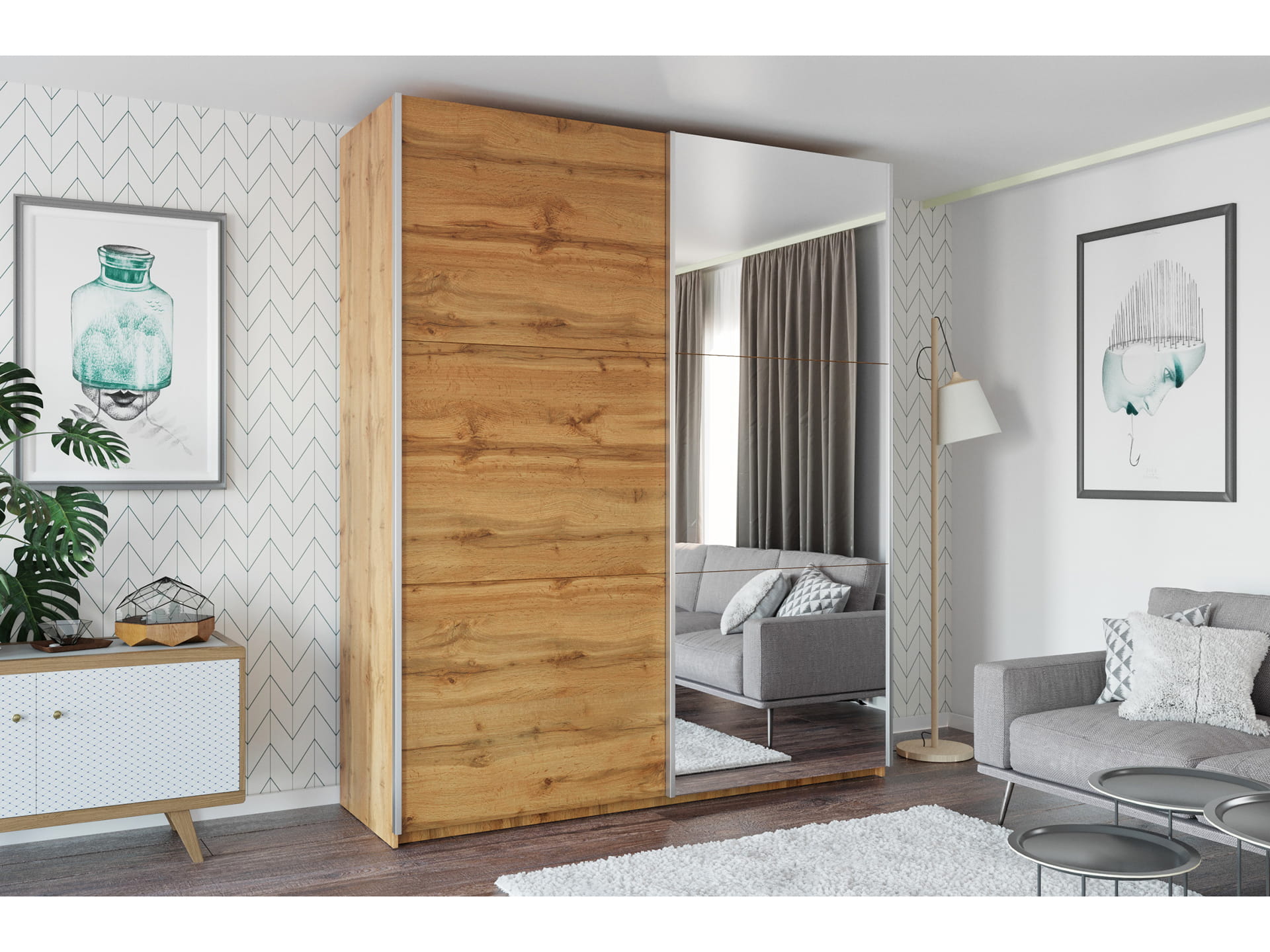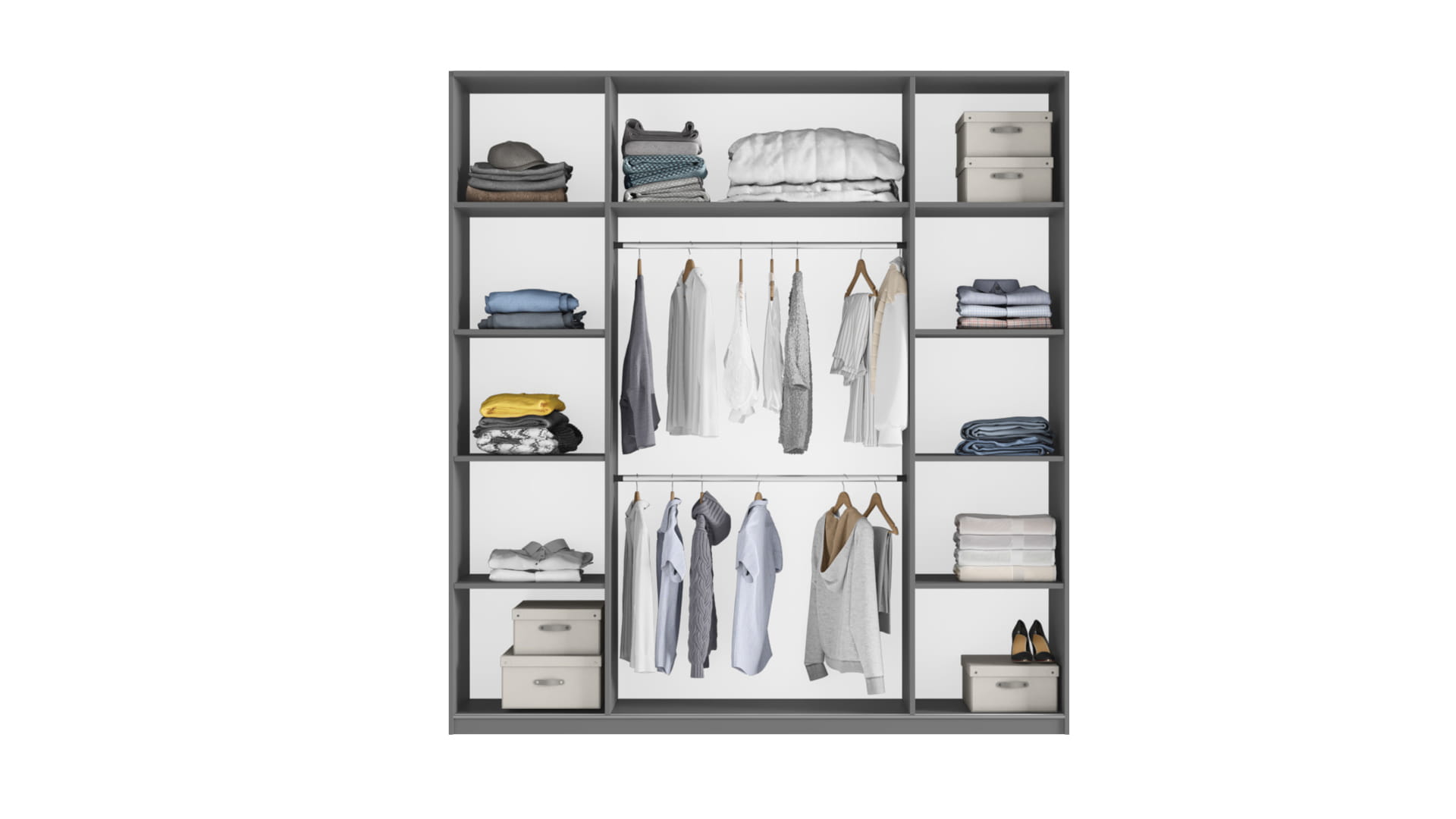 Wyposażenie: drzwi podwieszane na okuciach fi rmy HÄFELE, bezuchwytowe fronty, 2 drążki, półki