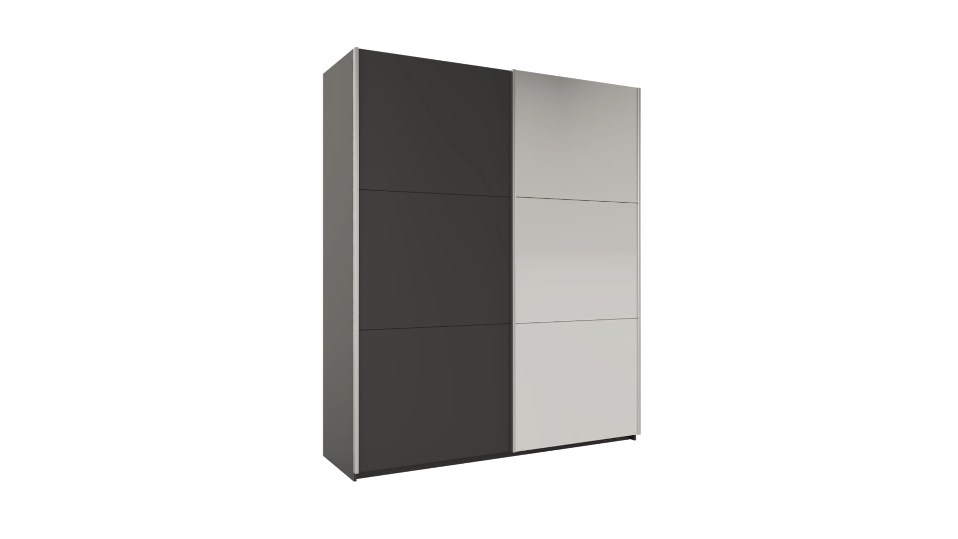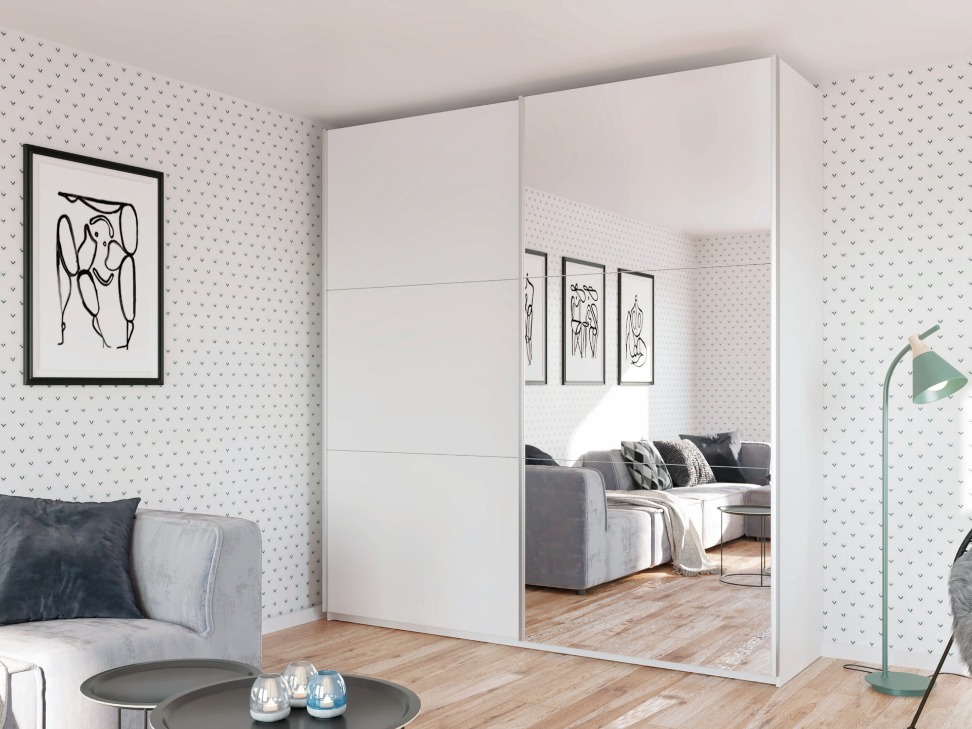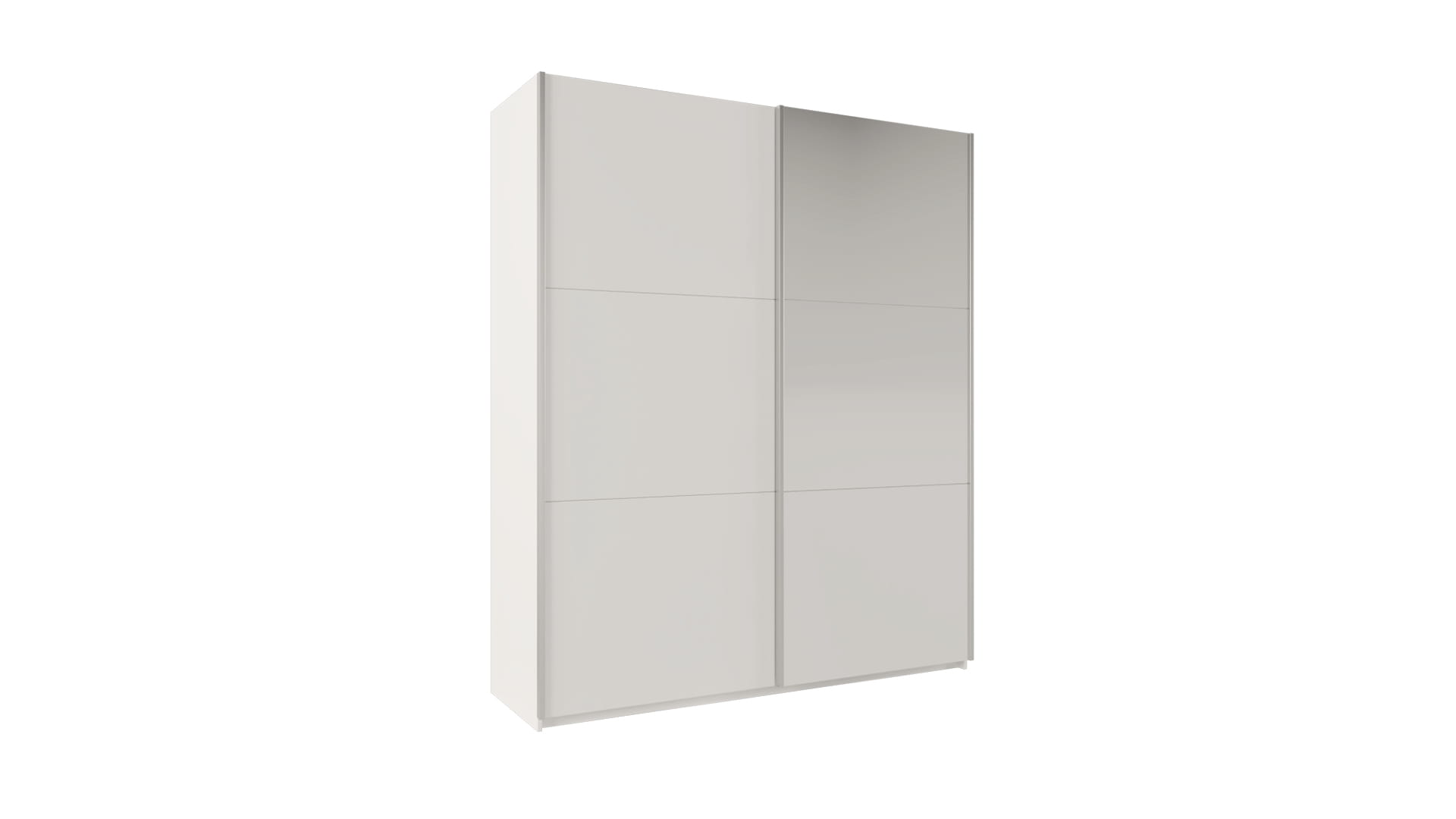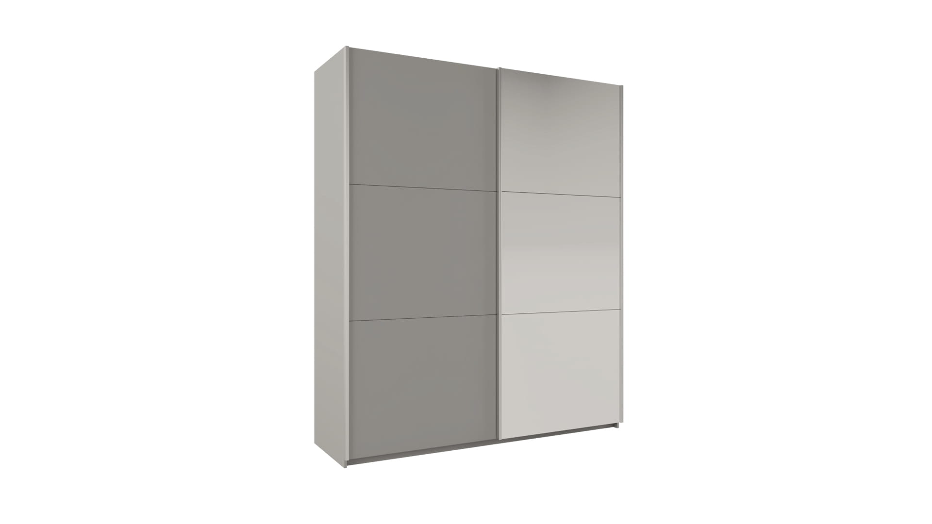 Wyposażenie: drzwi podwieszane na okuciach fi rmy HÄFELE, bezuchwytowe fronty, 2 drążki, półki