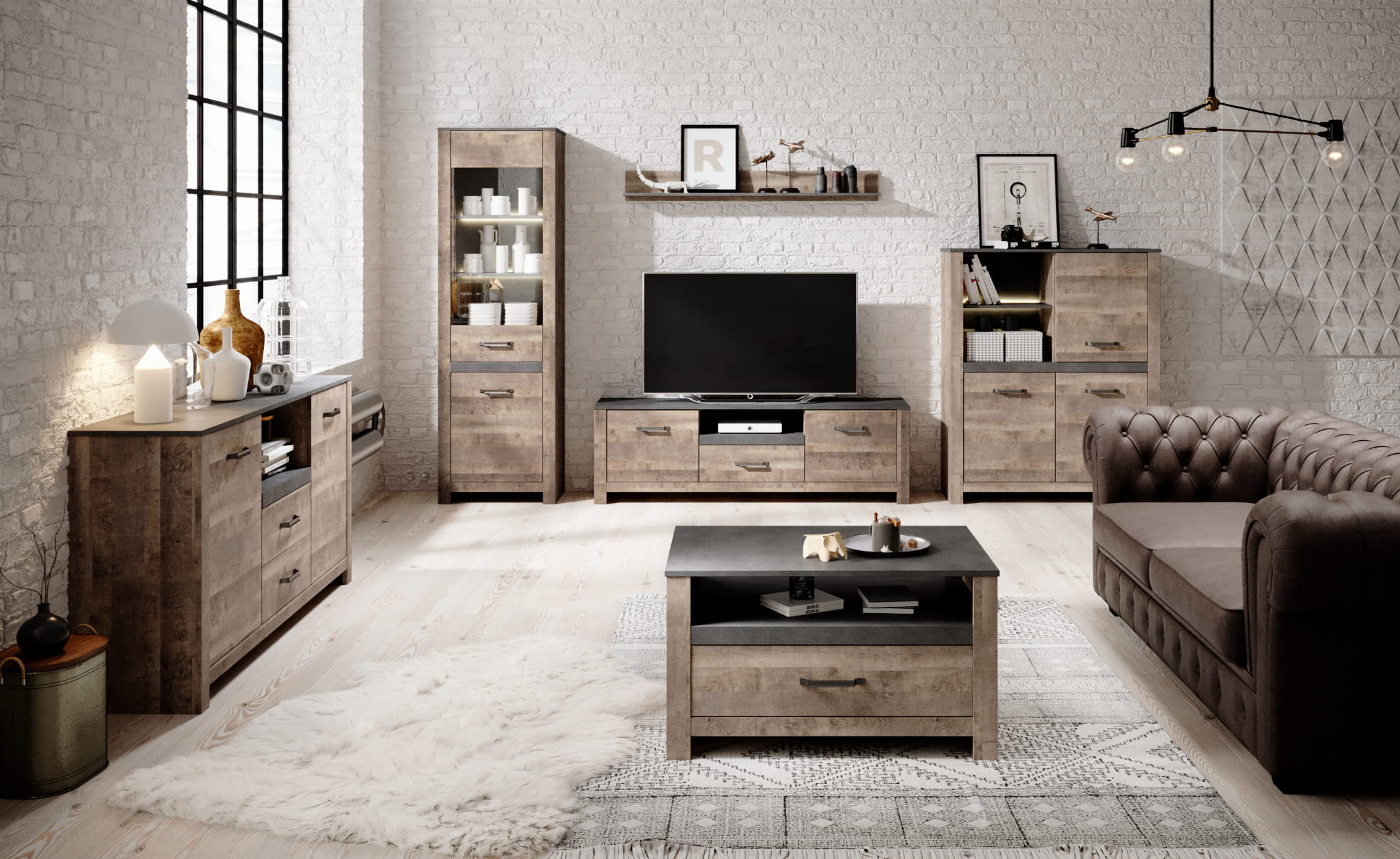 Stylizowane meble kolekcji Sand świetnie sprawdzą się w surowych, loftowych aranżacjach. Masywna konstrukcja brył w kolorze piaskowego dębu podkreślona została materą, imitującą porysowany ciemnoszary metal. Propozycja dla miłośników oryginalnego stylu.
