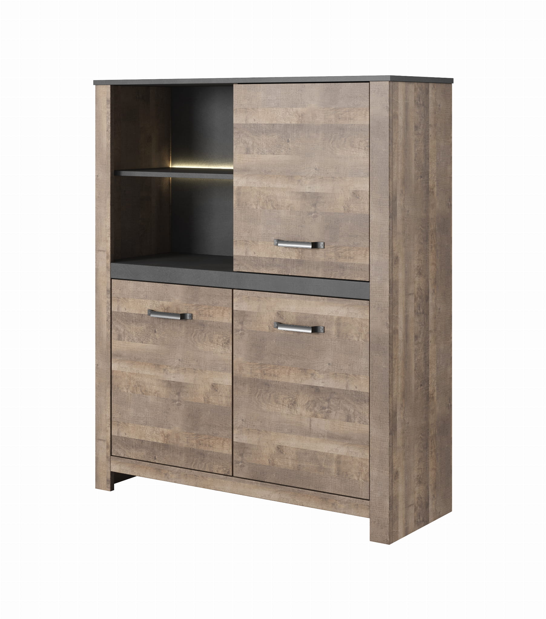 Stylizowane meble kolekcji Sand świetnie sprawdzą się w surowych, loftowych aranżacjach. Masywna konstrukcja brył w kolorze piaskowego dębu podkreślona została materą, imitującą porysowany ciemnoszary metal. Propozycja dla miłośników oryginalnego stylu.