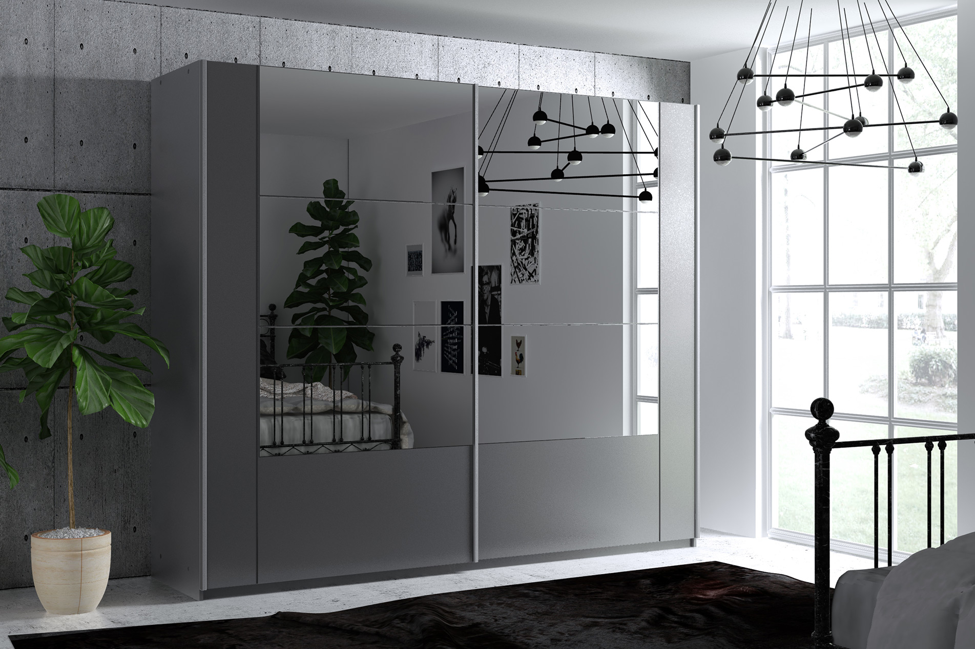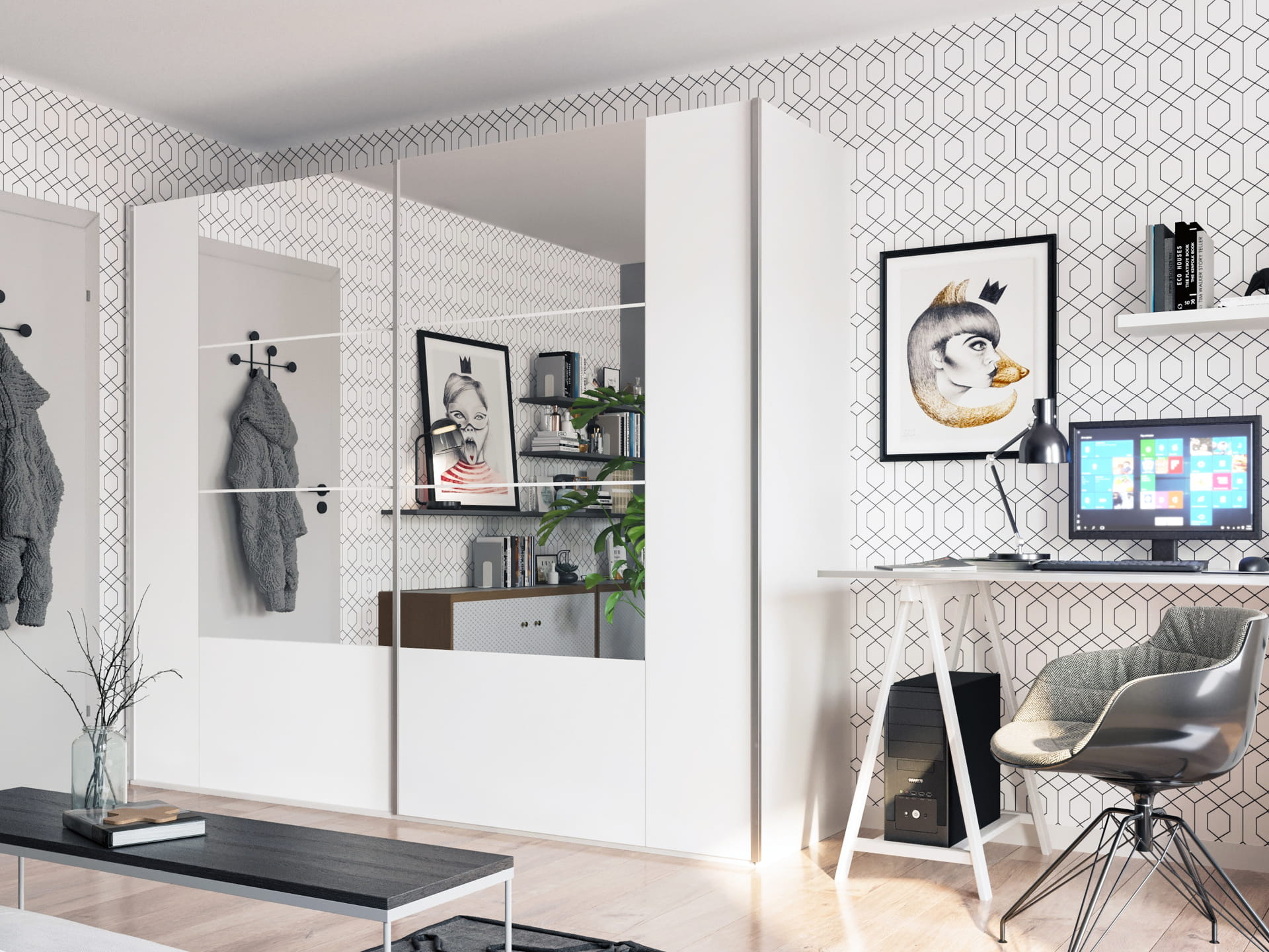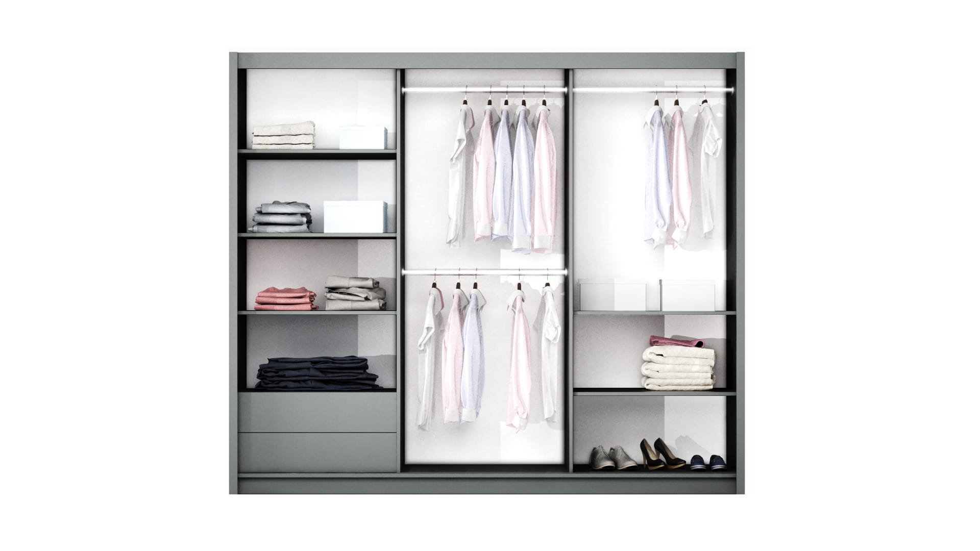 Wyposażenie: drzwi podwieszane na okuciach fi rmy HÄFELE, bezuchwytowe fronty, 3 drążki, półki, 2 szuflady