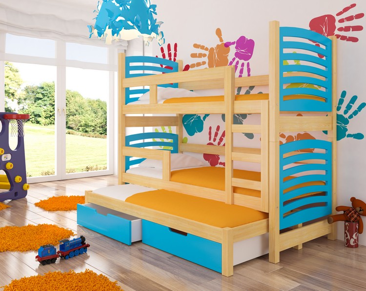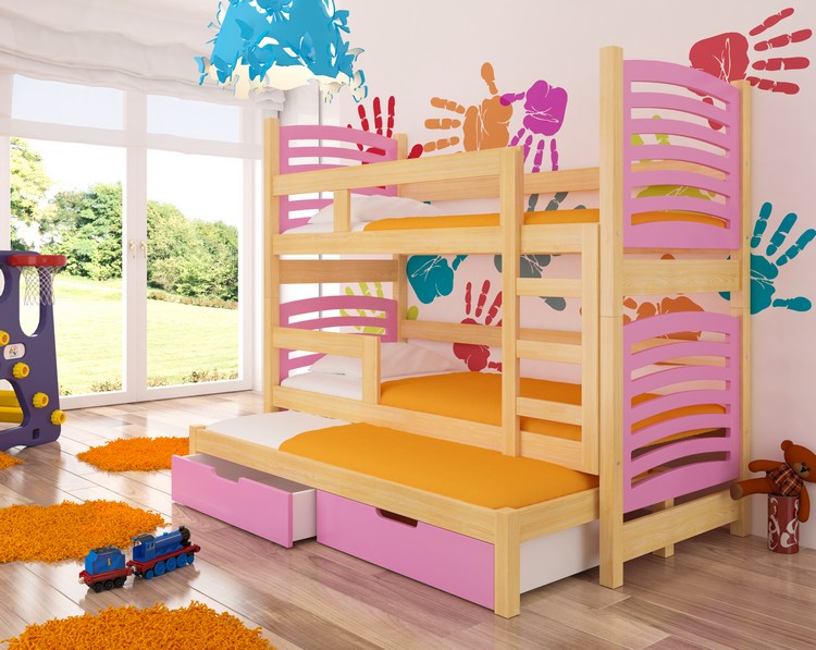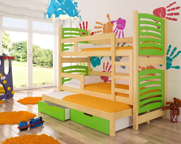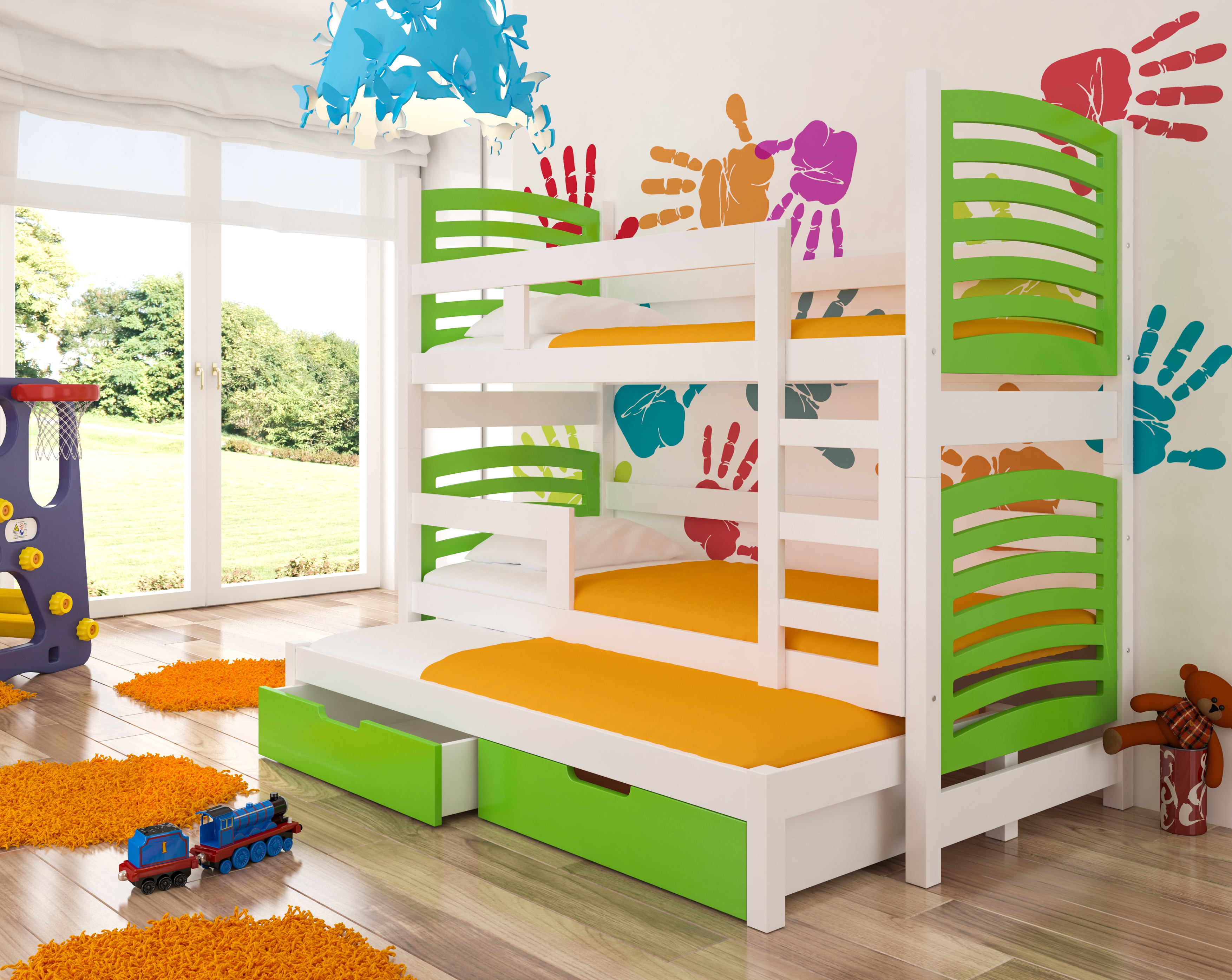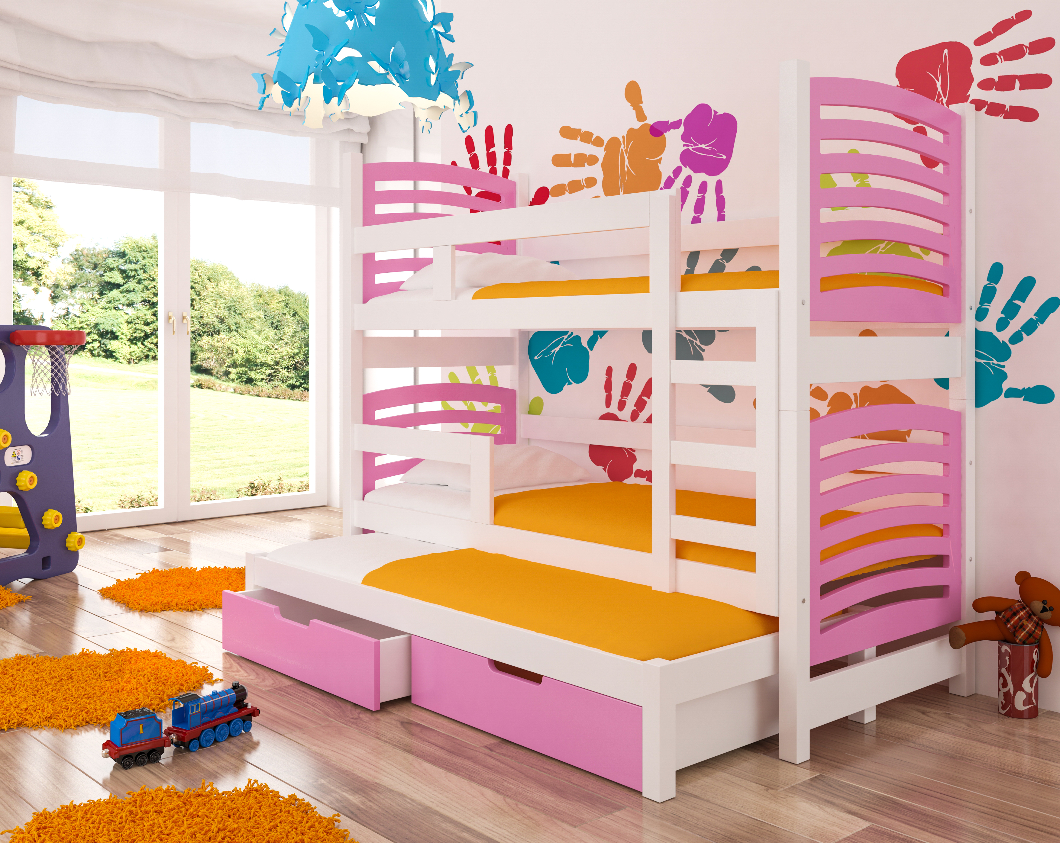 Kompletne 3-poziomowe łóżko wraz z materacami oraz szufladami.