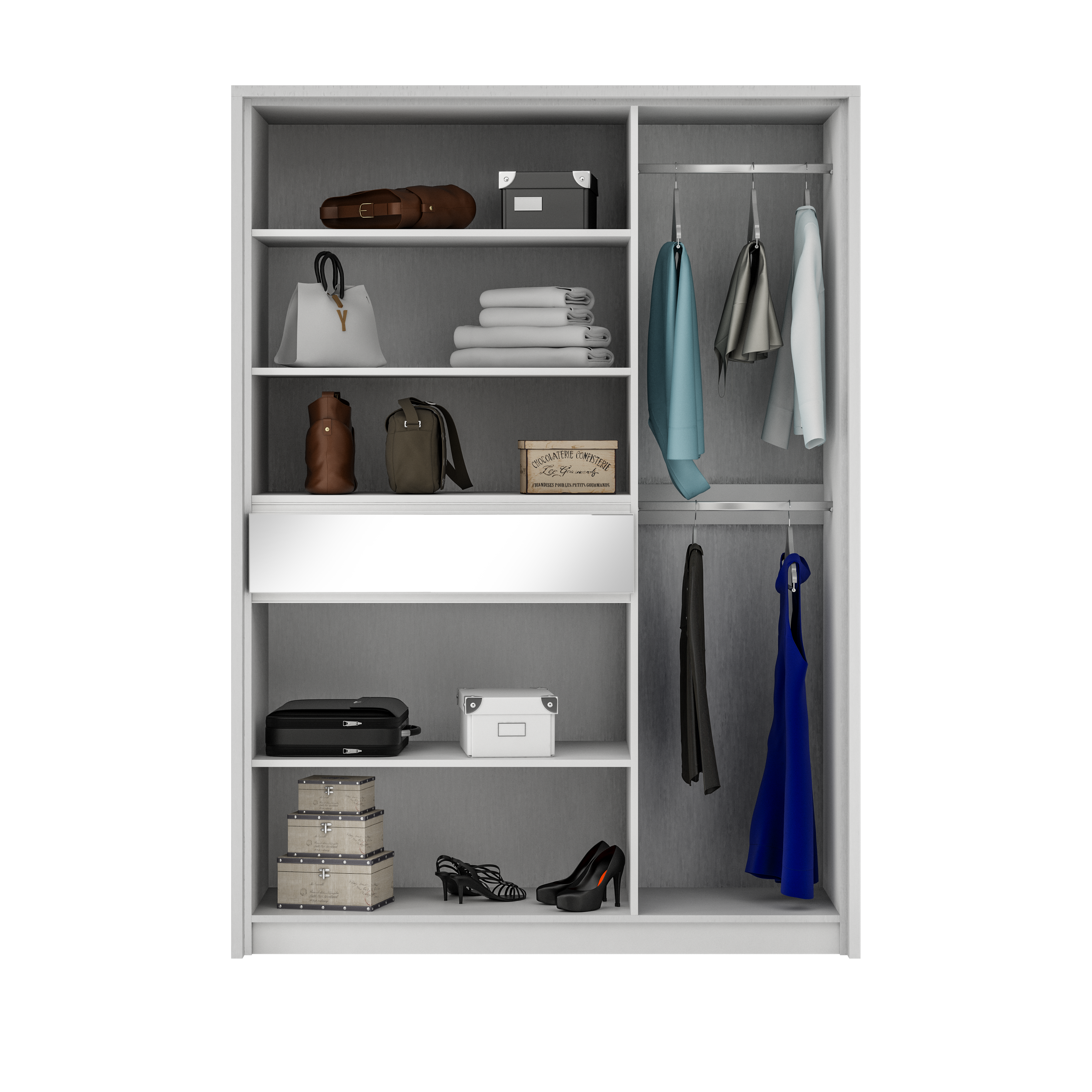 Wyposażenie: 4 drążki, półki, szuflada zewnętrzna