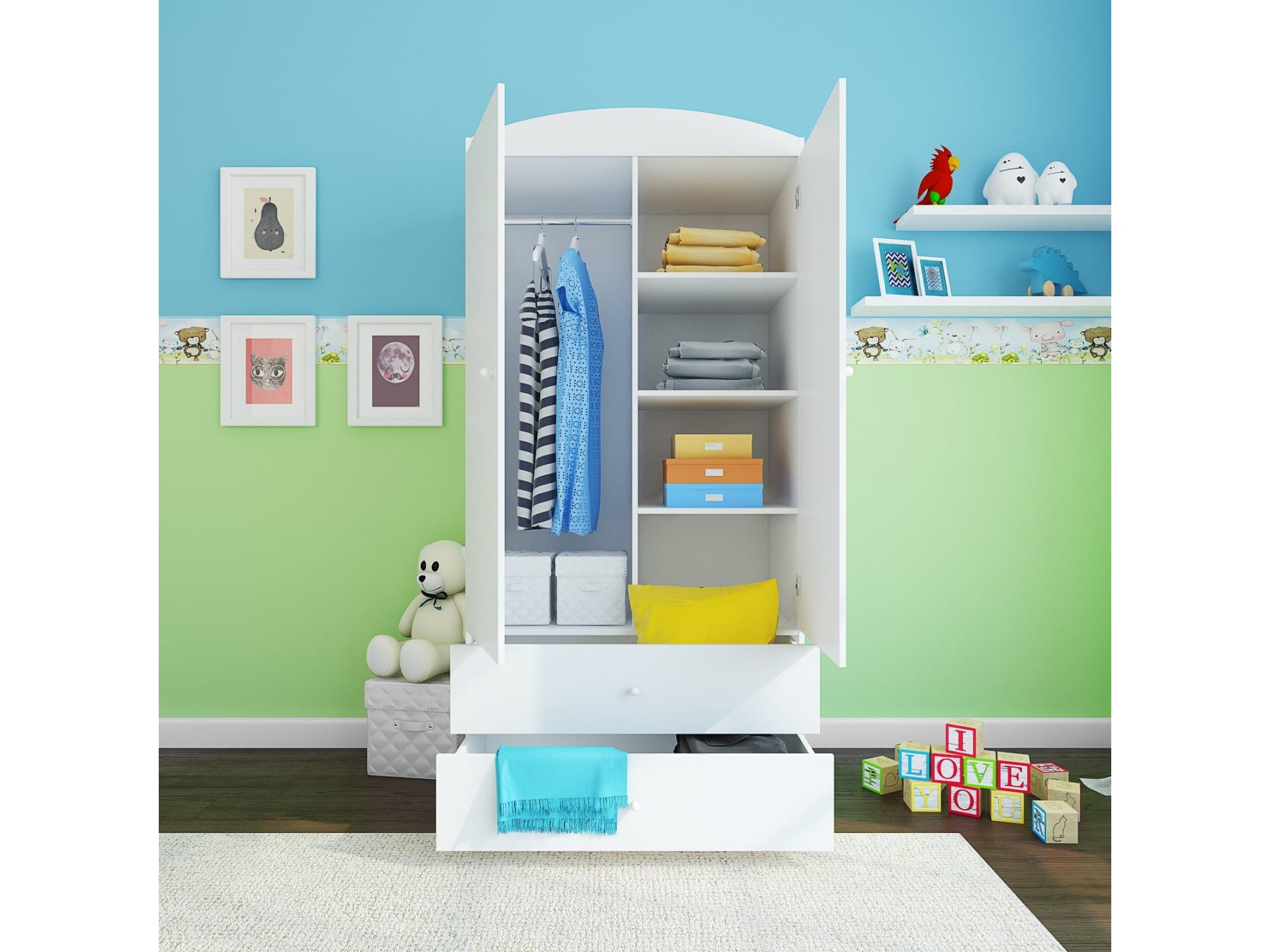 Wewnątrz szafa podzielona jest na dwie części , z których jedna posiada drążek na wieszaki z odzieżą a druga 4 półki (40 x 60 x 30 cm)