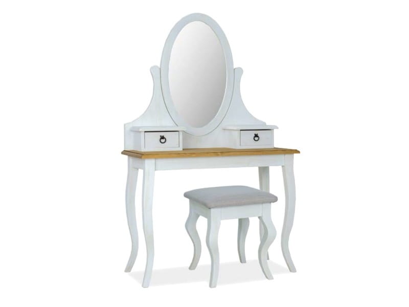 Toaletka ze stołkiem, materiał: drewno sosnowe, kolor: brąz miodowy / sosna patyna, regulowane lustro + 2 szufladki, tapicerowane siedzisko.
