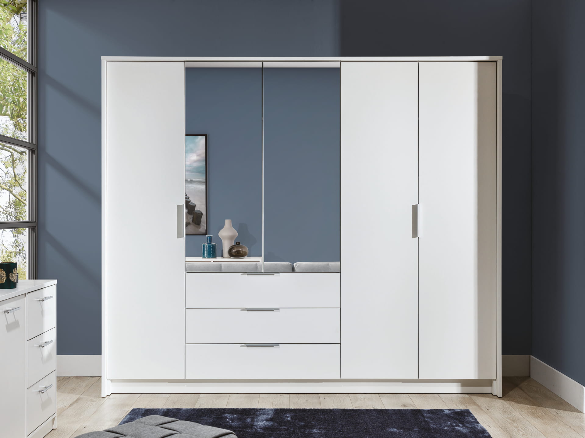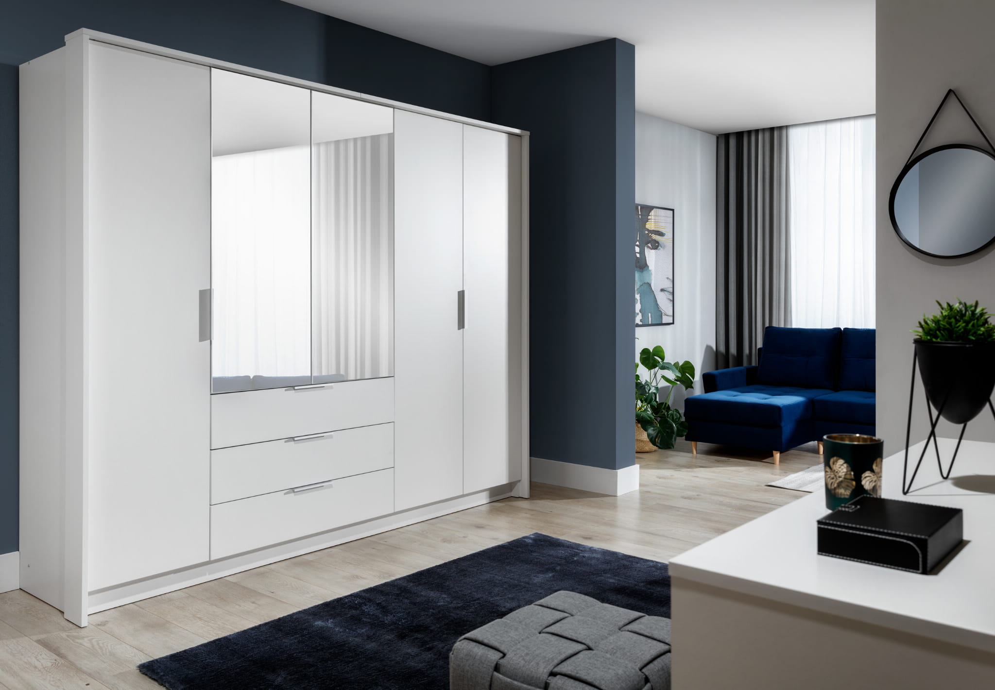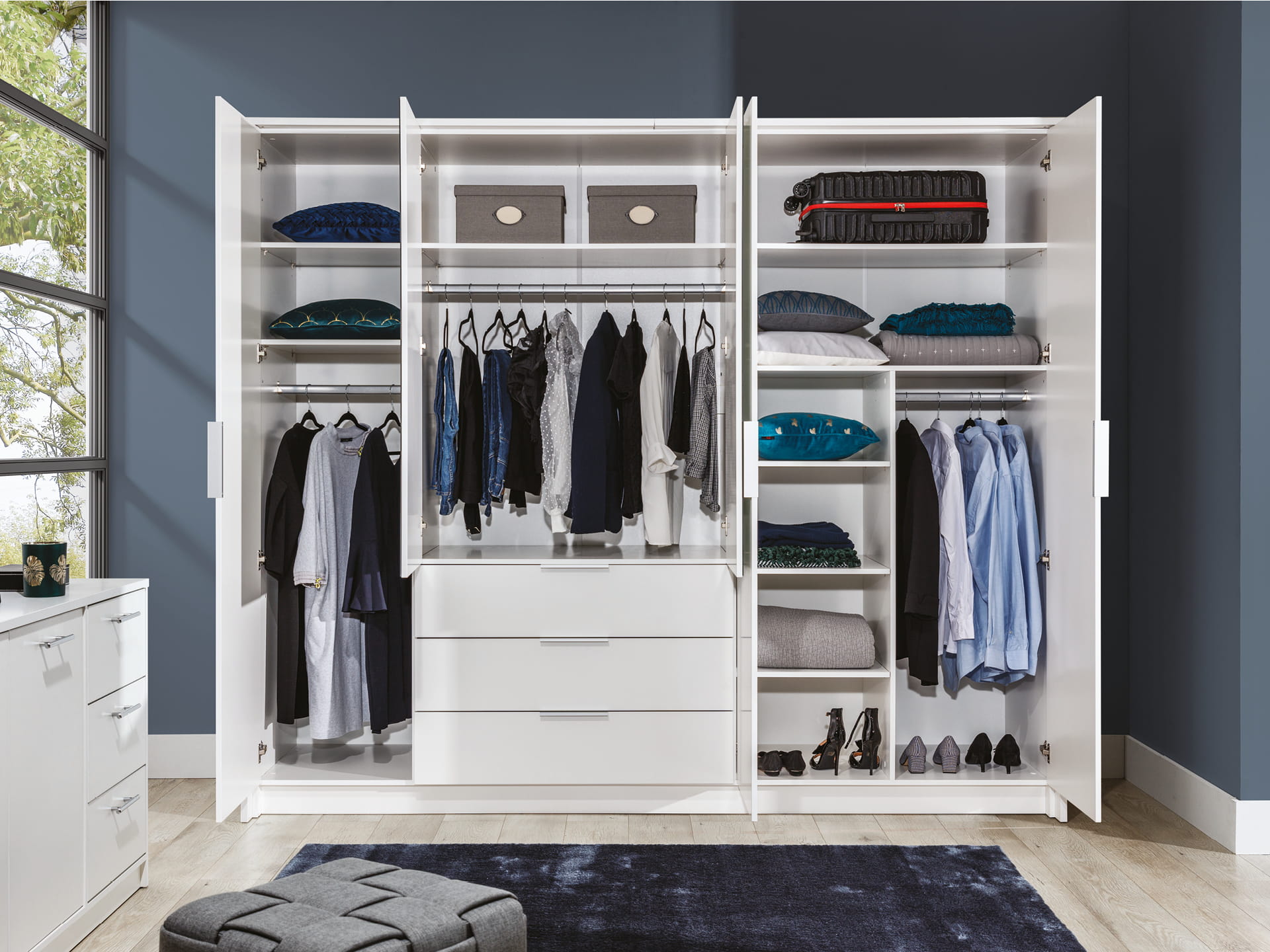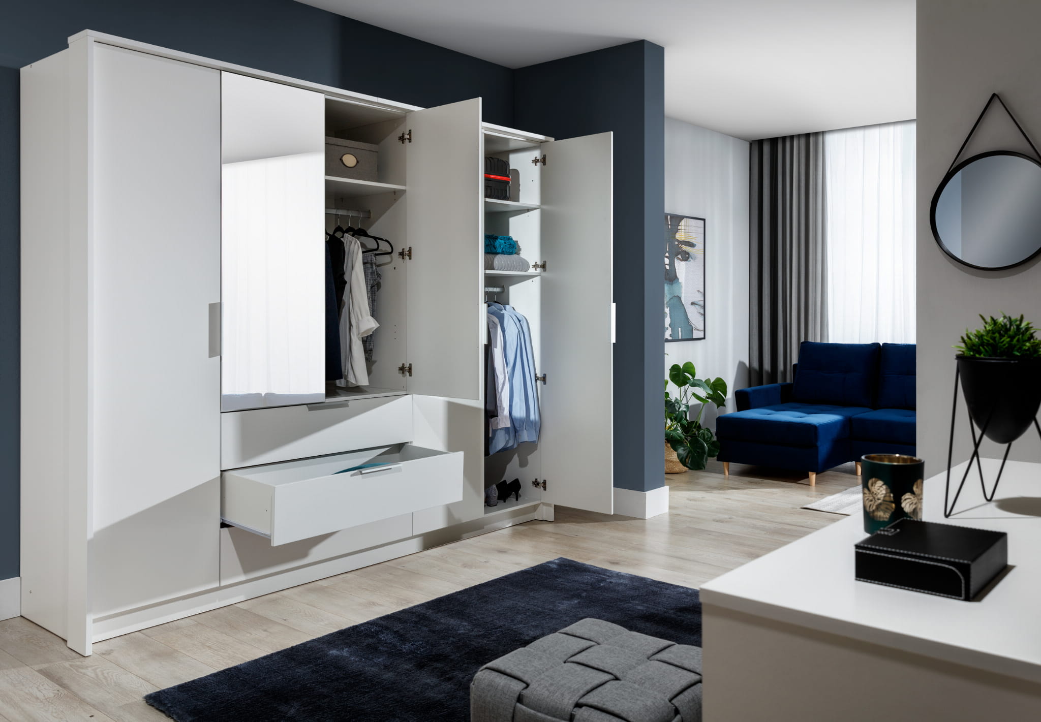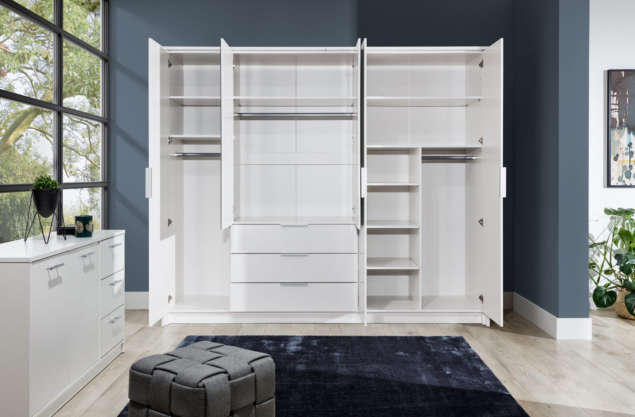 Wyposażenie: drzwi podwieszane na okuciach firmy HETTICH, 3 drążki, 3 szuflady, półki, aluminiowe uchwyty