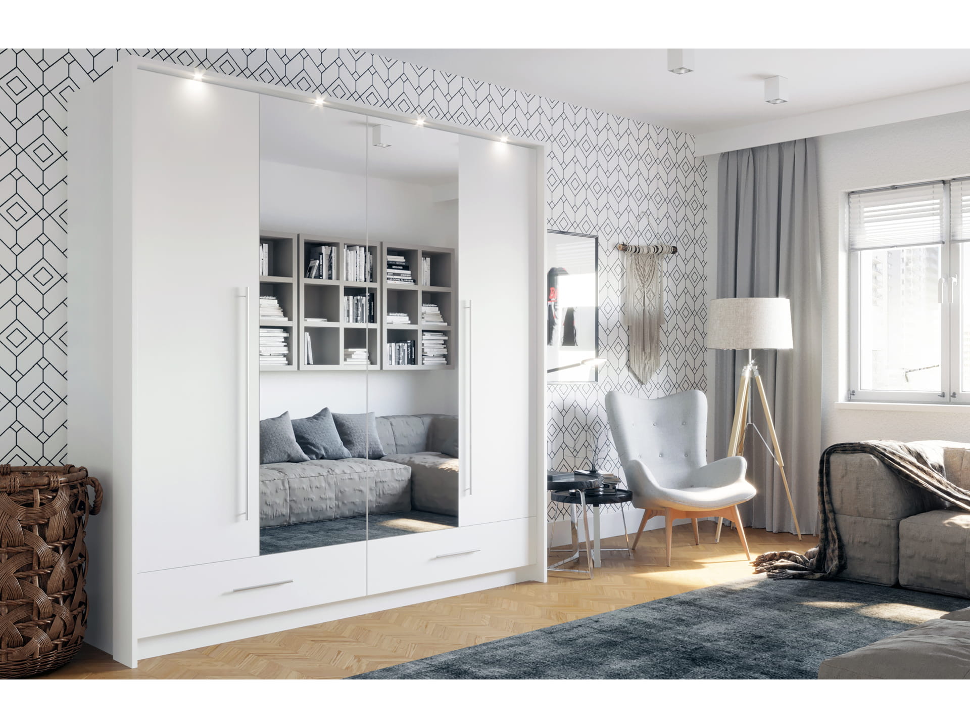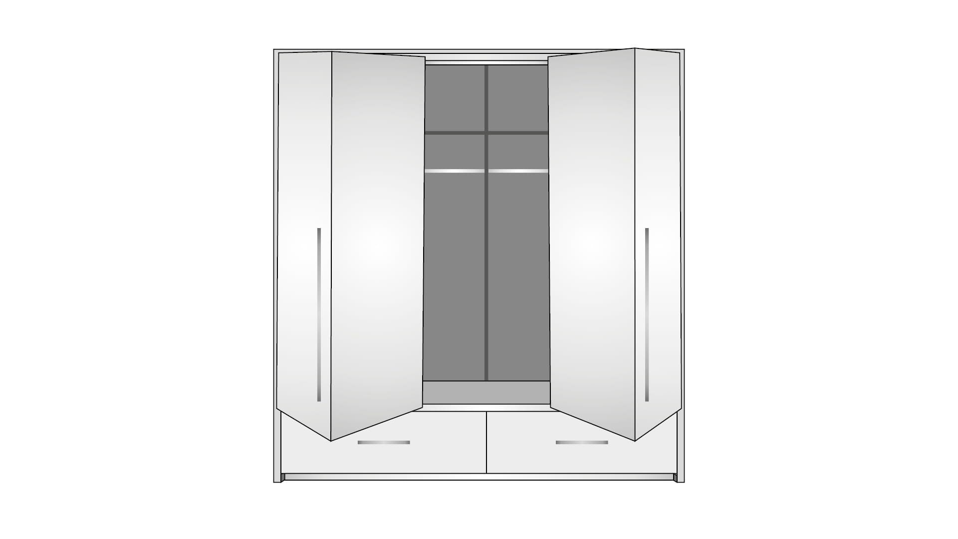 Wyposażenie: drzwi podwieszane na okuciach firmy HETTICH, 2 drążki, półki, 2 szuflady, oświetlenie led